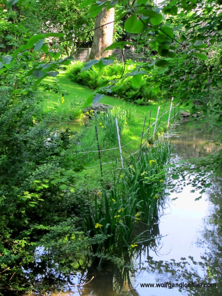 Weiter geht es dann entlang des Nordteils des Englischen Gartens. Hier im Nordteil ist nicht so viel los und ich finde es immer wieder faszinierend, wie schnell man dort vergisst, dass man sich nur ein paar Schritte von einer Millionenstadt befindet. Diese Ruhe, das Grün und die vielen kleinen Bäche, die den Park durchziehen – Ein kleines Paradies. Auf dem Weg zur Isar fährt man aber auch durch Wohngebiete mit kleinen Einfamilienhäusern und Gärten. Diesen hier fand ich besonders schön. So würde ich auch gern wohnen. Stattdessen blicke ich von unserer Dachterrasse auf das BMW-Werk. Immerhin sehen wir aber auch noch einen Teil des Olympiastadions und den Berg im Olympiapark.