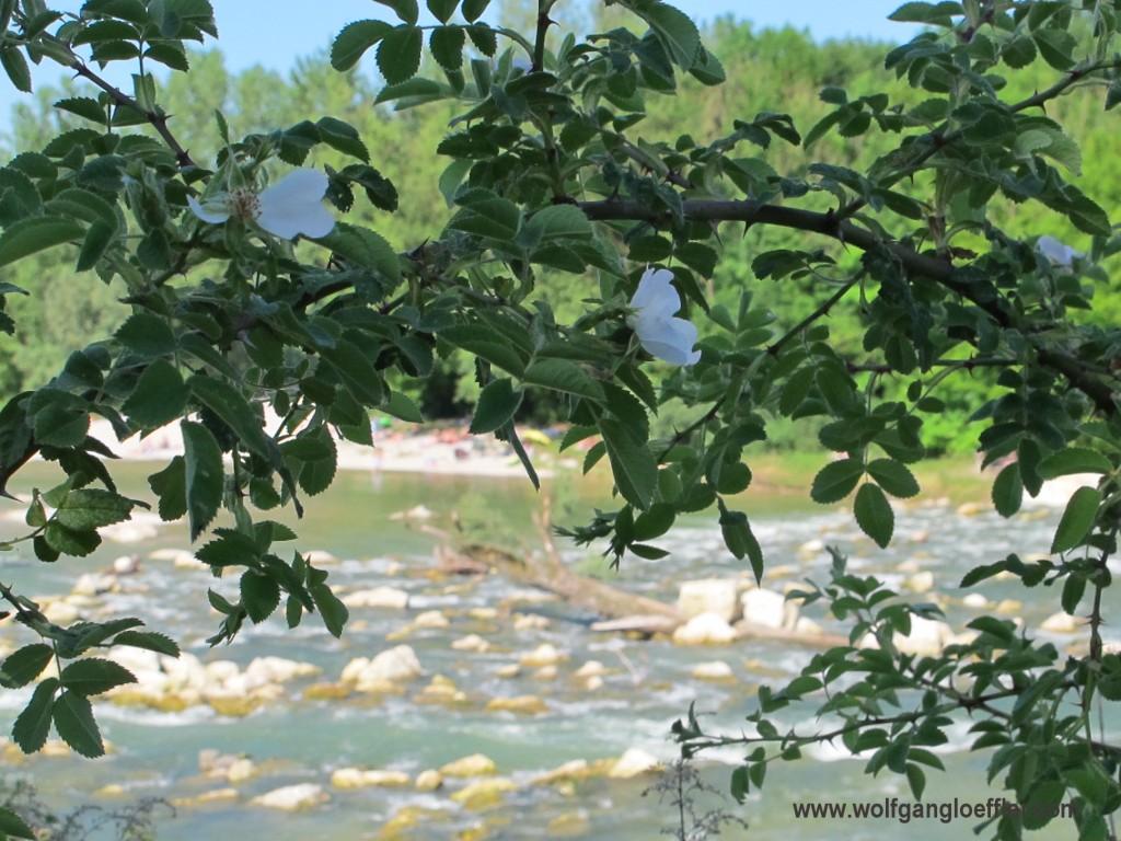 Früher gab es eine Reihe von Stauwehren auf der Strecke. Die meisten davon hat man im Zuge der Renaturierung des Flusses entfernt und statt dessen große Felsbrocken im Fluß verteilt. Dadurch bilden sich kleine Inselchen und nach jedem Hochwasser bleibt Treibgut hängen. Ich finde das schaut viel besser aus. Aber es gibt auch Stellen im Fluss, an denen das Wasser träge vor sich hin fließt und eher aussieht wie ein See. Immer wieder waren Angler beim Fliegenfischen und auf einem Teilstück des Flusses haben wir Leute in Schlauchbooten und Kajaks gesehen.
