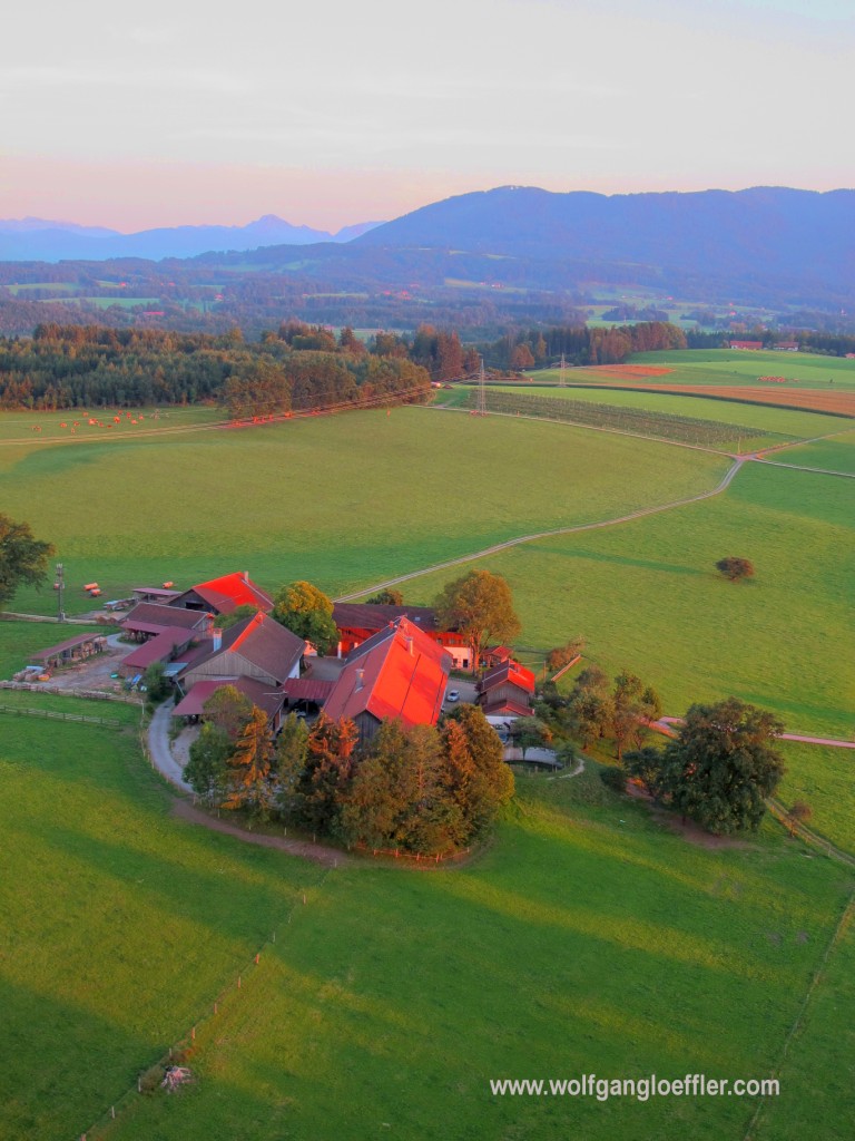 Heißluftballon, Ballon, fahren, Bauernhof, Baum, Wiese, Erlebnis, Abenteuer, Alpen, Panorama, Bad Tölz, Bayern