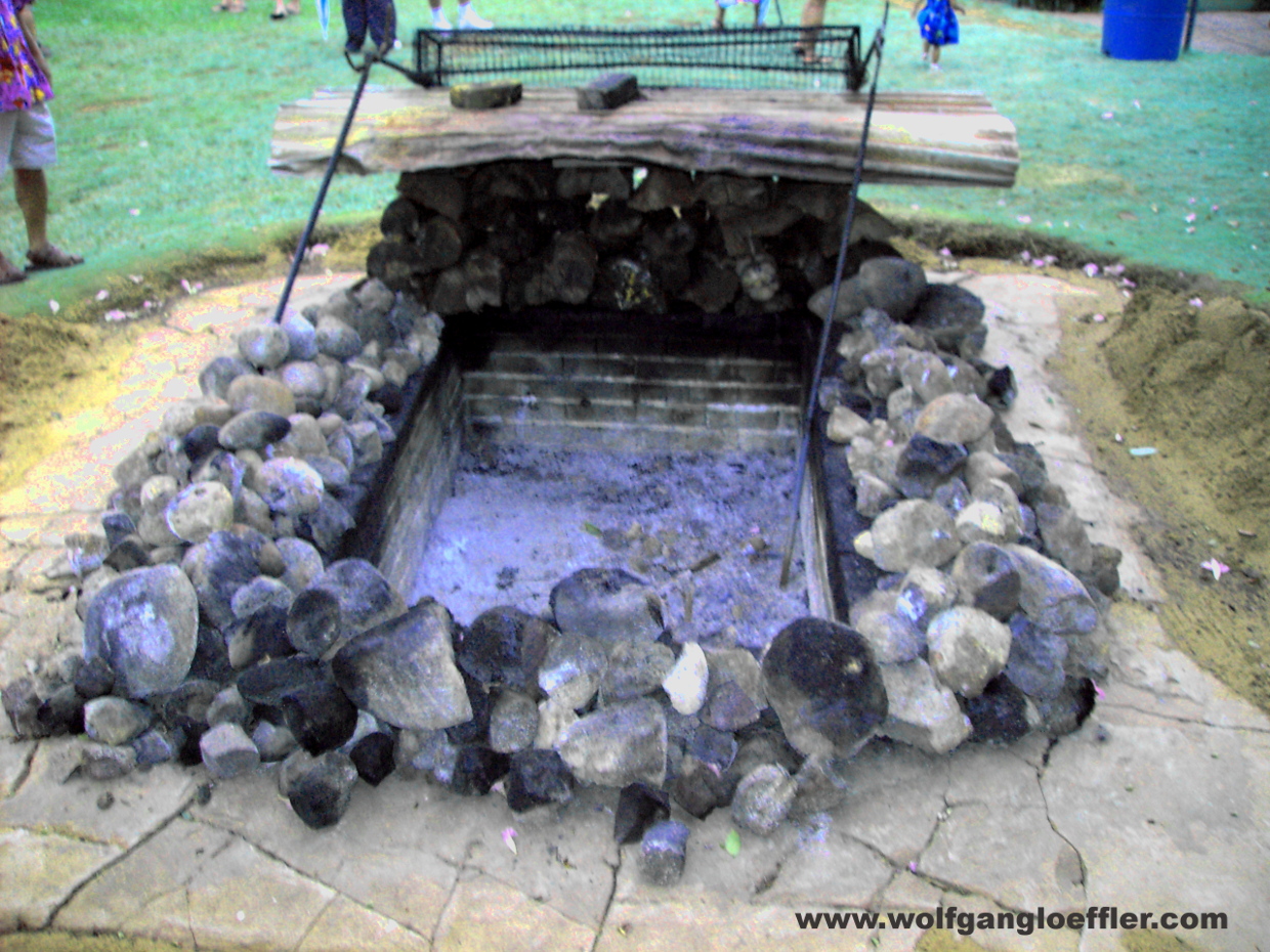 Wenn die Hawaiianer etwas zu feiern hatten trafen Sie sich zu einem Luau. Die Vorbereitungen sind zeitintensiv, denn zunächst muss ein Imu (Erdofen) gegraben werden. Dieser wird dann mit Lavasteinen ausgelegt. Wenn das erledigt ist, wird er mit Holz aufgefüllt, das dann angezündet wird. Dadurch heizen sich die Steine auf. Sobald das Holz runter gebrannt ist, wird ein ganzes Schwein, das zuvor in Bananenblätter gewickelt wurde in den Ofen gelegt. Dazu dann noch ein paar große Fische, auch in Blätter eingewickelt. Wenn der Ofen dann gefüllt ist, wird das Ganze mit Erde zugeschüttet und über mehrere Stunden gegart. Sobald Alles gar ist, gibt es eine spezielle Zeremonie, mit der das Essen dann beginnt. Ein Mann ruft zunächst mit einer Muschel die Festgemeinde zusammen und alle schauen zu, wie der Ofen geöffnet wird und das Festmahl zum Vorschein kommt. Durch das langsame Garen ist das Fleisch sehr saftig und lässt sich ganz einfach von den Knochen „pflücken“. Das schaut ein bisschen wie aus wie Dönerfleisch. Als Vorspeise gibt es eine Art Tartar von Thunfisch und diverse Salate. Zum Hauptgang die Fische, das Fleisch und ganz viel Taro. Und natürlich gibt es zum Essen Musik und Tanz. In diesem Fall dann Hula.