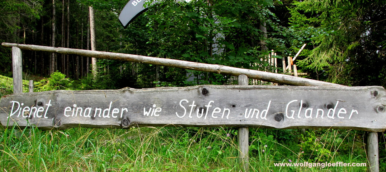 One of the first stops asks you to serve each other like the steps and the handrail of a staircase. In order to get into the mood for this path you will have to pass this low gate. The path now rises gently and you will pass different stops with slogans that shall make you think. Some of them are