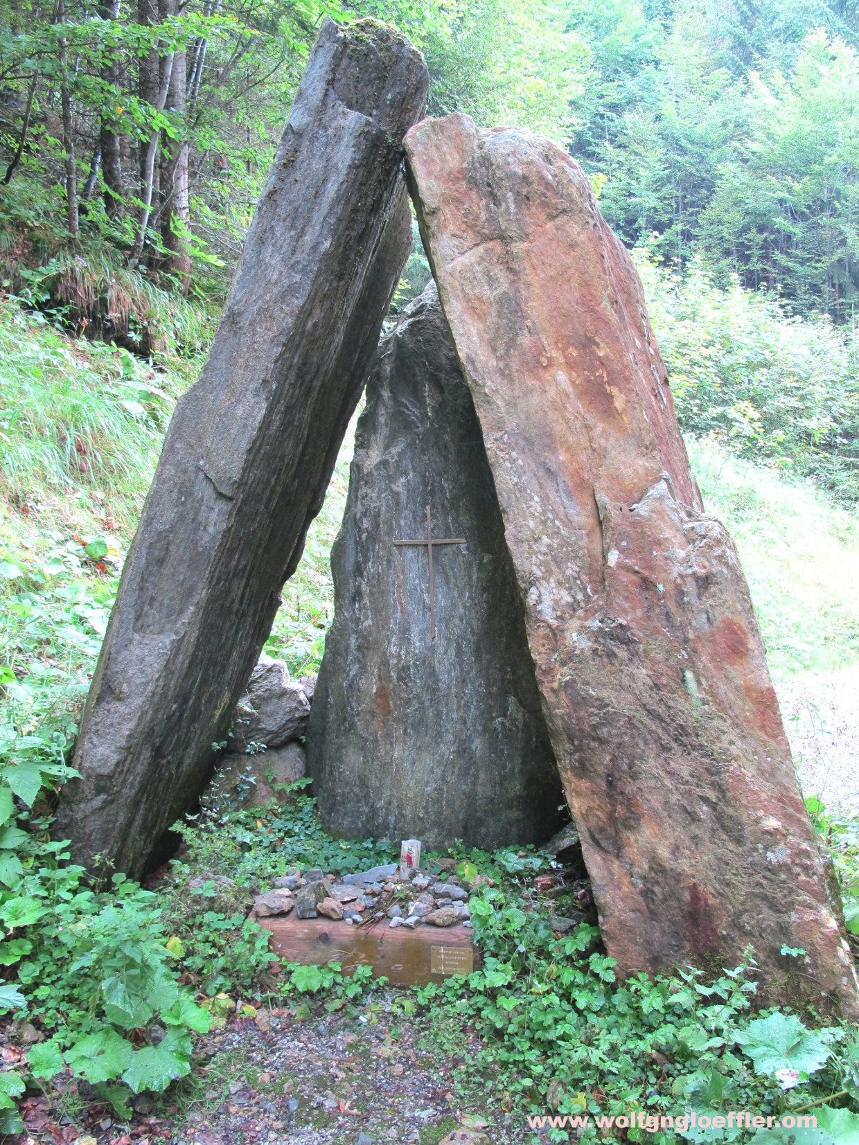 These lumps of rock that form a grotto mark the end of this trail. You can walk a few minutes to get to a cottage called Rodlhütte (sleigh cottage) and have a bite to eat and a drink, or you walk back to the last crossing and ascent via the „Tunnelweg“ to the summit.