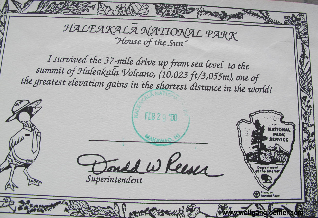 Denn für das nächste Abenteuer heißt es früh aufstehen. Je nachdem wo Euer Hotel liegt, solltet Ihr zwischen zwei und drei Uhr morgens losfahren. Fragt am besten noch mal in Eurem Hotel nach, was die beste Zeit ist. Wie ich schon erwähnt habe ist der deutsche Name des Haleakala „Haus der aufgehenden Sonne“. Und so hat es sich eingebürgert, dass auch die meisten Touristen zum Sonnenaufgang auf den 3.000m hohen Gipfel fahren. Da die Straße sich in vielen Serpentinen den Berg hochschlängelt braucht Ihr für die ca. 60 km etwas Zeit. Da der Gipfel im Nationalpark liegt müsst Ihr für die Fahrt dorthin Parkeintritt zahlen (Stand Januar 2017 USD 20,00 für ein 3-Tagesticket). Und vergesst nicht warme Klamotten mit zu nehmen. Dort oben kann es sehr kalt sein. Die Park Ranger werden Euch auch eine Urkunde überreichen, die bestätigt, dass Ihr die Auffahrt überlebt habt.