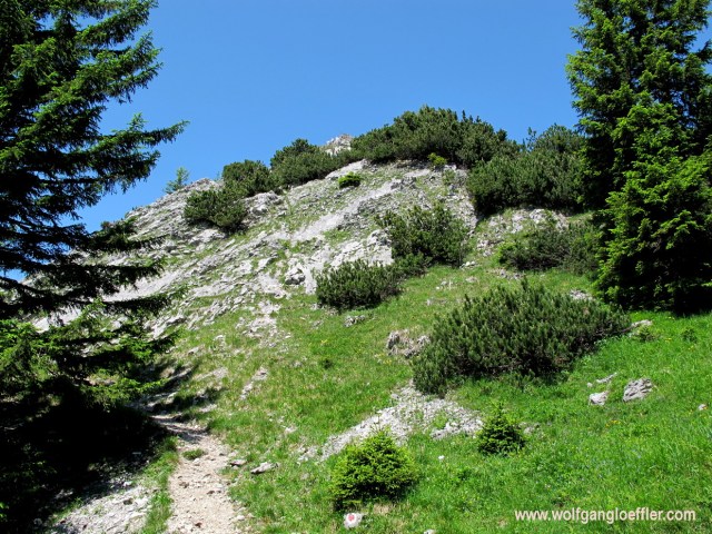 I finally reach the saddle between Naunspitze and Petersköpfel. One summit per day is enough, so I turn left to the Naunspitze. And then the path ends and I am standing in front of this rock wall.
