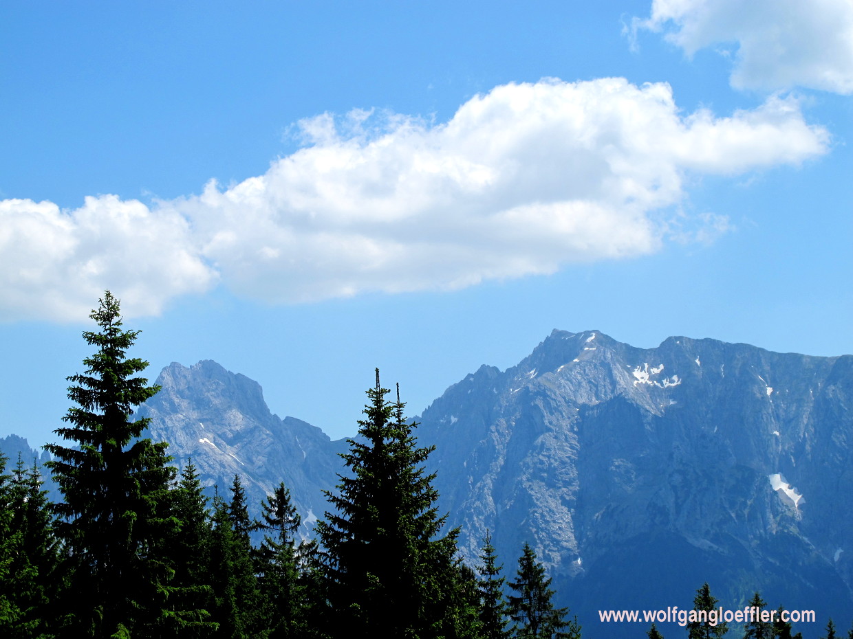 So I pass the cabin and start the last ascent of about 790 ft. The path winds itself steeply to the top, somtimes in serpentines but mostly straight up and is still easy to walk. Whenever you turn around you get great views of the Rietzau alp and the summits of the Wilder Kaiser on the oppsite side of the valley.