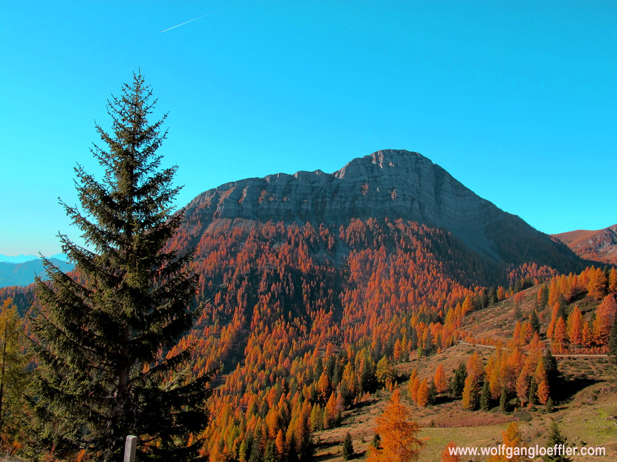 Und wieder erreiche ich diesen bunten, herbstlichen Lärchenwald und habe das Gefühl, dass die Farben in der Nachmittagssonne noch intensiver leuchten. Und ich mochte bis dato den Herbst nicht so sehr, weil danach der Winter kommt, und weil er oft so regnerisch und kühl ist. Aber bei dem Wetter? Einfach nur genial!