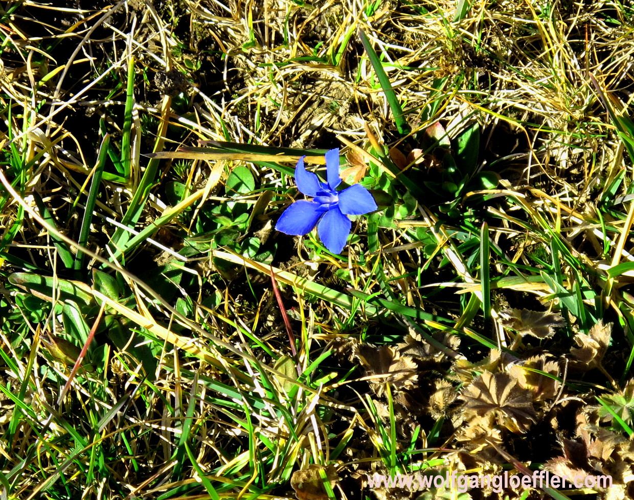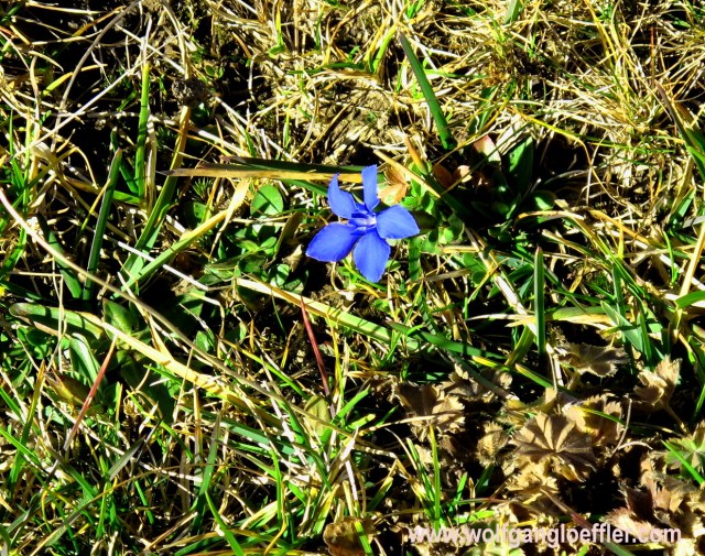 Ich folge also dem Weg über den Grat, der zur Eckwand führt. Das muss nun der 4-Gipfelweg sein. Und voller Erstaunen entdecke ich dann noch diesen Enzian. Das hätte ich zu dieser Jahreszeit nicht mehr erwartet. Laut meinen Freunden war das aber keine verspätete Blüte, sondern eine verfrühte.