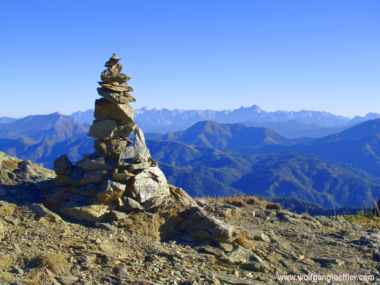 Nun ist es nicht mehr sehr weit bis zum Gipfel. Der Blick nach Norden in die Tauern und Nockberge wird auch immer grandioser. Gemütlich gehe ich weiter. Es ist wirklich sehr schön hier oben. Nur selten höre oder sehe ich Menschen. Etwas weiter unten im Wald hörte ich in der Ferne einen Hund bellen. Den werde ich später mitsamt seinem Herrchen noch treffen. Am Ende der Mulde zeigt ein Wegweiser auf ein kurzes Stück Felswand, das ein bisschen schwieriger zu gehen, oder besser gesagt zu kraxeln ist.