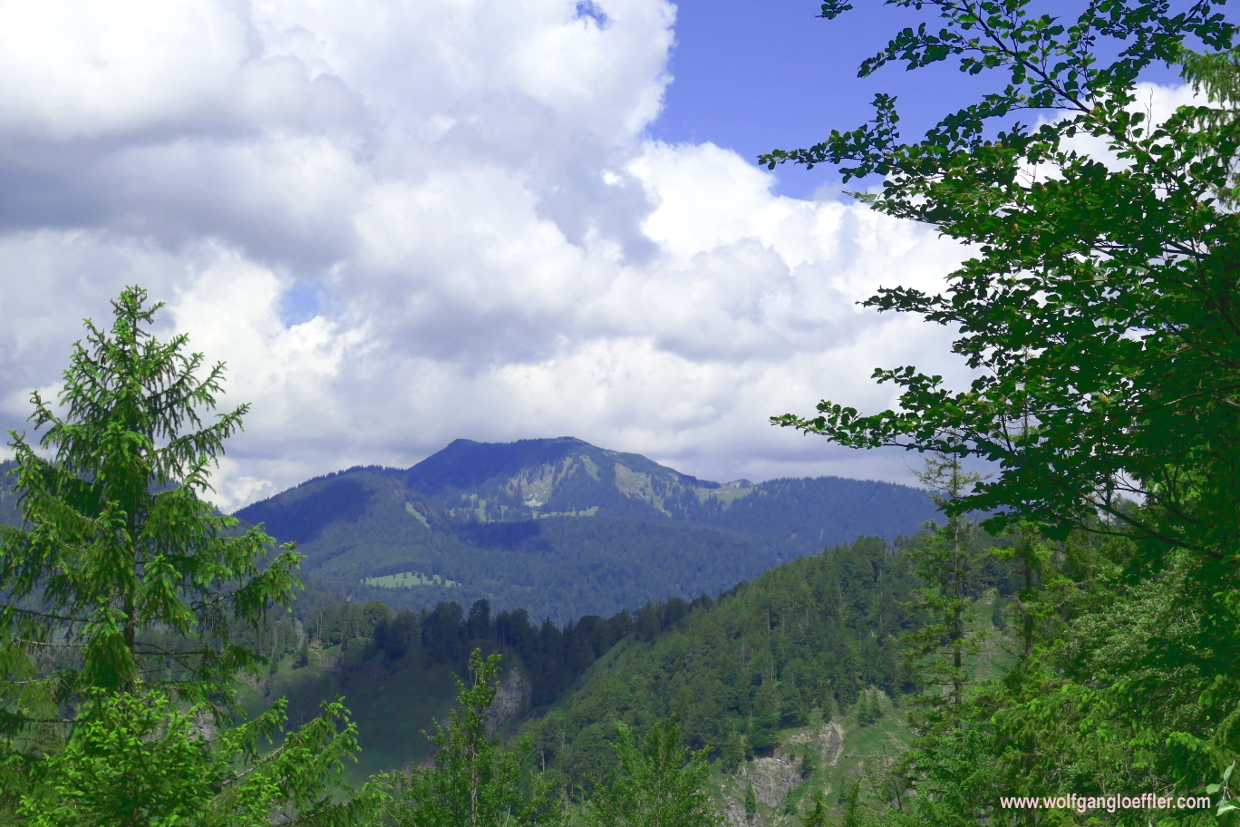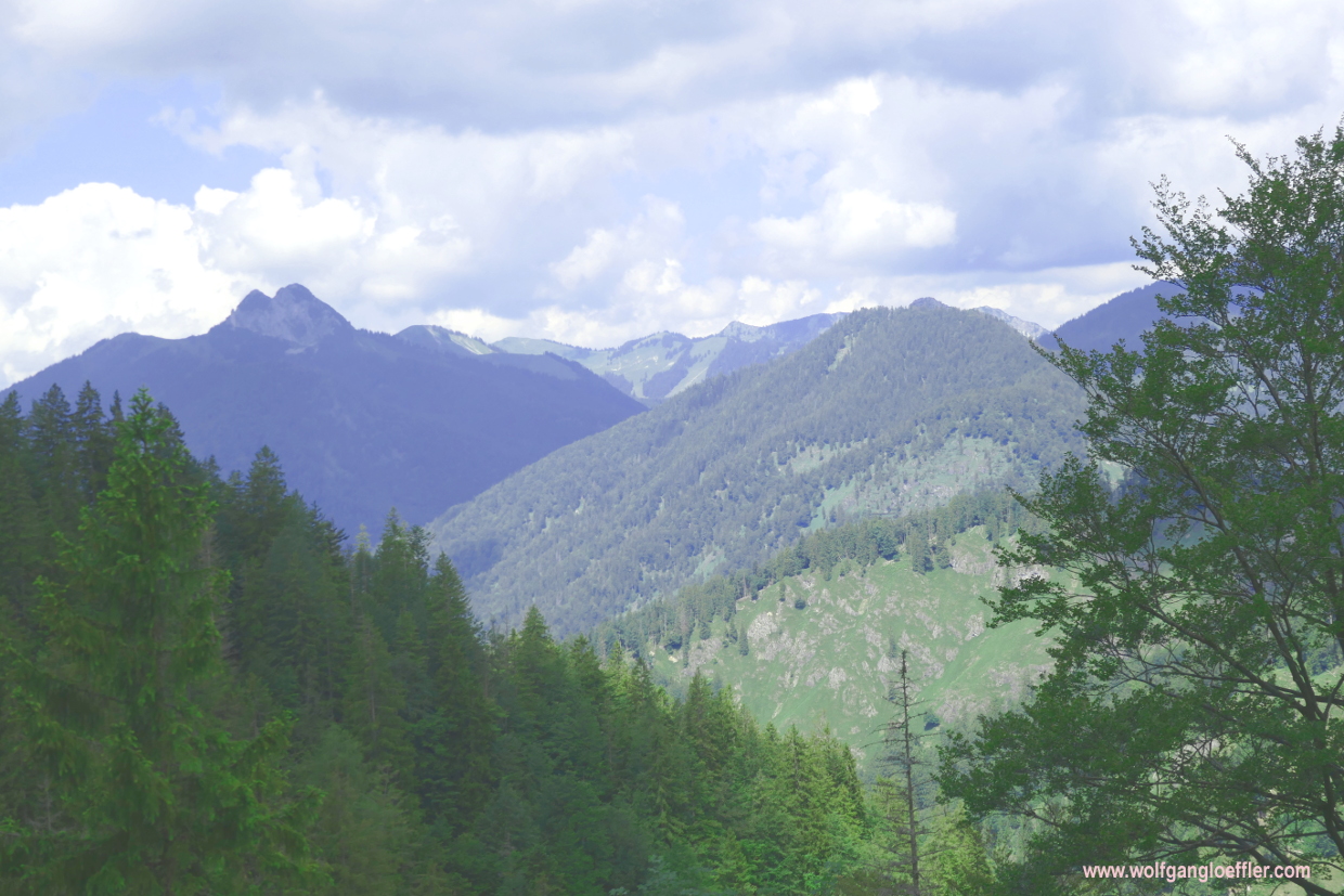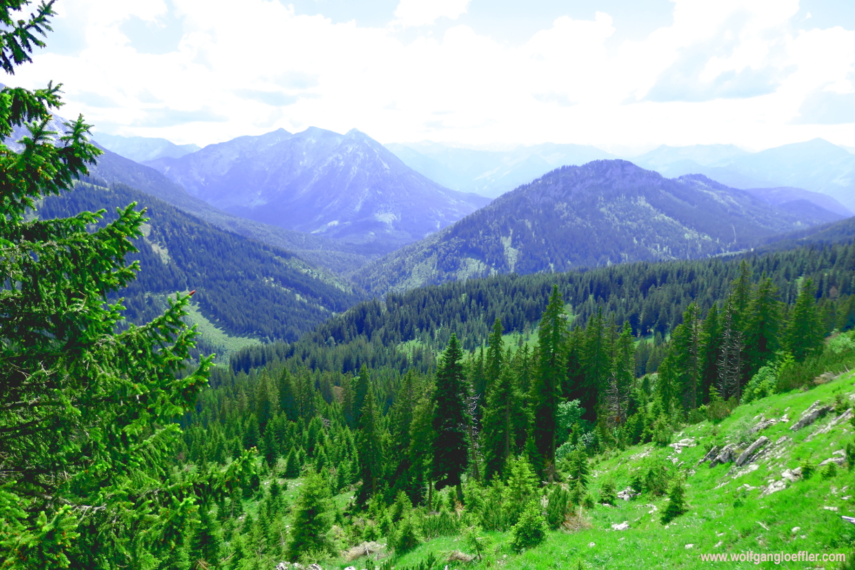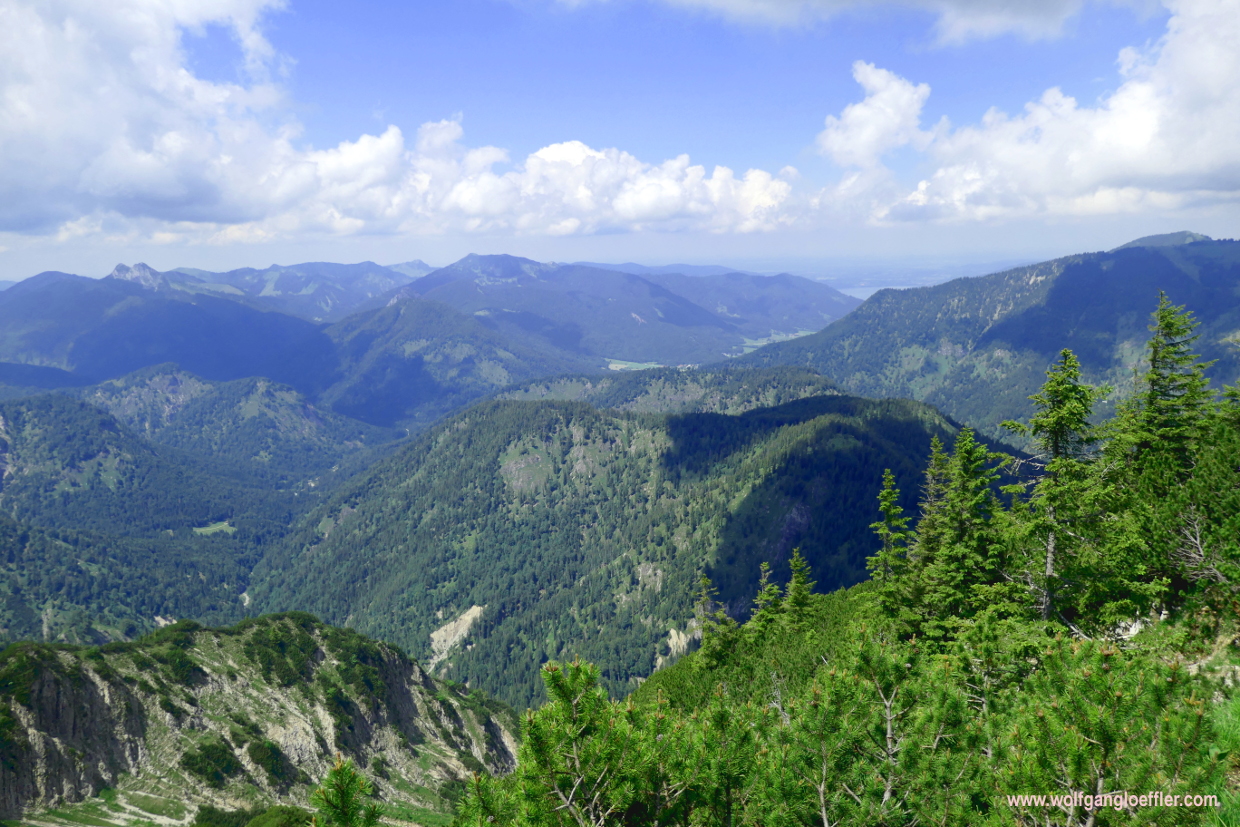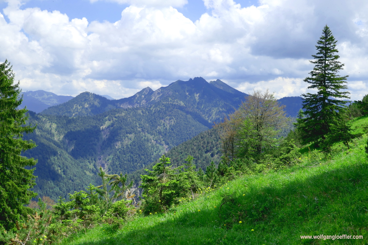 Etwa eine Stunde nachdem ich von Siebenhütten los bin, erreiche ich zwischen dem Wenig- und Zwieselberg wieder ein längeres flaches Wegstück und laufe nun weiter durch den dichten Wald zum Weißenbachkopf. Immerhin hat man hier von Zeit zu Zeit dann mal die ersten Panoramablicke über die bayrische Bergwelt. Das ist der Grund warum ich diese Touren gehe. Diese Weite und Ausblicke faszinieren mich immer wieder aufs Neue. Also tief einatmen und die würzige Luft einsaugen.