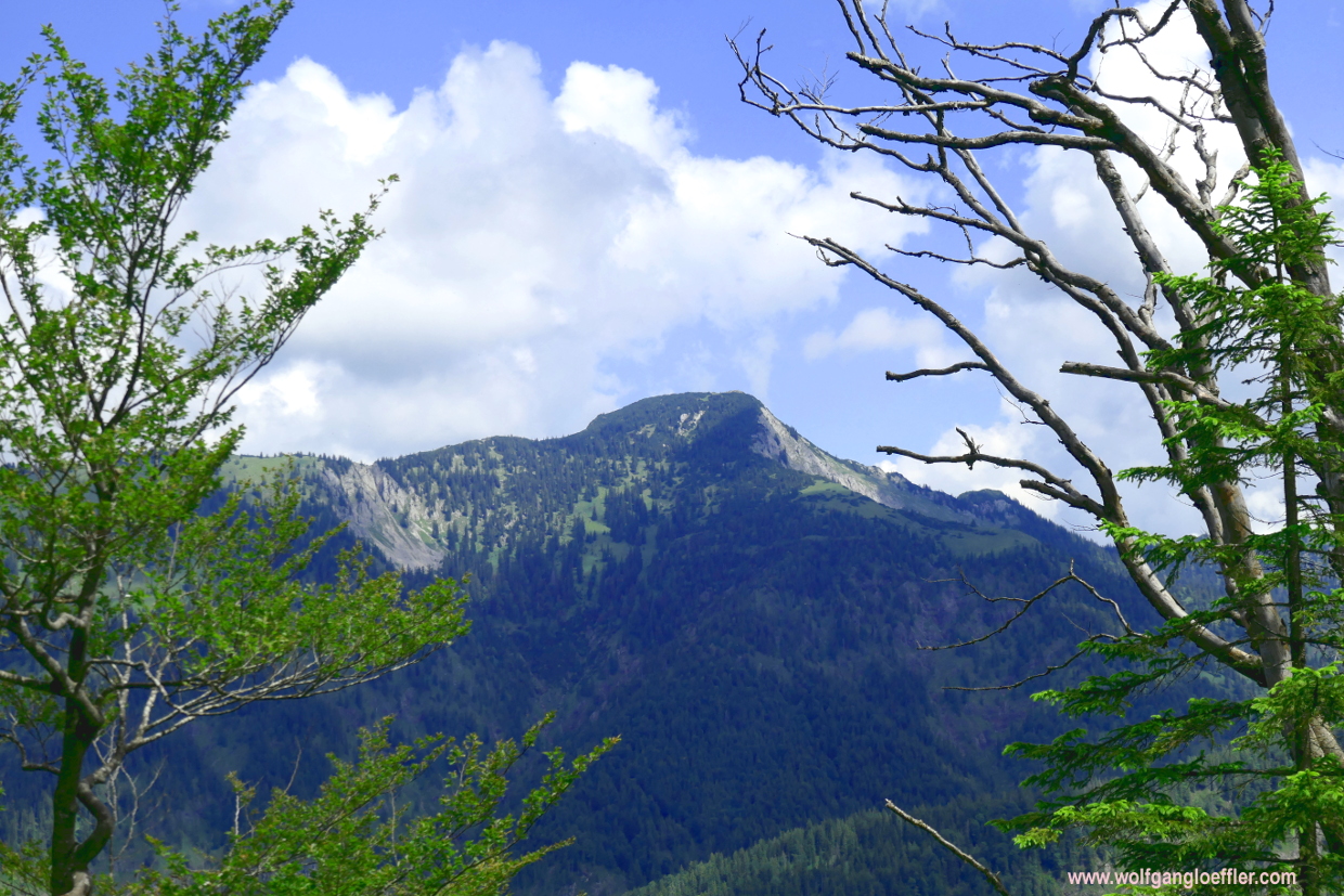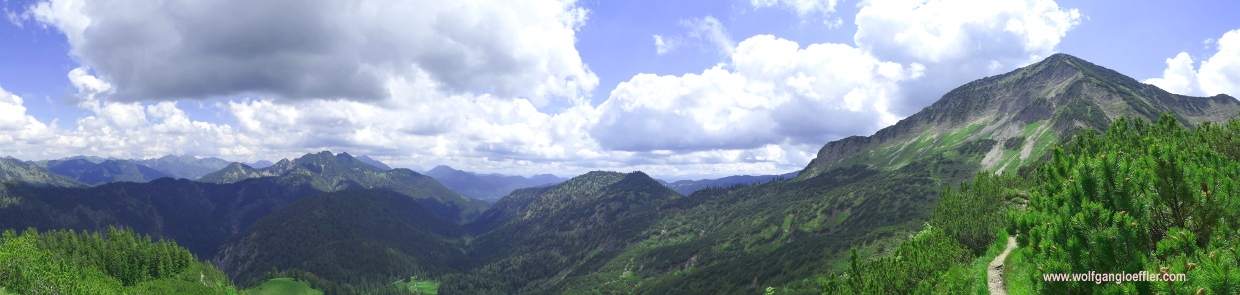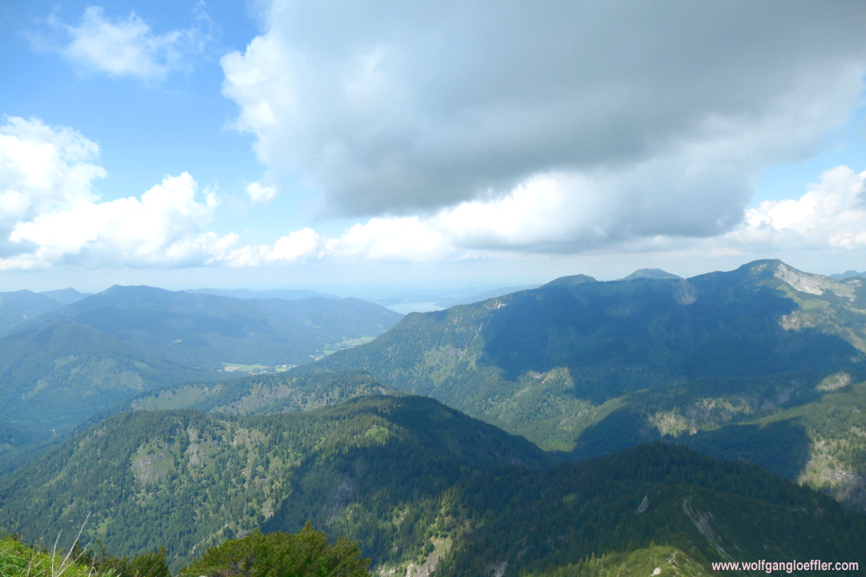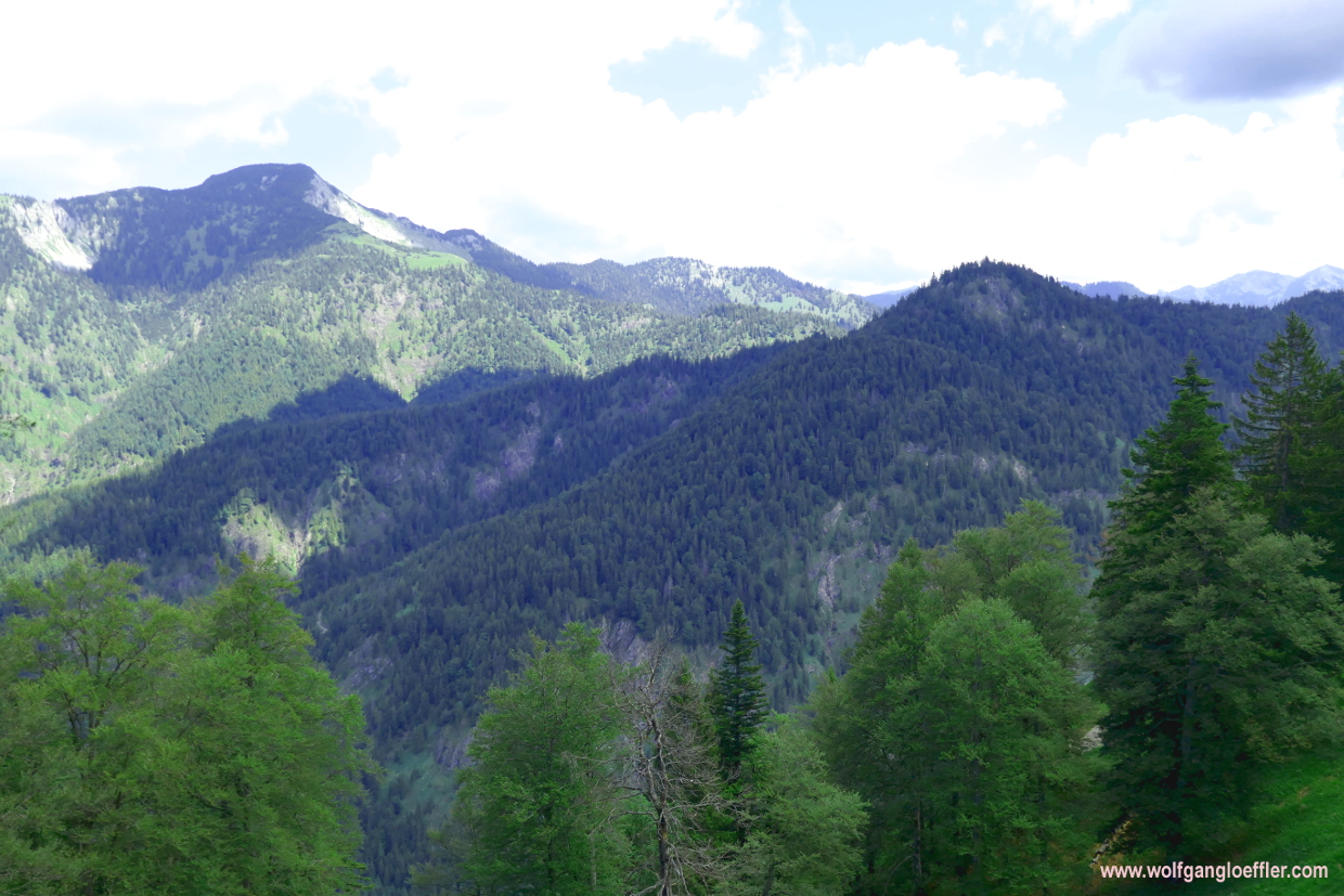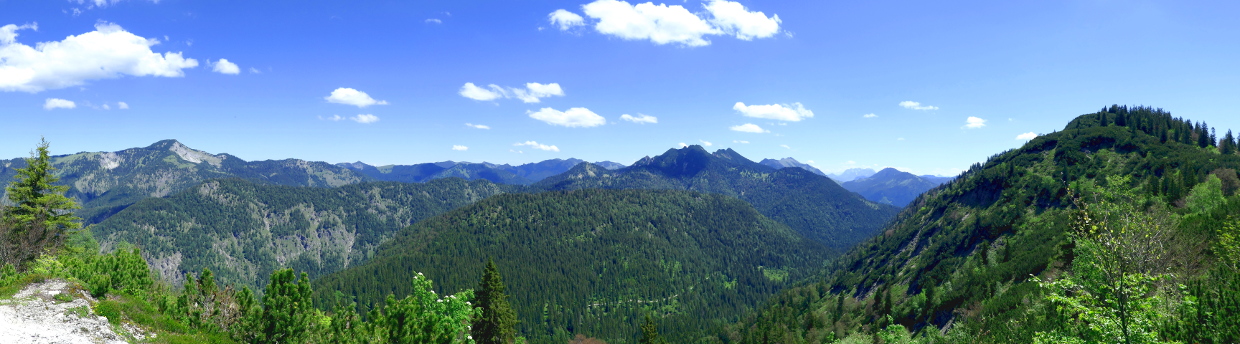 Etwa eine Stunde nachdem ich von Siebenhütten los bin, erreiche ich zwischen dem Wenig- und Zwieselberg wieder ein längeres flaches Wegstück und laufe nun weiter durch den dichten Wald zum Weißenbachkopf. Immerhin hat man hier von Zeit zu Zeit dann mal die ersten Panoramablicke über die bayrische Bergwelt. Das ist der Grund warum ich diese Touren gehe. Diese Weite und Ausblicke faszinieren mich immer wieder aufs Neue. Also tief einatmen und die würzige Luft einsaugen.