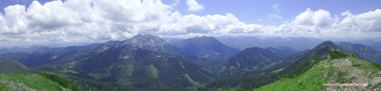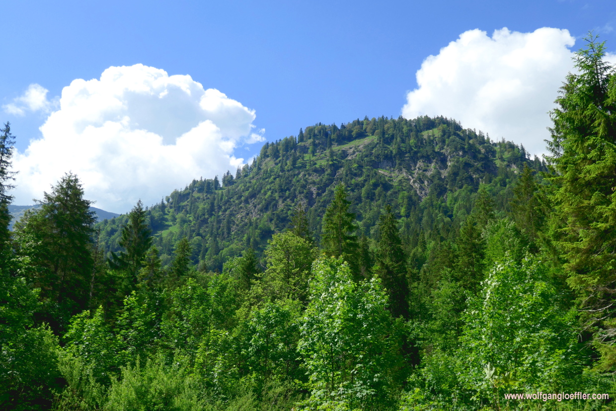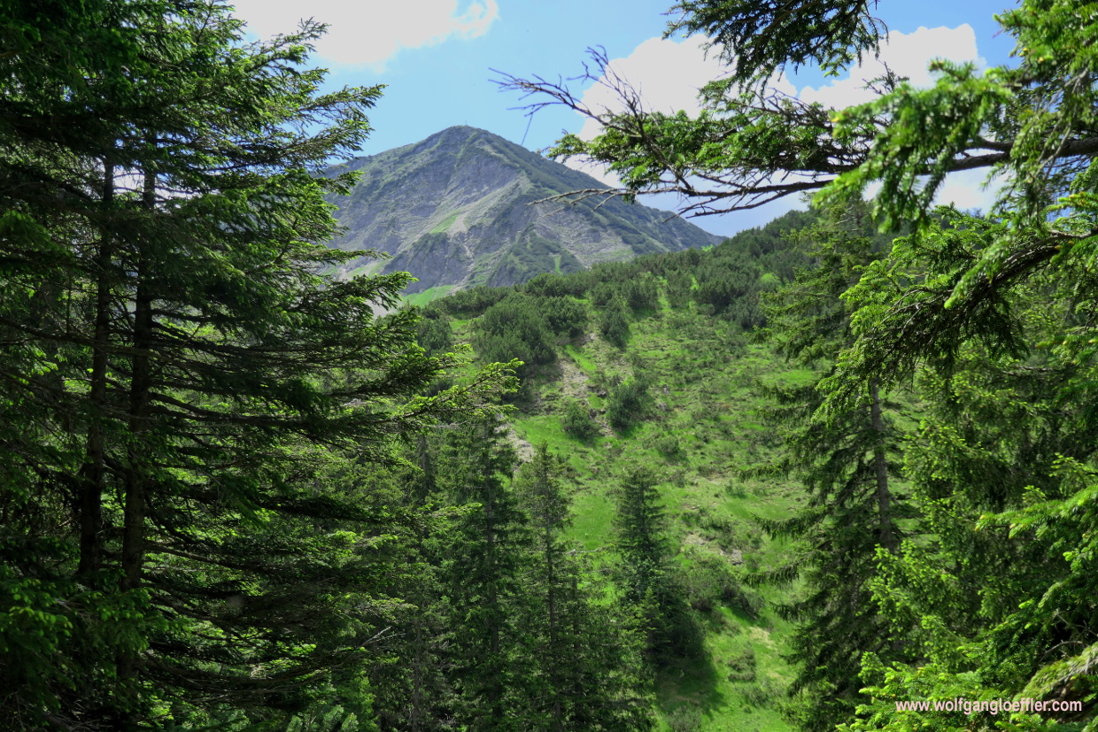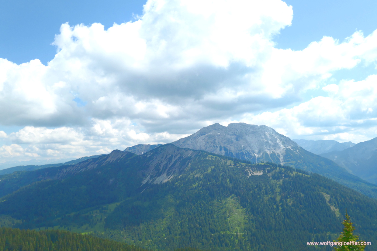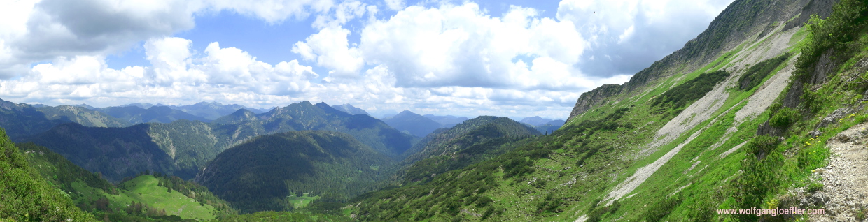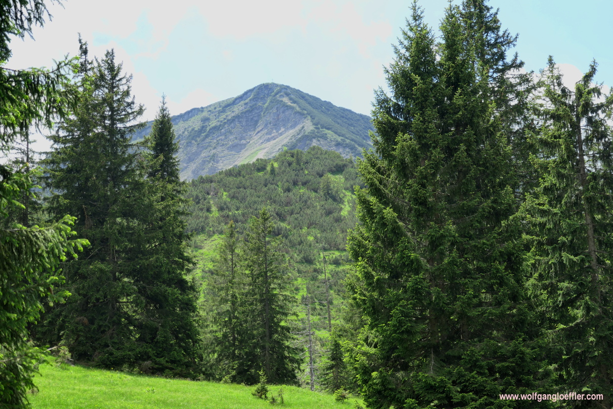 Etwa eine Stunde nachdem ich von Siebenhütten los bin, erreiche ich zwischen dem Wenig- und Zwieselberg wieder ein längeres flaches Wegstück und laufe nun weiter durch den dichten Wald zum Weißenbachkopf. Immerhin hat man hier von Zeit zu Zeit dann mal die ersten Panoramablicke über die bayrische Bergwelt. Das ist der Grund warum ich diese Touren gehe. Diese Weite und Ausblicke faszinieren mich immer wieder aufs Neue. Also tief einatmen und die würzige Luft einsaugen.