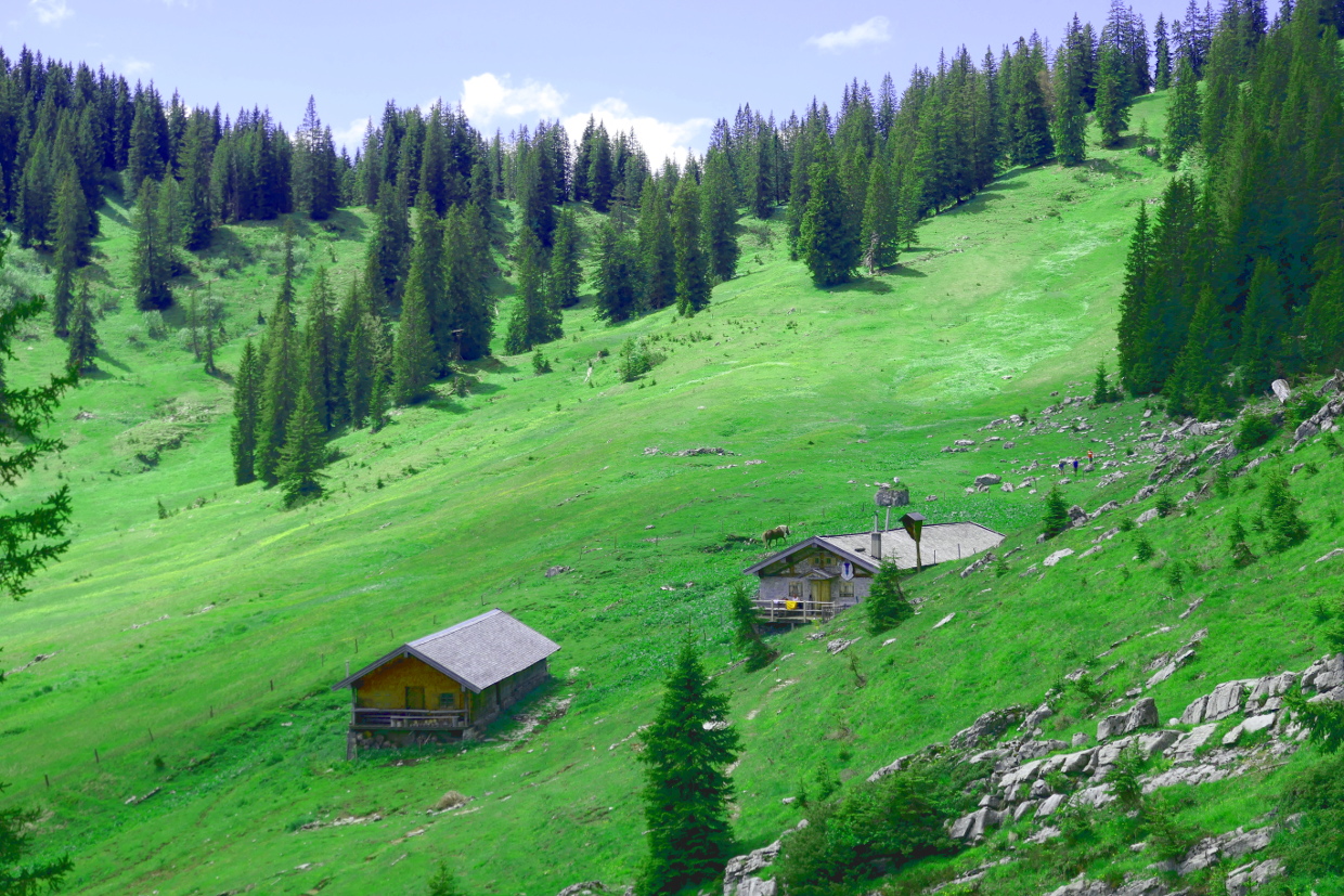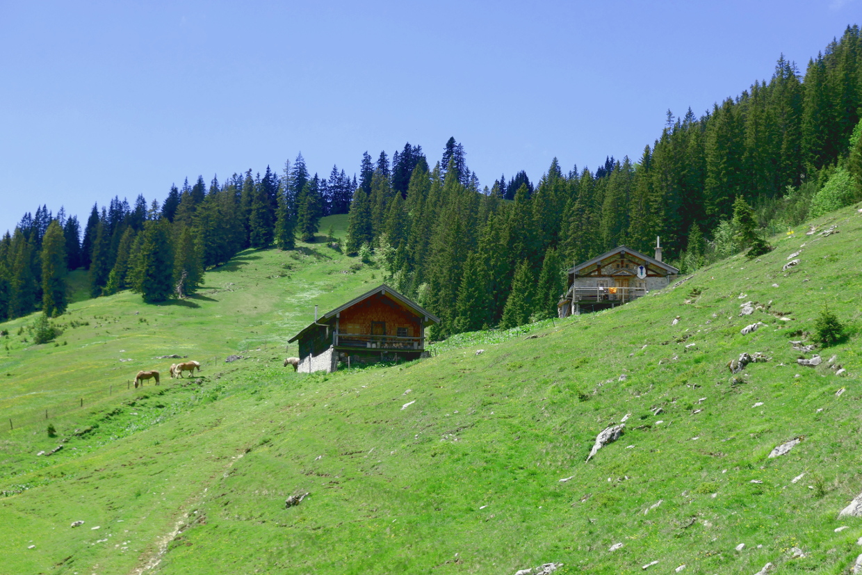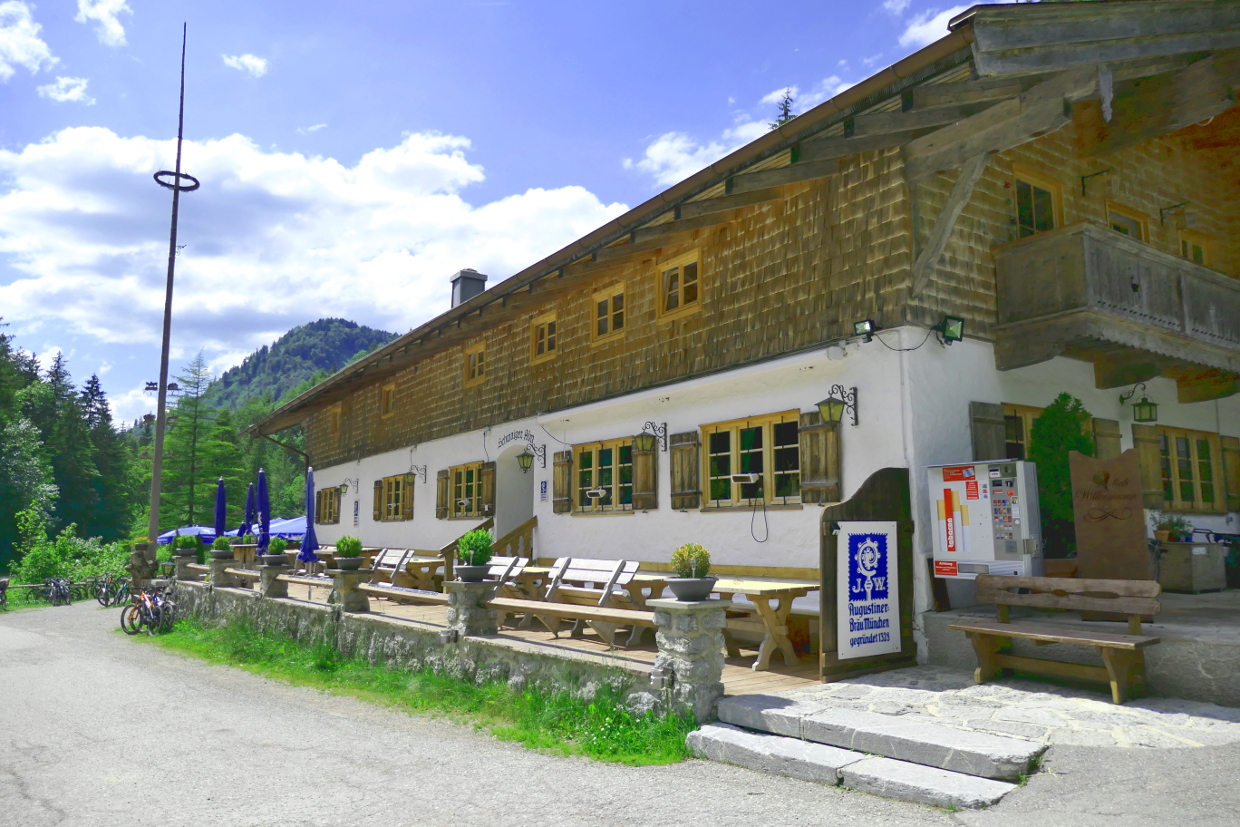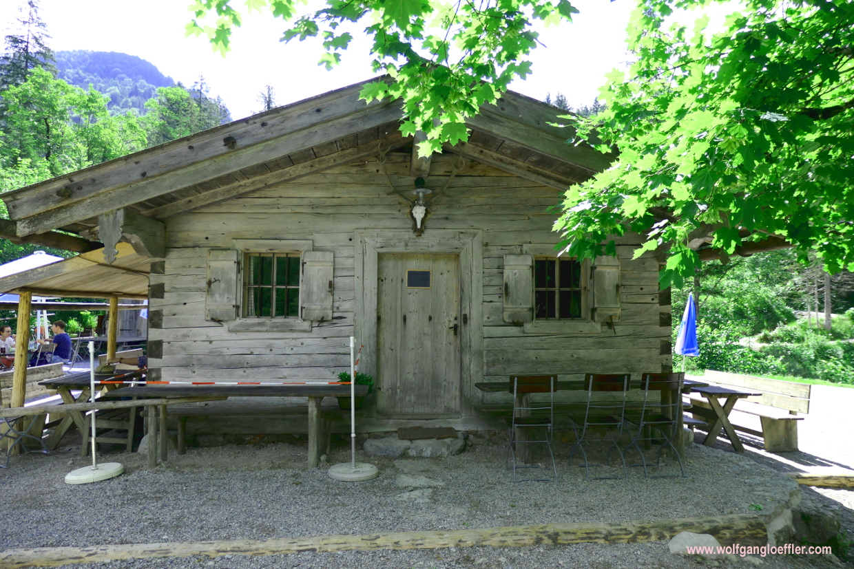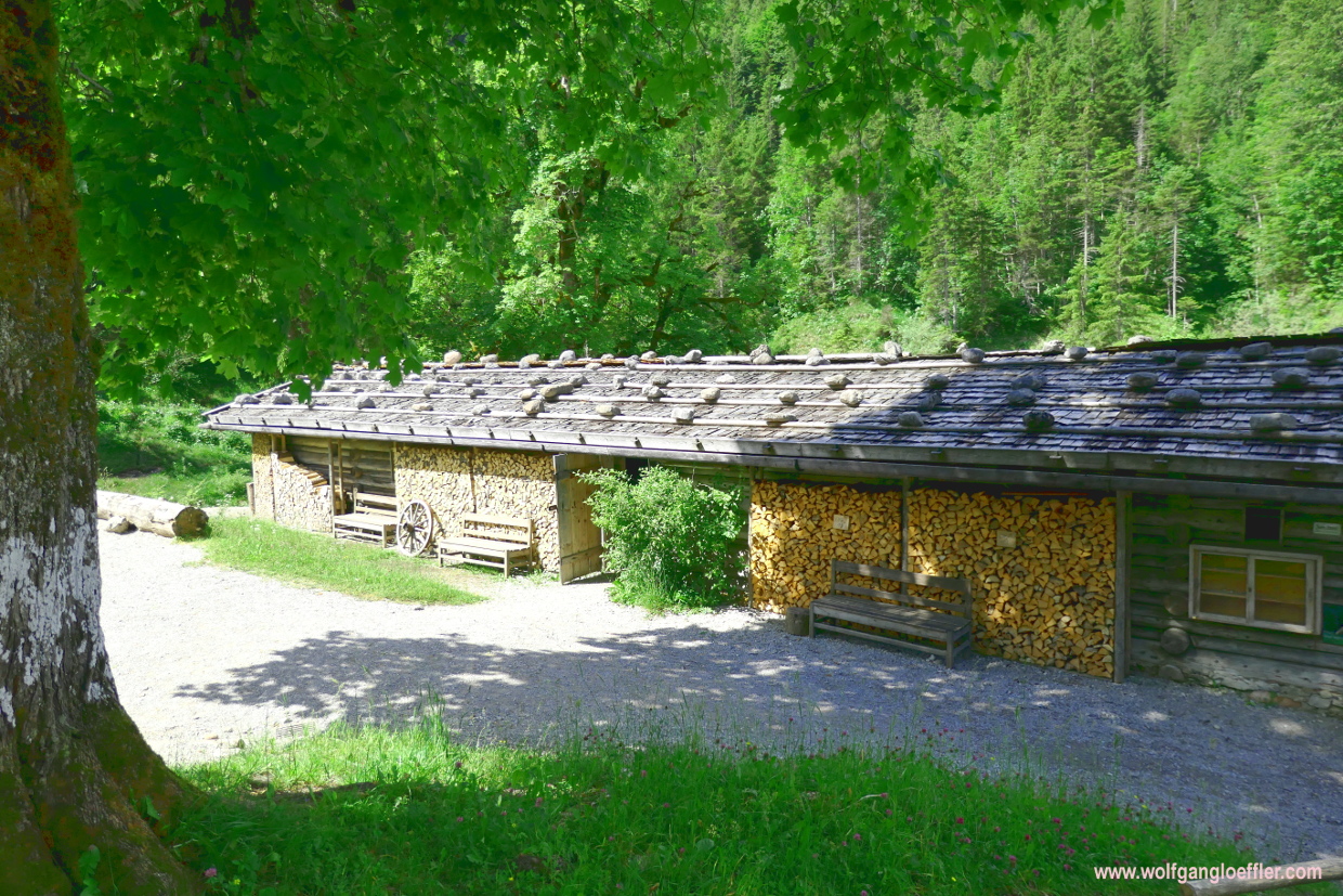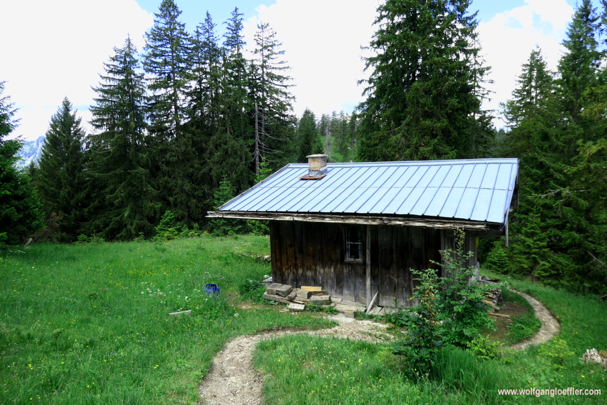 Ziemlich bald erreiche ich die Bayrische Wildlam, die genau an der Grenze zu Österreich liegt. Ich habe gelesen, dass DAV-Mitglieder die als Selbstversorger mieten können. Allerdings müsst ihr hier eure gesamte Verpflegung ziemlich weit über den Berg tragen. Die nächstgelegene bewirtschaftete Hütte ist die Gufferthütte, die aber auch etwa 45 Minuten zu Fuß entfernt ist. Auf dieser Alm sind keine Kühe, nur zwei einsame Pferde grasen hier. Auch hier unten sind weit und breit keine Menschen zu sehen.