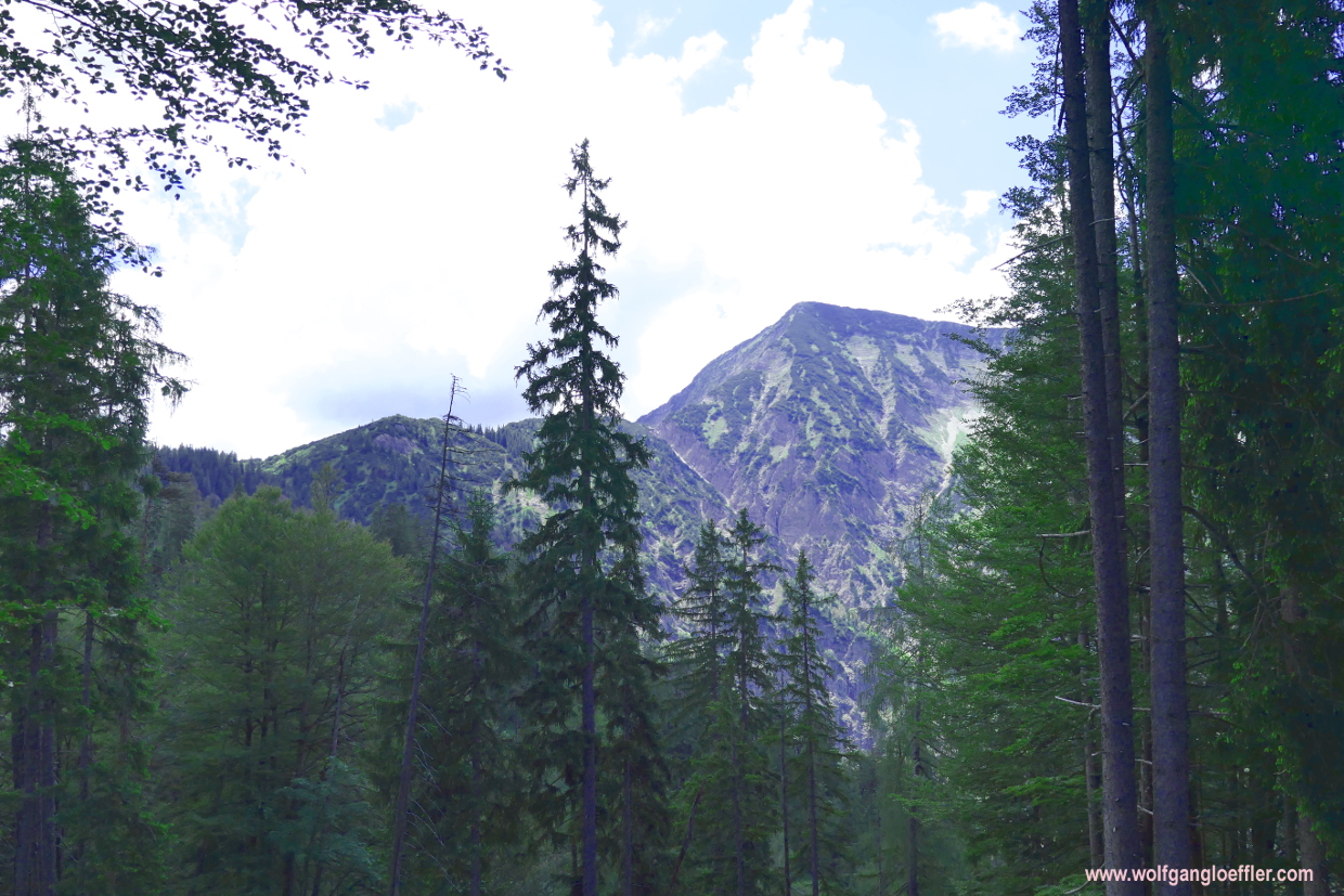 Der Weg führt über eine Schotterpiste und der Rest der Tour wird zu einem Spaziergang. Die meiste Zeit laufe ich in schattigem Wald und nur ab und zu gibt es noch eine Lichtung, die mir einen Blick auf die Berge rechts und links des Tals gewährt. Irgendwie komme ich aber sehr viel schneller voran, wie auf dem Wegweiser angegeben und schon nach wenigen Minuten stehe ich vor dem Schwarzen Kreuz. Von hier ist es nicht mehr weit zur Schwaigeralm, wo ich bestimmt eine kühle Erfrischung bekomme.