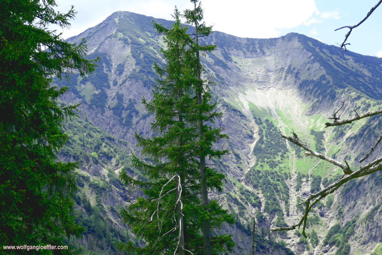Und dann sehe ich zum ersten Mal den Gipfel des Halserspitz vor mir. Und stelle fest, dass ich da wohl doch noch ein paar Höhenmeter überwinden muss. Ein Blick auf meine Karte sagt mir etwa 500. Da es heute aber nicht allzu heiß ist und der Weg bis hierher auf weiten Strecken im Schatten verlief ist das kein Problem. Ein bisschen Herausforderung darf ja schon sein. Das letzte Stück auf den Gipfel sieht von hier aus etwas schwieriger aus. Aber das werde ich ja später noch sehen.