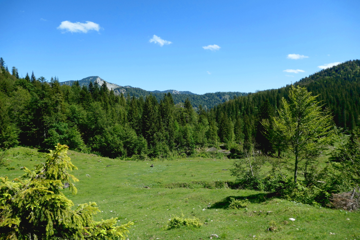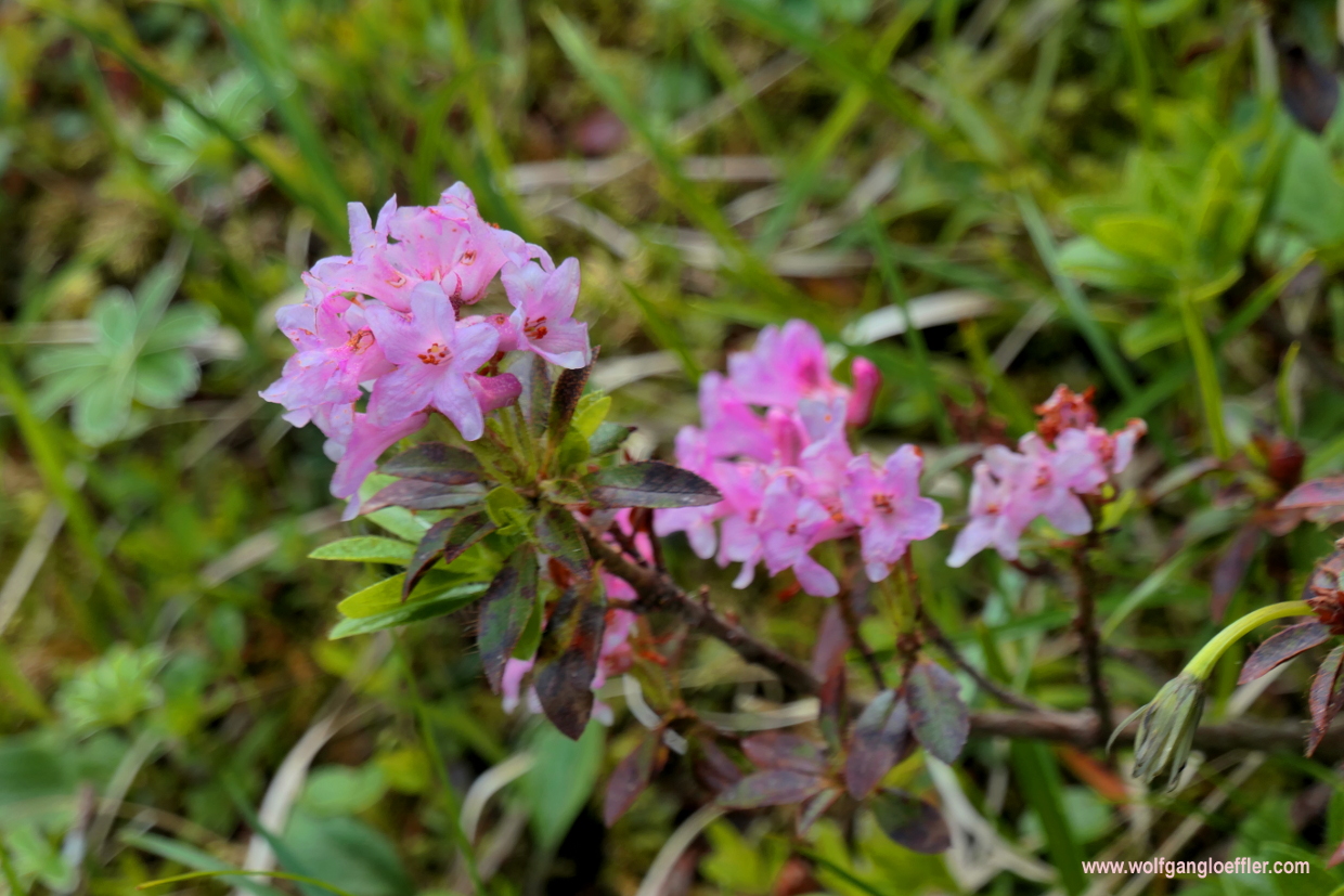 Noch ein kleines Stück weiter öffnet sich dann der Blick in die Lange Au und hinüber zum Bayrischen Schinder. Das ist auch noch einer der Gipfel, die ich gerne mal besteigen möchte. Der Wald wird langsam lichter und so sehe ich auch wieder einige schöne Blumen. Ich bin etwas erstaunt zu sehen, dass die ersten Alpenrosen schon blühen. Es ist Mitte Juni und normalerweise blühen die im Juli. Schön sind sie aber trotzdem.