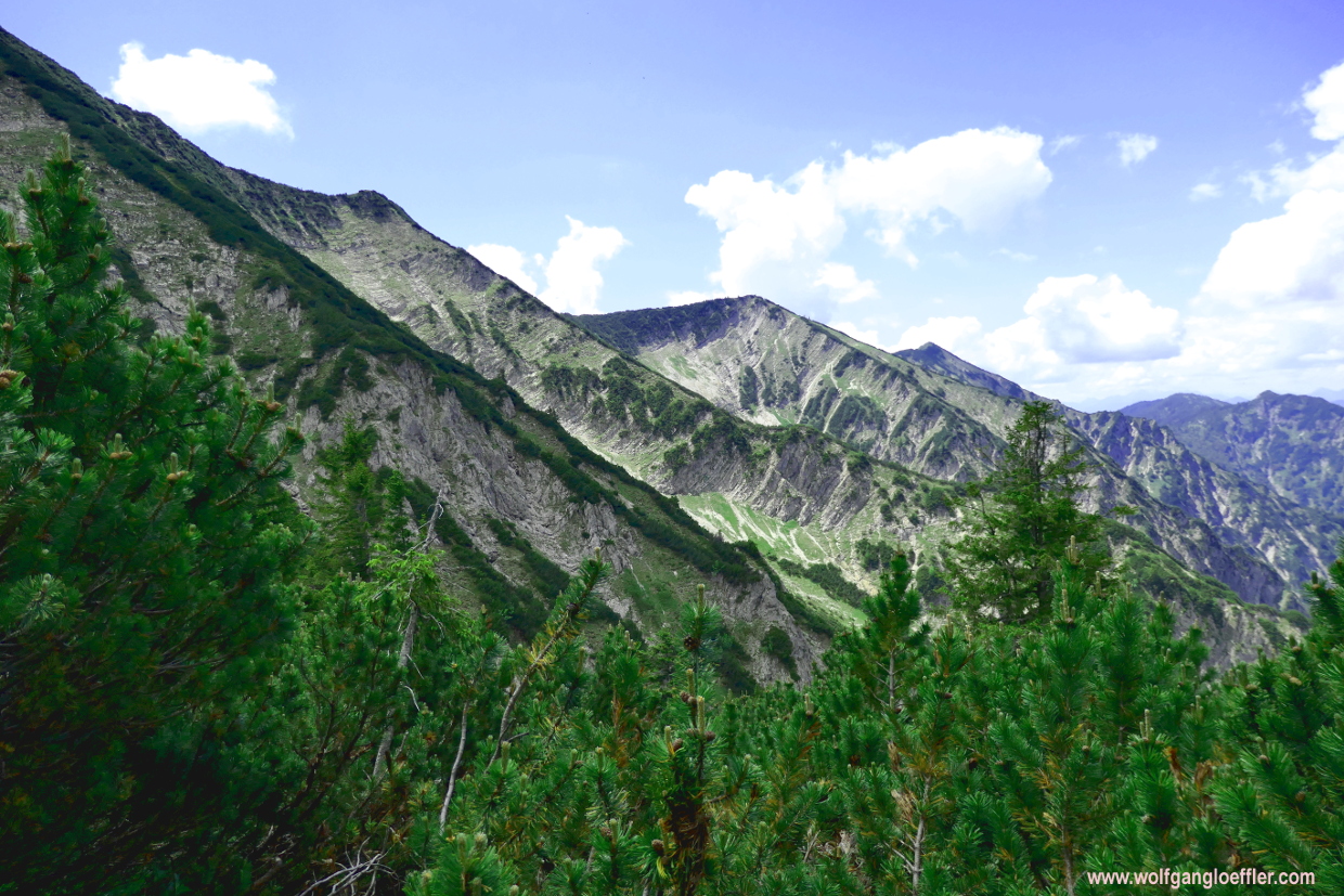 Wie immer heißt es auch heute irgendwann sich an den Abstieg zu machen. Für diesen wähle ich den einfacheren Weg über die Bayrische Wildalm. Für diesen Pfad ist es zwar auch ratsam trittsicher und schwindelfrei zu sein, aber ihr müsst hier nicht kraxeln. Und ihr habt hier immer die mächtige Guffertspitze im Blick. Traumhaft schön. Im oberen Bereich lauft ihr noch entlang eines Abgrunds. Der ist aber bald überwunden.