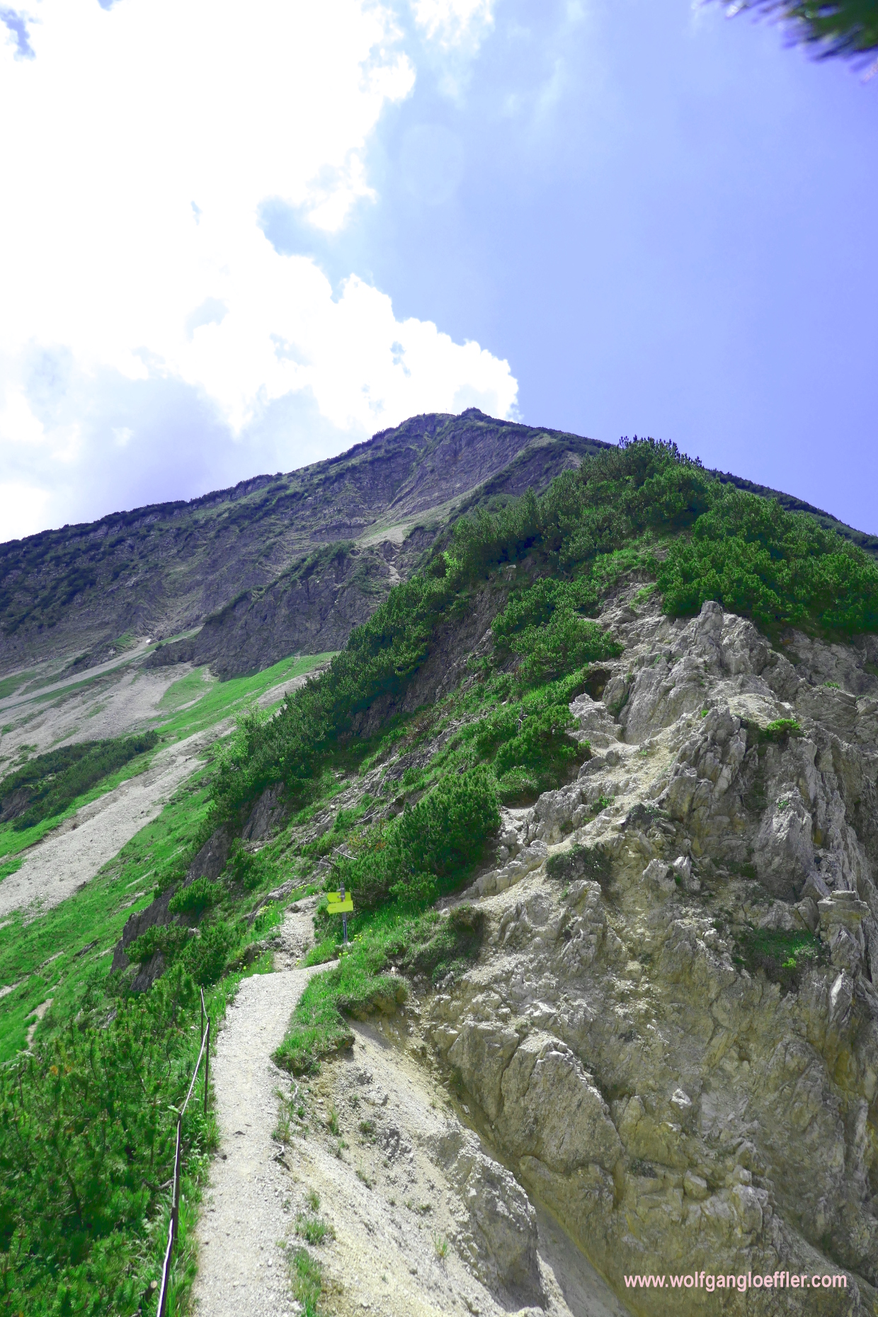 Und schon kurze Zeit später erreiche ich dann den Steig, der zum Gipfel führt. Der schaut nun wirklich etwas herausfordernd aus. Hier kommt auch der Pfad an, den ich bei meiner ersten Tour nicht gefunden habe. Allerdings stelle ich auch fest, dass die Markierungen an den Felsen hier nicht mehr rot-weiß wie üblich sind, sondern blau-weiß. Das war wohl auch mit ein Grund warum ich beim letzten Mal den Weg verloren habe. Ich nahm einfach an, dass man damit die Grenze zwischen Österreich und Deutschland markiert hat.