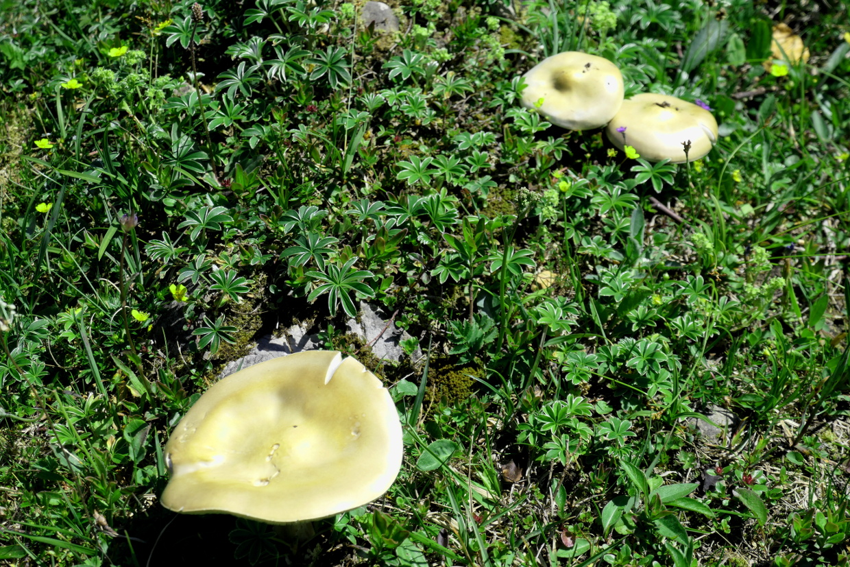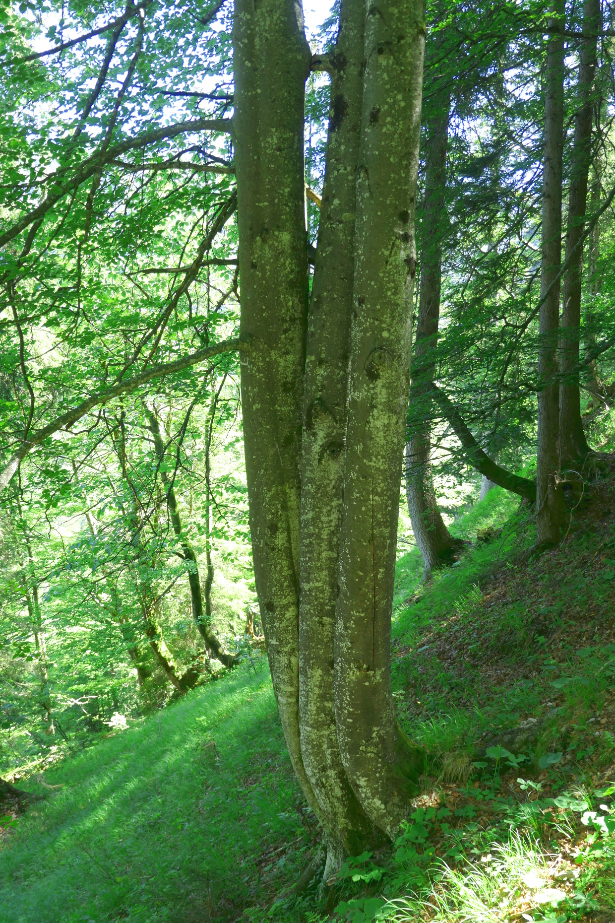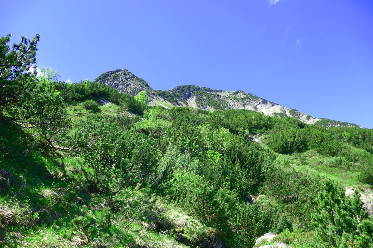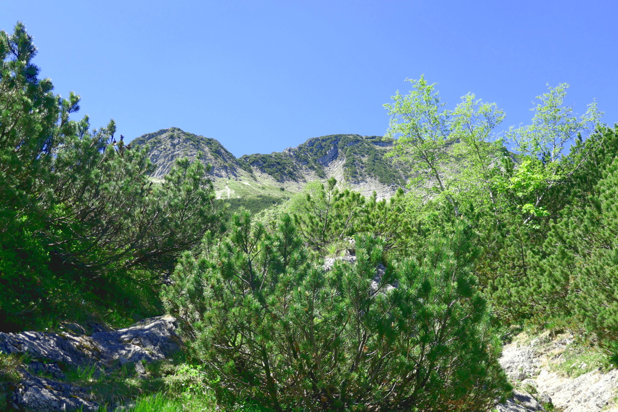 Auf der Wiese leuchten diese Pilze wie pures Gold in der Sonne. In meiner Kindheit hätte ich wahrscheinlich gewusst, was das für welche sind. Damals haben wir jedes Jahr kiloweise Pilze gesammelt. Aber von denen lasse ich dann doch lieber die Finger. Nachdem ich die Mulde durchquert habe, genieße ich nochmal einen letzten Blick auf den Gipfel, bevor ich wieder in den Wald eintauche. Dort beginnt dann der Steig, der mich ins Tal bringen wird. Dieser Pfad durch den Bärensteiggraben ist an manchen Stellen recht steil, aber das sind nur kurze Stücke zwischen den langgezogenen Serpentinen.