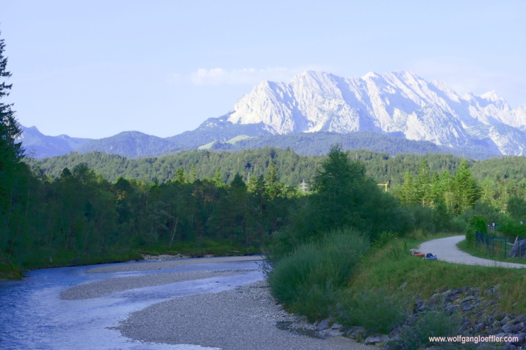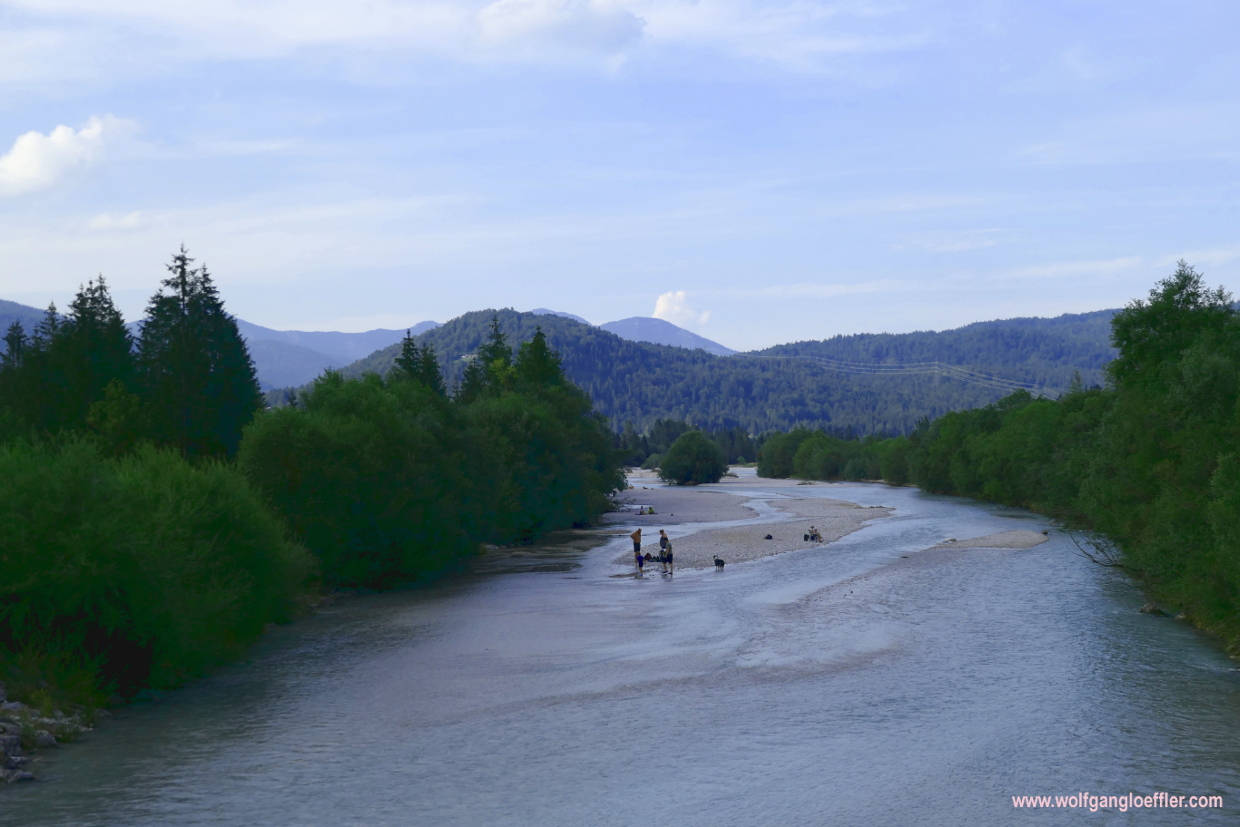 Am Ende ist die Wolke dann doch wieder weiter gezogen und erreiche trockenen Fußes den Parkplatz. In der Isar in Krün baden noch einige Menschen. Inzwischen ist es 18:00 Uhr und immer noch recht heiß und schwül. Perfekt für eine Erfrischung im Wasser. Aber nach fast 10 Stunden Wandern will ich nur noch nach Hause. Schließlich habe ich noch 1,5 Stunden Fahrt vor mir.