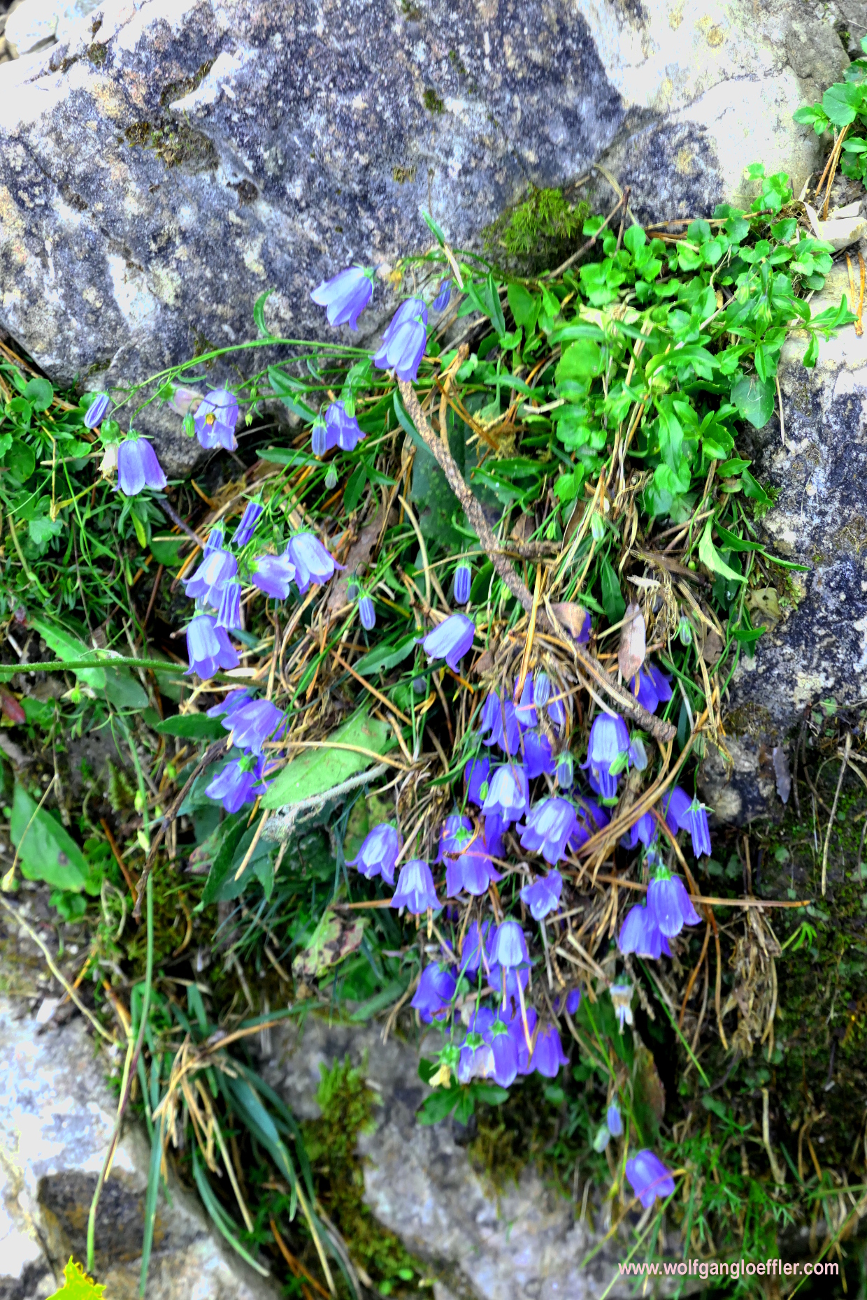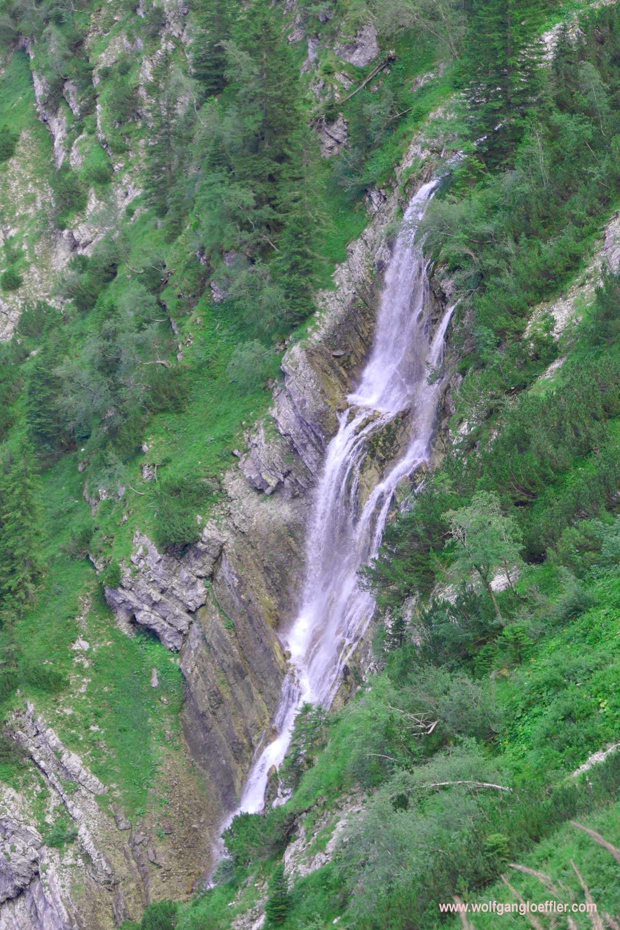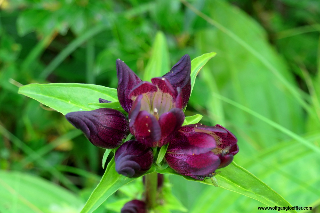 Nur wenige Schritte später stelle ich fest, dass ich mich richtig entschieden habe. Bereits auf der Hütte habe ich das Rauschen von Wasser gehört, konnte aber nicht fest stellen wo es herkommt. Aber kurz nachdem ich auf den Lakaiensteig abgebogen bin, sehe ich den Grund für das Rauschen. Ein großer Wasserfall stürzt nur knapp unterhalb der Hütte ins Tal, das komplett angefüllt ist von dem Getöse. Noch ein paar Schritte weiter stolpere ich über diesen lilafarbenen Enzian. Das ist Ostalpenenzian oder botanisch Pannonica. Den sehe ich heute zum ersten Mal. Wenn ihr schon ein paar meiner Posts gelesen habt, wisst ihr, dass ich Enzian in allen Formen und Farben liebe.