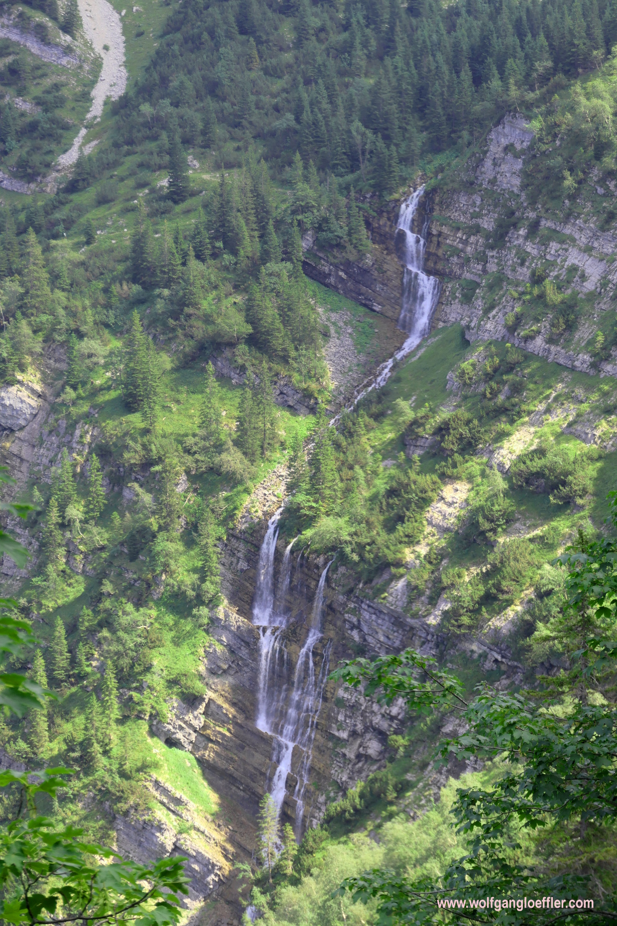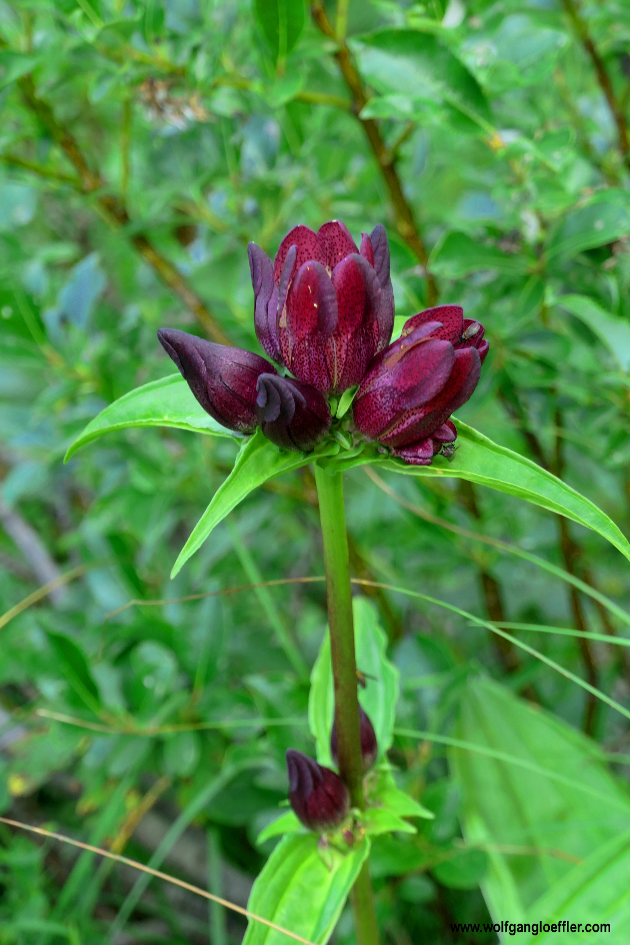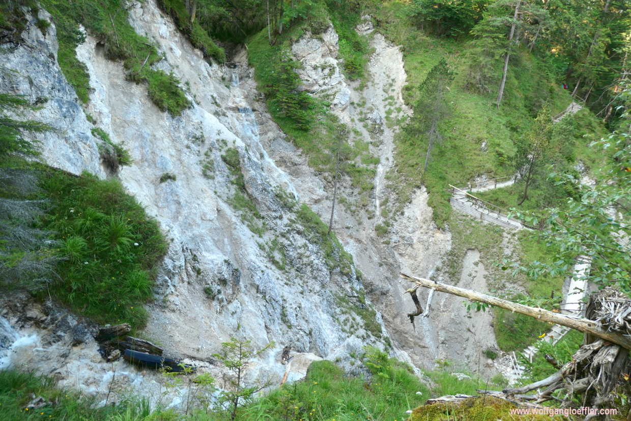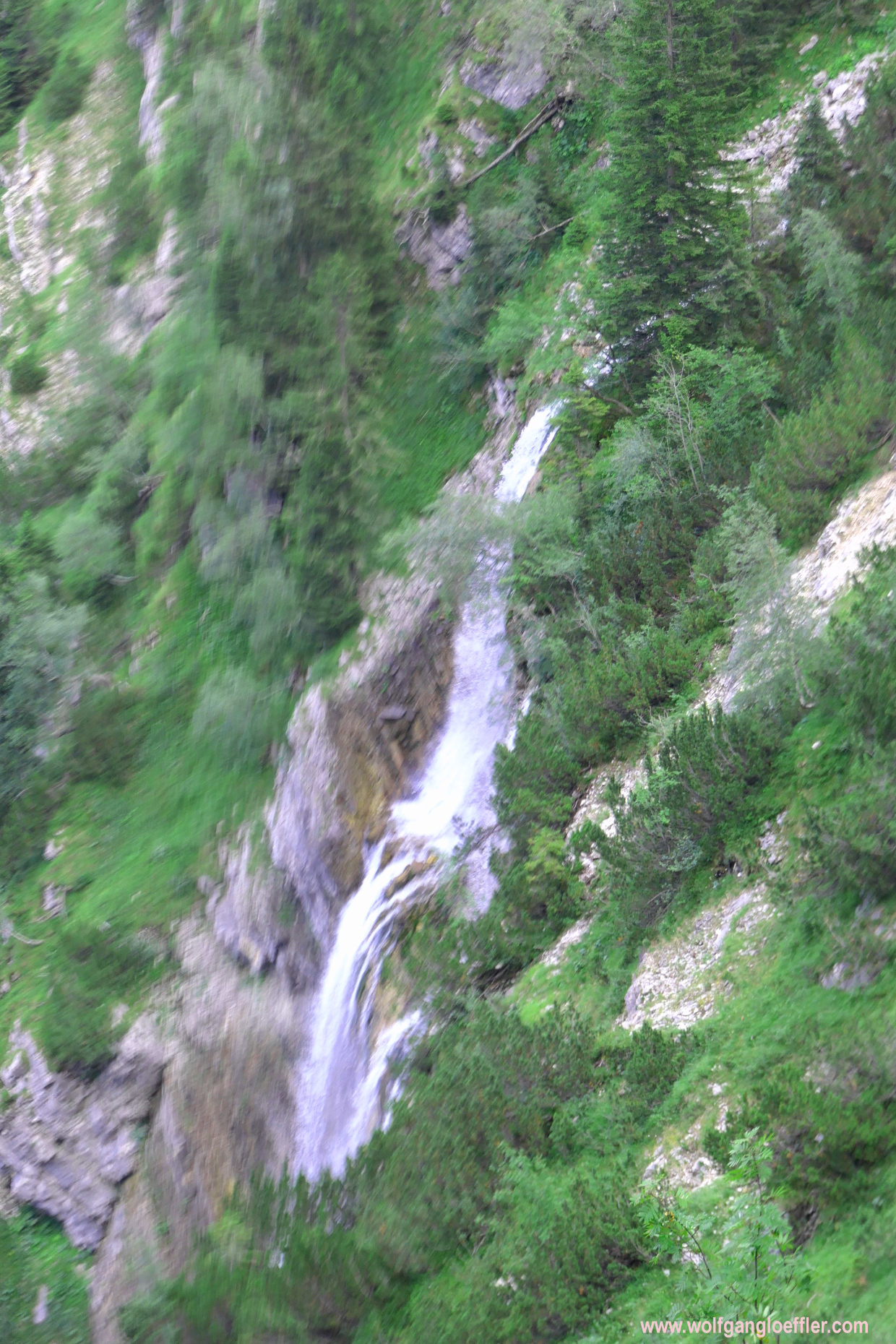 Nur wenige Schritte später stelle ich fest, dass ich mich richtig entschieden habe. Bereits auf der Hütte habe ich das Rauschen von Wasser gehört, konnte aber nicht fest stellen wo es herkommt. Aber kurz nachdem ich auf den Lakaiensteig abgebogen bin, sehe ich den Grund für das Rauschen. Ein großer Wasserfall stürzt nur knapp unterhalb der Hütte ins Tal, das komplett angefüllt ist von dem Getöse. Noch ein paar Schritte weiter stolpere ich über diesen lilafarbenen Enzian. Das ist Ostalpenenzian oder botanisch Pannonica. Den sehe ich heute zum ersten Mal. Wenn ihr schon ein paar meiner Posts gelesen habt, wisst ihr, dass ich Enzian in allen Formen und Farben liebe.