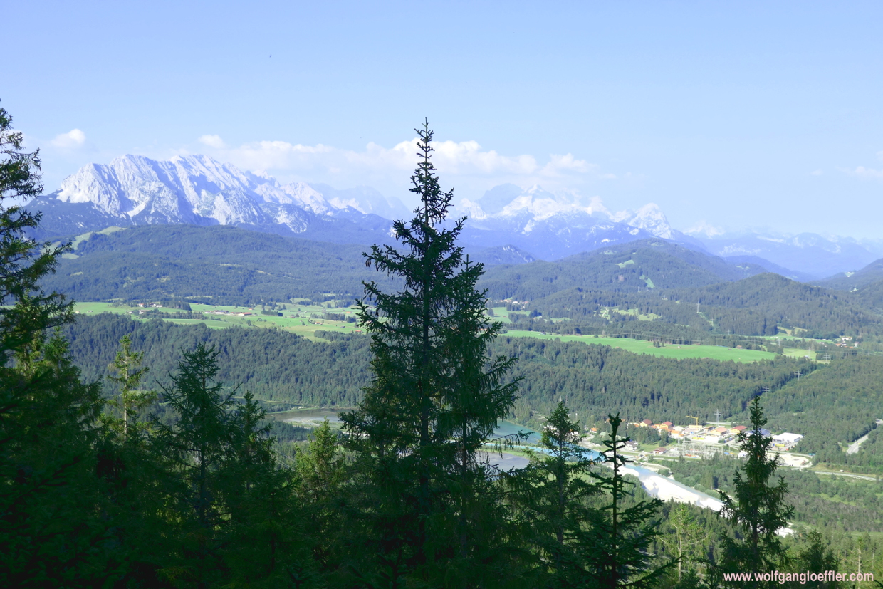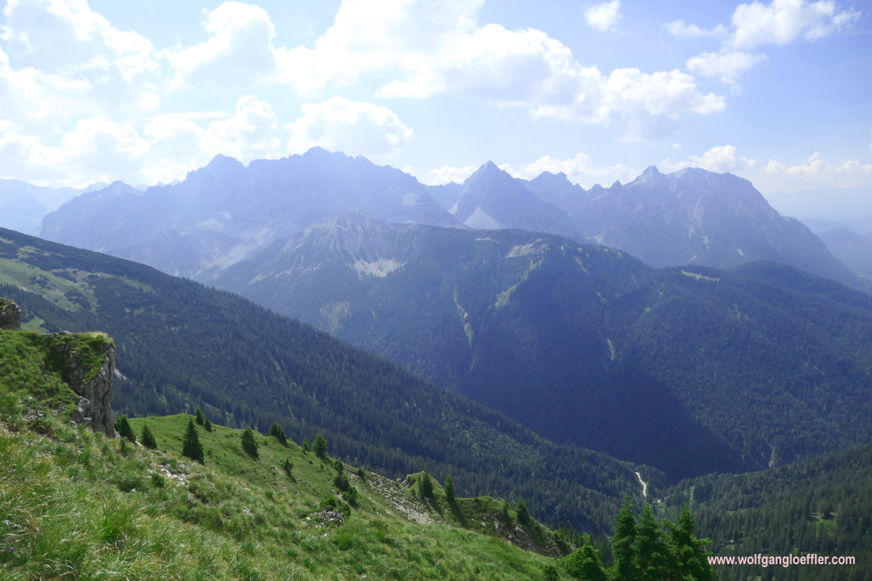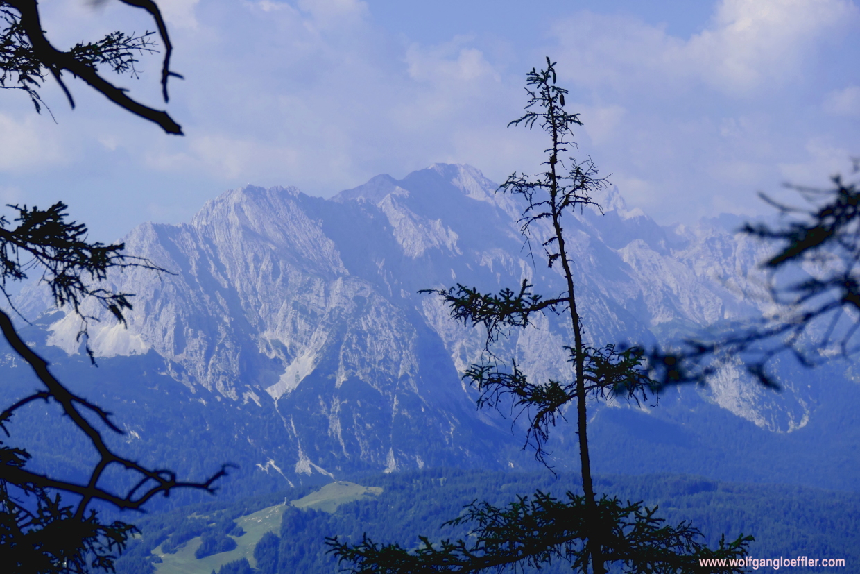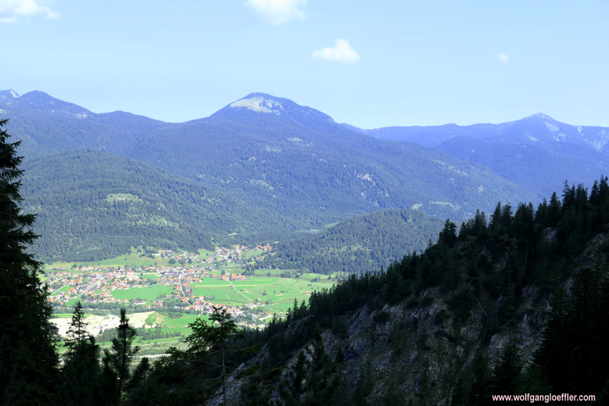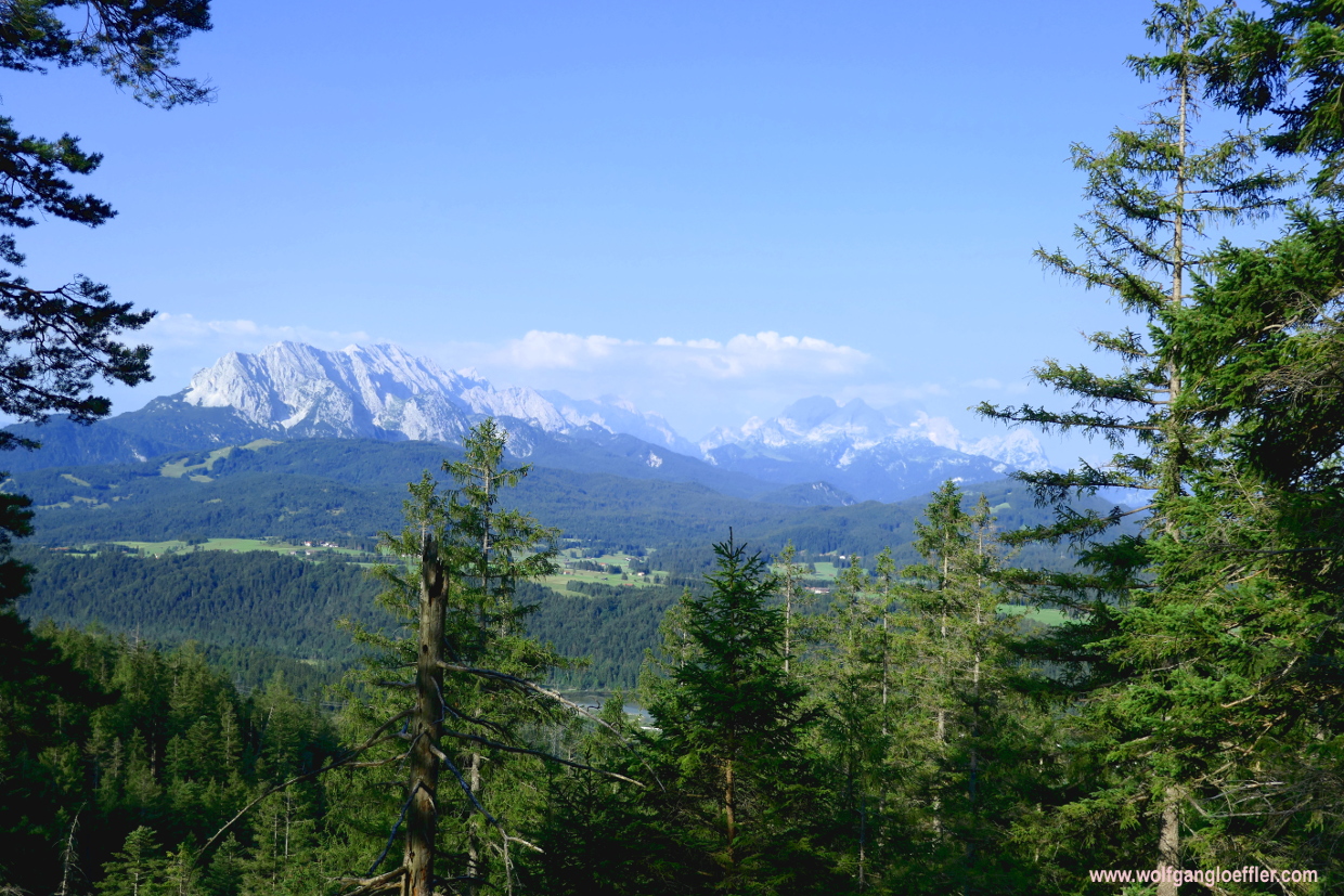 Der kleine Umweg vom Schwarzkopf zu diesem Aussichtspunkt hat sich echt gelohnt. Etwas später erreiche ich dann eine Lichtung, von der ich einen tollen Blick auf die Karwendelspitze in Mittenwald habe. Sehr beeindruckend! Die schroffen Felsengipfel dieser Region versetzen mich immer wieder in Staunen. Vor allem, wenn ich dann beim Begehen sehe, was für eine abwechslungsreiche Flora und Fauna dort zu Hause ist.
