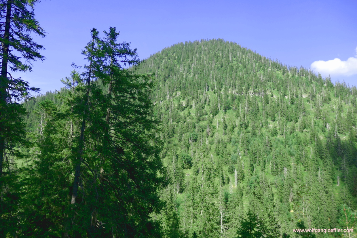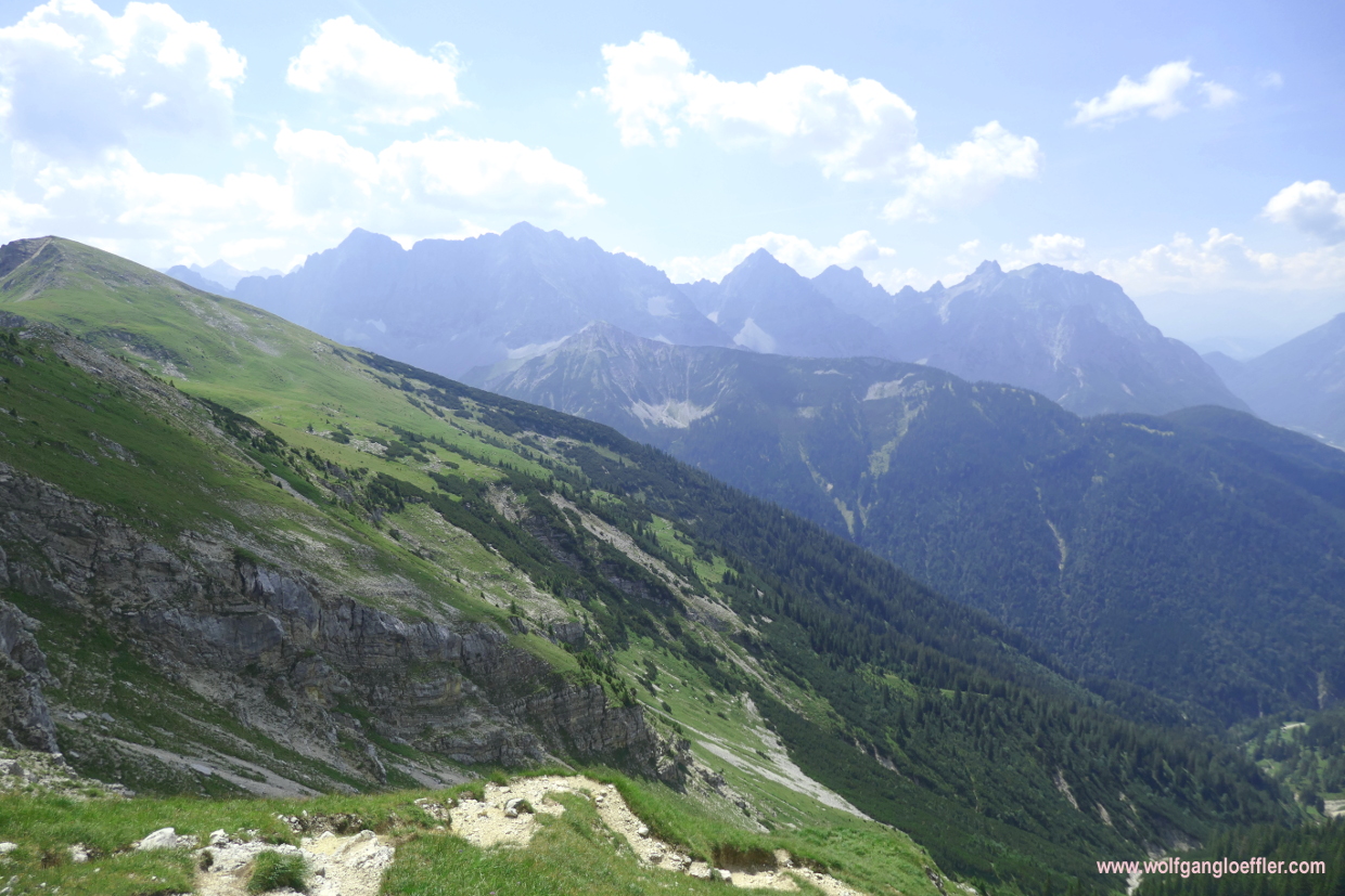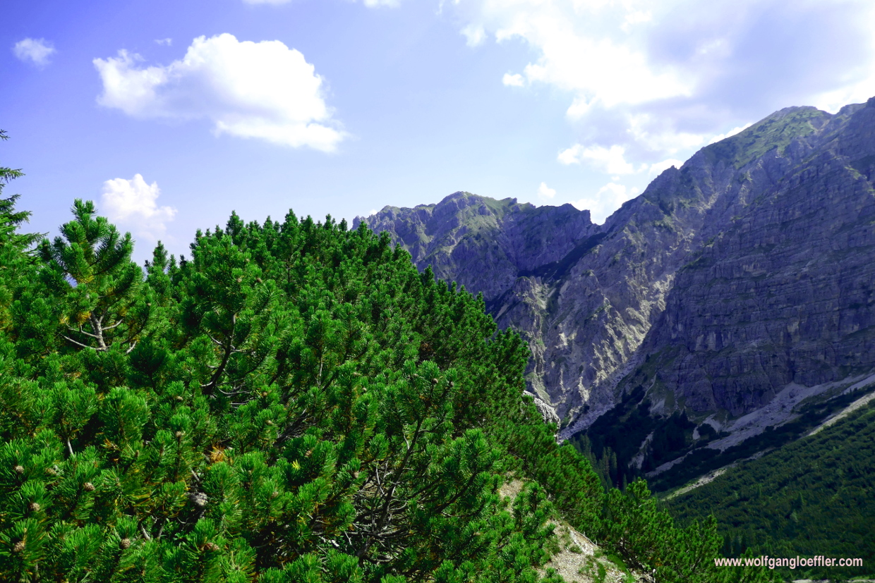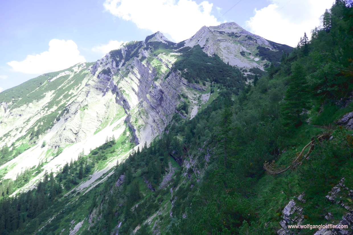 Der kleine Umweg vom Schwarzkopf zu diesem Aussichtspunkt hat sich echt gelohnt. Etwas später erreiche ich dann eine Lichtung, von der ich einen tollen Blick auf die Karwendelspitze in Mittenwald habe. Sehr beeindruckend! Die schroffen Felsengipfel dieser Region versetzen mich immer wieder in Staunen. Vor allem, wenn ich dann beim Begehen sehe, was für eine abwechslungsreiche Flora und Fauna dort zu Hause ist.