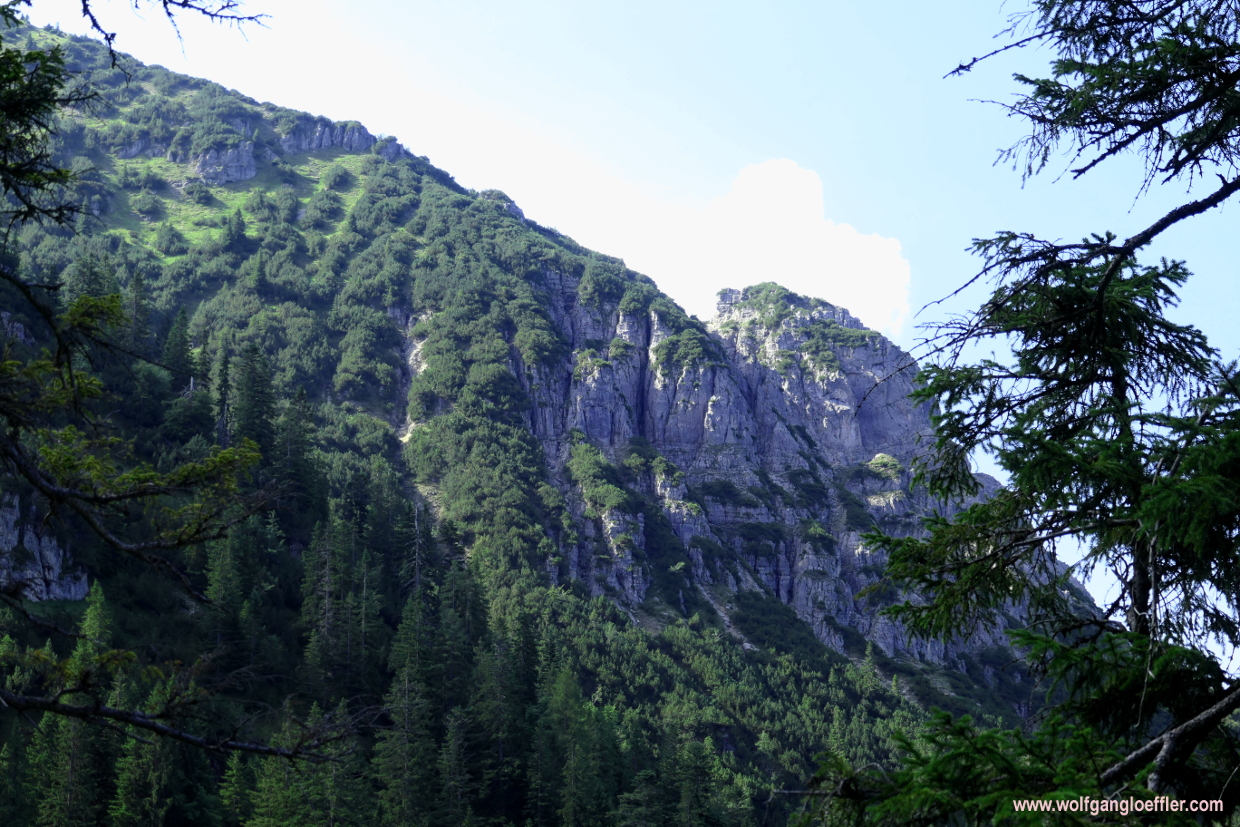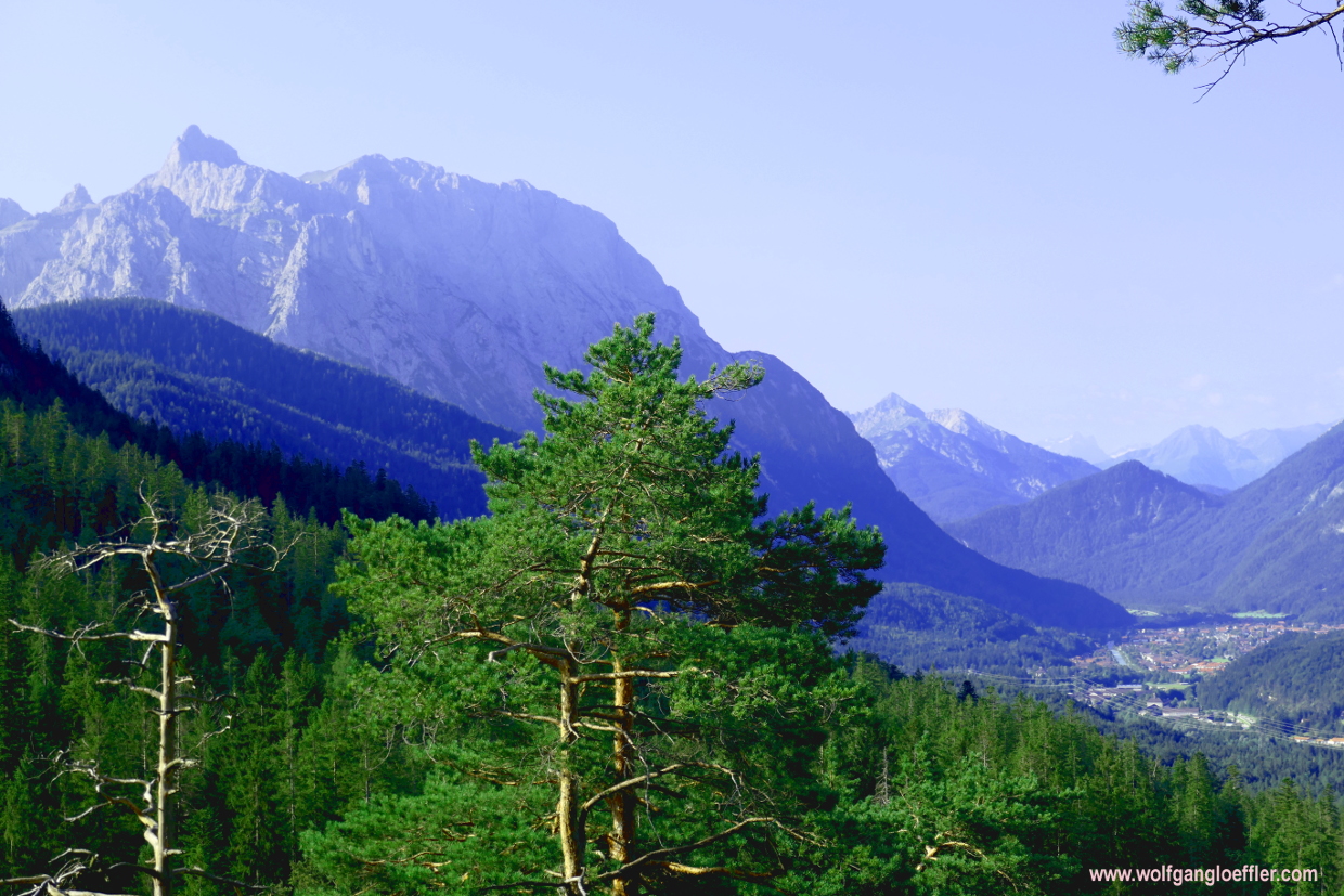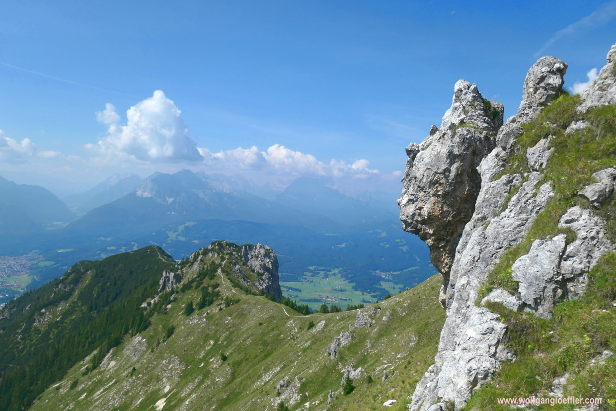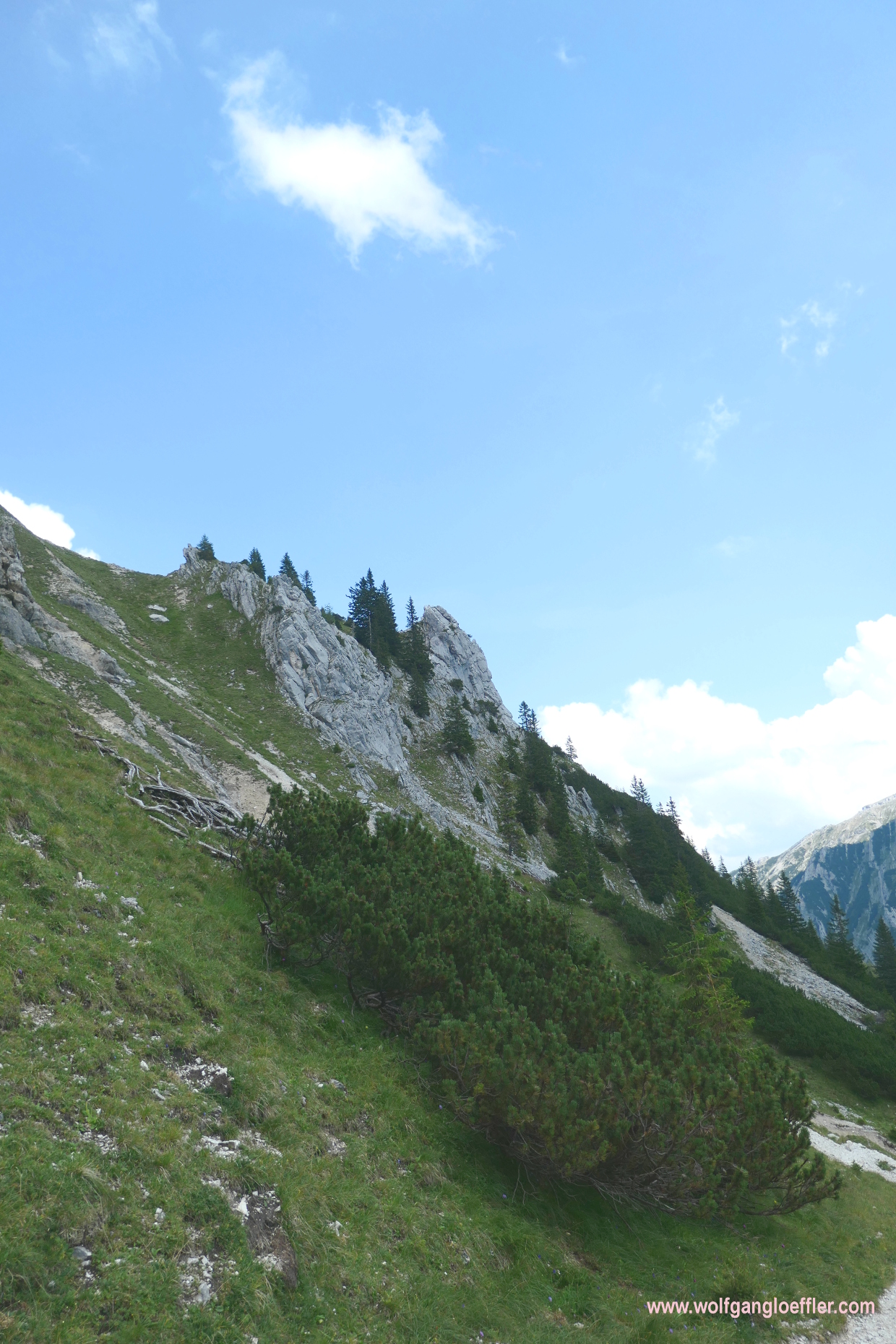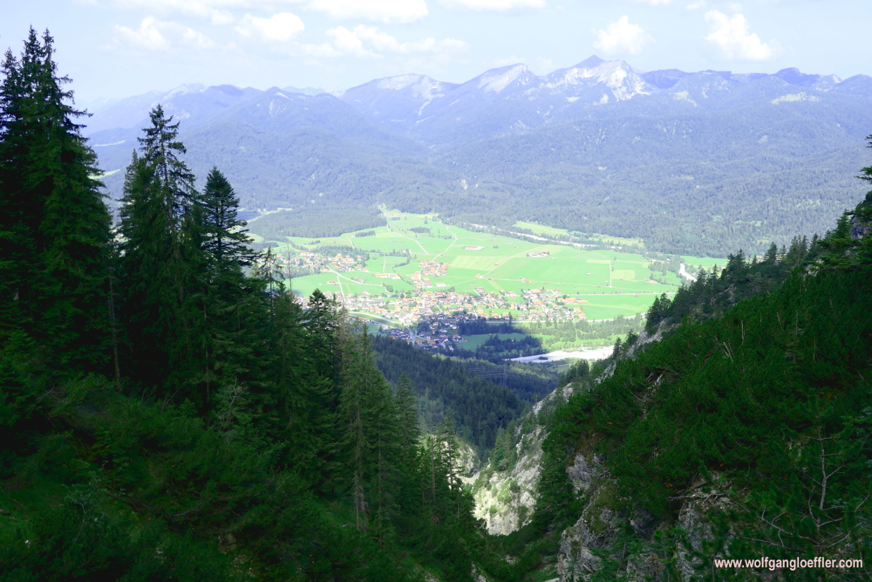 Der kleine Umweg vom Schwarzkopf zu diesem Aussichtspunkt hat sich echt gelohnt. Etwas später erreiche ich dann eine Lichtung, von der ich einen tollen Blick auf die Karwendelspitze in Mittenwald habe. Sehr beeindruckend! Die schroffen Felsengipfel dieser Region versetzen mich immer wieder in Staunen. Vor allem, wenn ich dann beim Begehen sehe, was für eine abwechslungsreiche Flora und Fauna dort zu Hause ist.