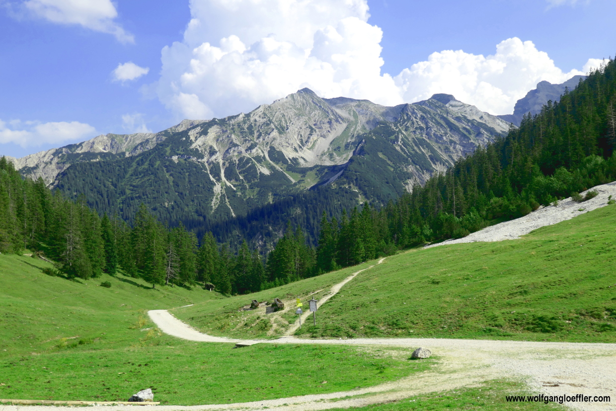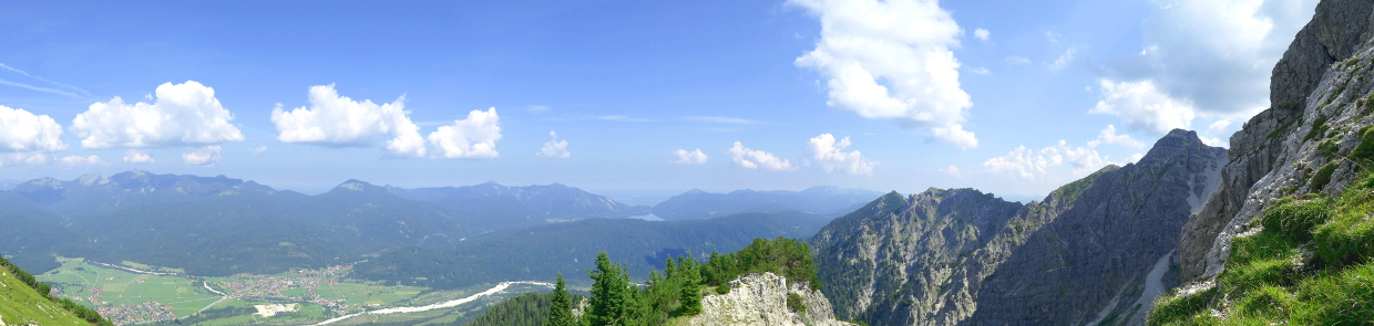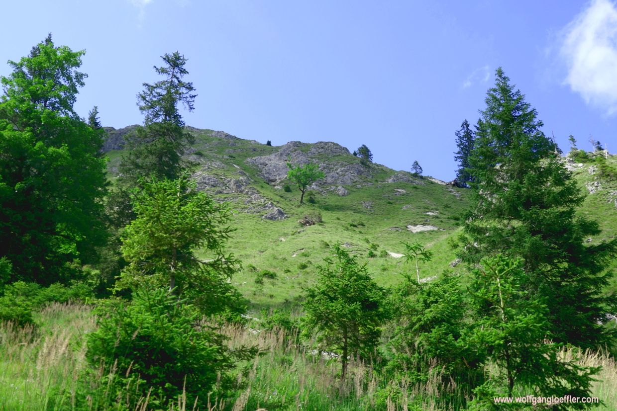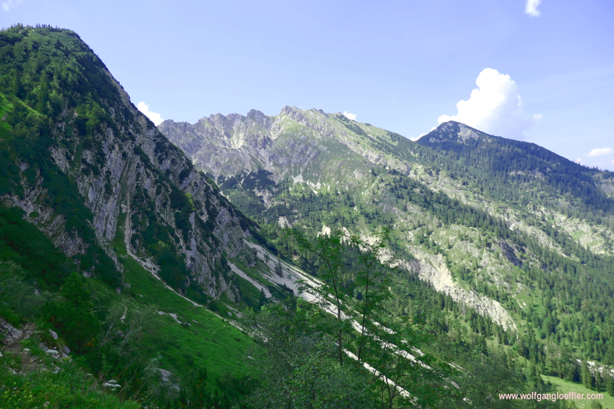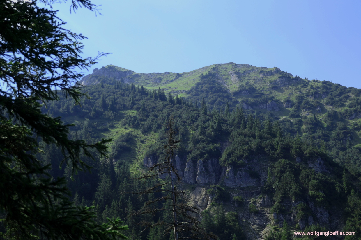 Der kleine Umweg vom Schwarzkopf zu diesem Aussichtspunkt hat sich echt gelohnt. Etwas später erreiche ich dann eine Lichtung, von der ich einen tollen Blick auf die Karwendelspitze in Mittenwald habe. Sehr beeindruckend! Die schroffen Felsengipfel dieser Region versetzen mich immer wieder in Staunen. Vor allem, wenn ich dann beim Begehen sehe, was für eine abwechslungsreiche Flora und Fauna dort zu Hause ist.