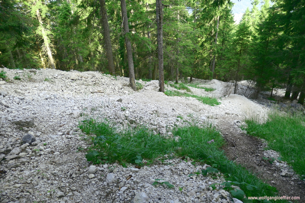 Irgendwann verliere ich das Zeitgefühl und trotz der kühlen Temperaturen am frühen Morgen wird mir warm. Aber das ist ja völlig normal und auch der Grund warum ich immer ein sauberes Shirt zum Wechseln im Rucksack habe. Plötzlich stehe ich vor diesem Geröllfeld. Hier muss vor gar nicht allzu langer Zeit eine Moräne abgegangen sein. Zu meinem Bedauern führt der Pfad in engen Kurven genau über dieses Geröll. Das ist ganz schön anstrengend und braucht recht lange bis ich das überquert habe.