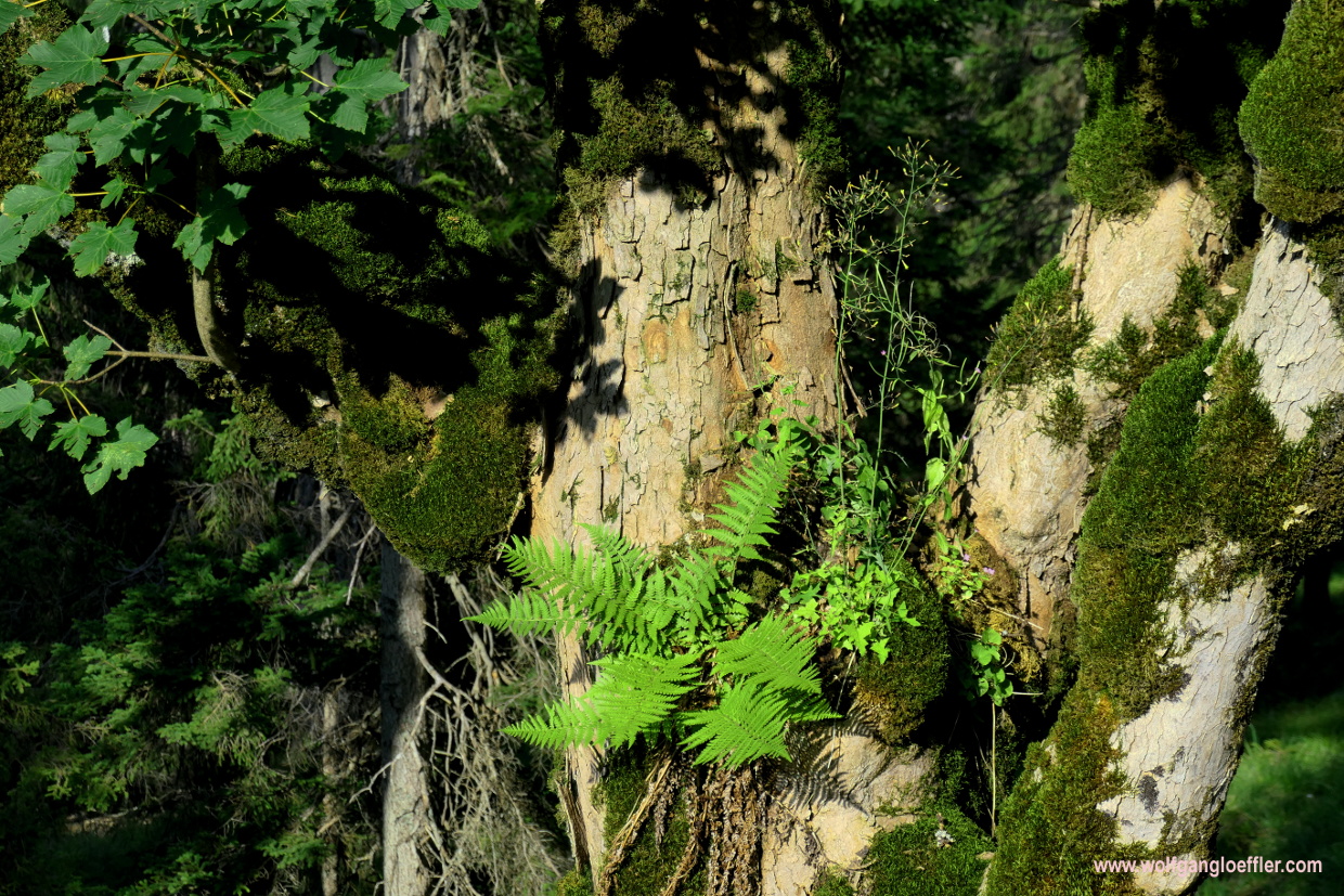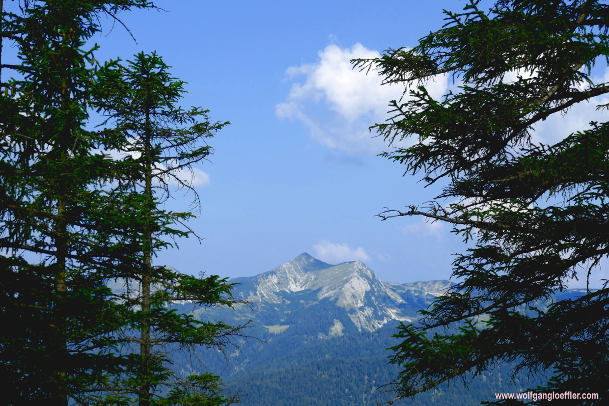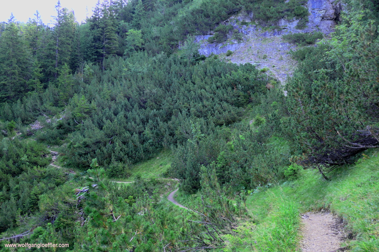 Aber nach einer Weile habe ich dann auch diesen Teil geschafft und wandere nun wieder auf einem weichen Pfad durch den Wald. Dieser wird nun etwas lichter und wandelt sich von Fichten zu Latschenkiefern. So kann ich auch öfters die tolle Aussicht bewundern. Die Qualen des Überquerens des Geröllfelds sind schnell vergessen und ich genieße frische, würzige Bergluft. Und endlich sehe ich auch wieder Blumen an Wegesrand.