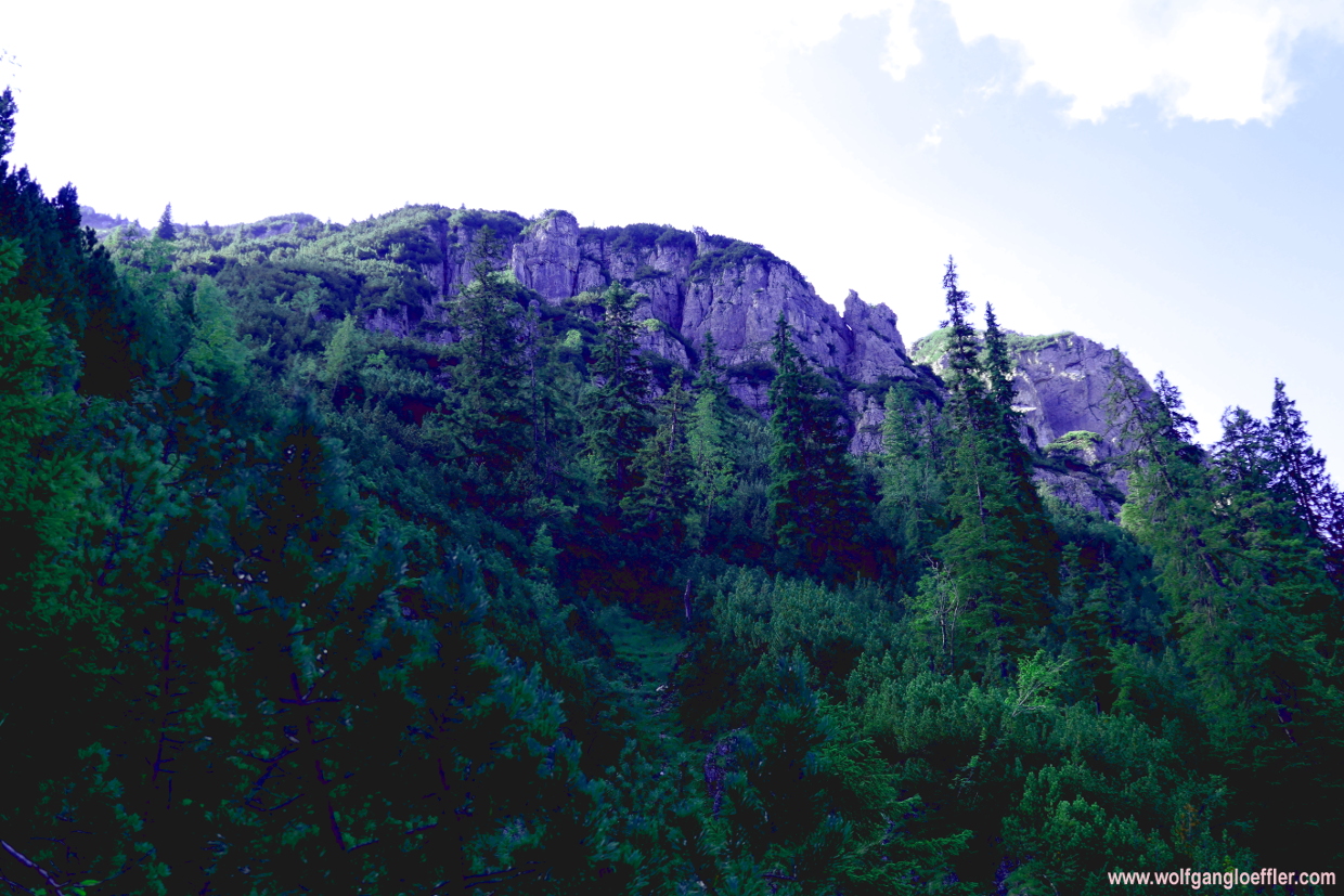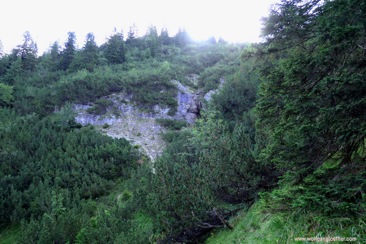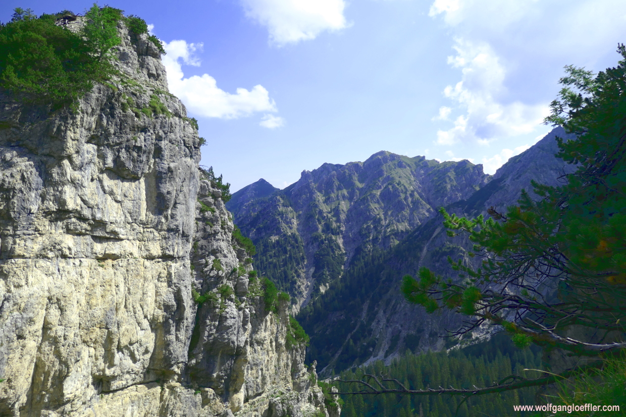 Der Weg führt nun an einer überwachsenen Felswand entlang. Es ist sehr sonnig, aber die Sicht ist heute nicht besonders gut. Die umliegenden Gipfel verschwinden immer mehr im Dunst. Für den Nachmittag sind Gewitter angekündigt. Dennoch ist die Aussicht der Wahnsinn. Da ich nun durch Latschenkiefernwald gehe kann ich diese des öfteren bewundern. Bis jetzt finde ich die Tour schon sehr gut. Genau die richtige Mischung aus Herausforderung und Abwechslung. Das obwohl ich noch nicht mal die Hälfte des Aufstiegs hinter mit habe.