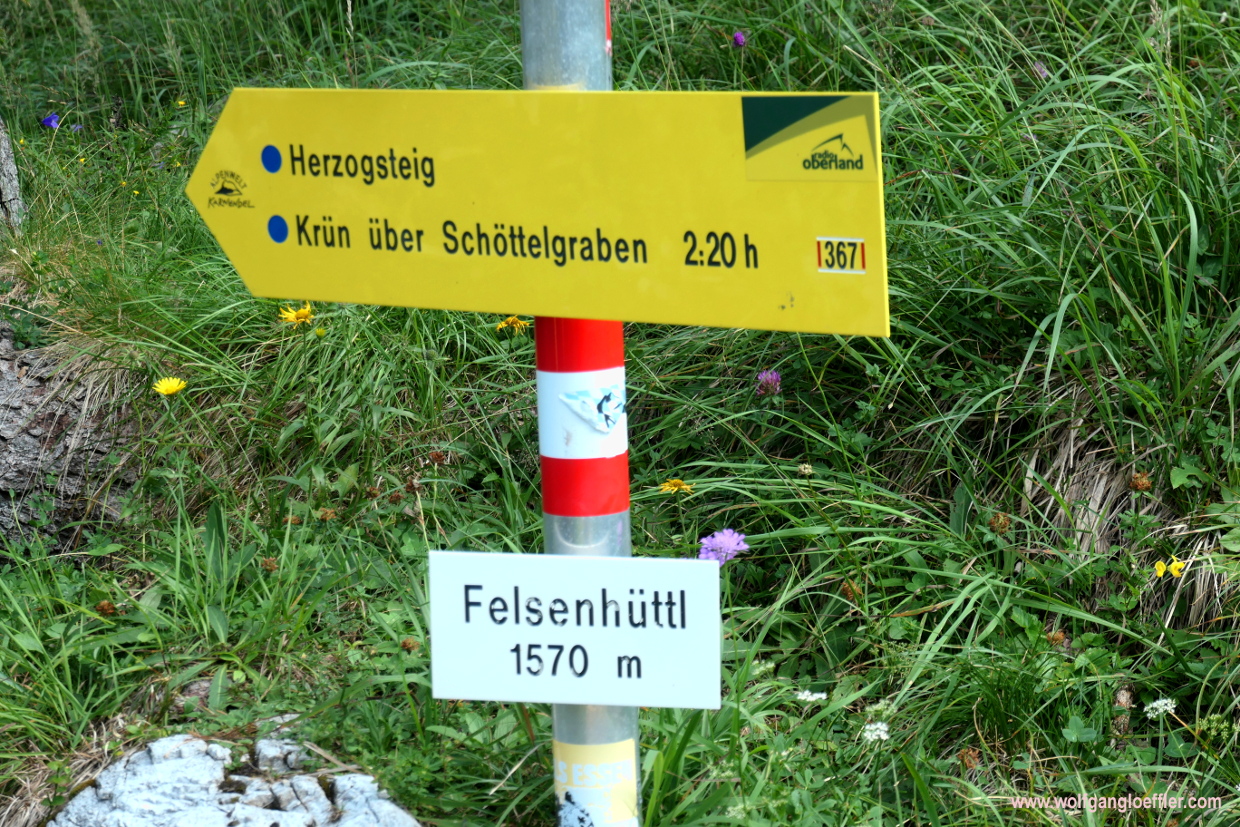 Am Ende der Gratüberquerung treffen sich die beiden Pfade wieder an der Schafkehre. Wenn ich zum Grat zurück blicke, frage ich mich, warum ich diesen anstrengenden Weg genommen habe. Aber eigentlich schaut es schlimmer aus, als es tatsächlich ist. Beim nächsten Schild lese ich, dass es immer noch 45 Minuten dauert, bis ich ganz oben stehe. Und das obwohl der Gipfel nun zum Greifen nahe ist. Inzwischen bin ich etwas erschöpft und zweifle ob ich noch einen weiteren Anstieg schaffen werde. Vor mir tut sich jetzt erstmal ein felsiger Durchlass auf, durch den ich wieder ein paar Meter tiefer gehen muss.