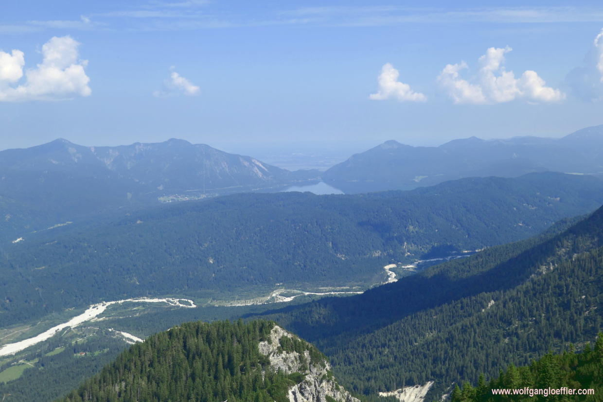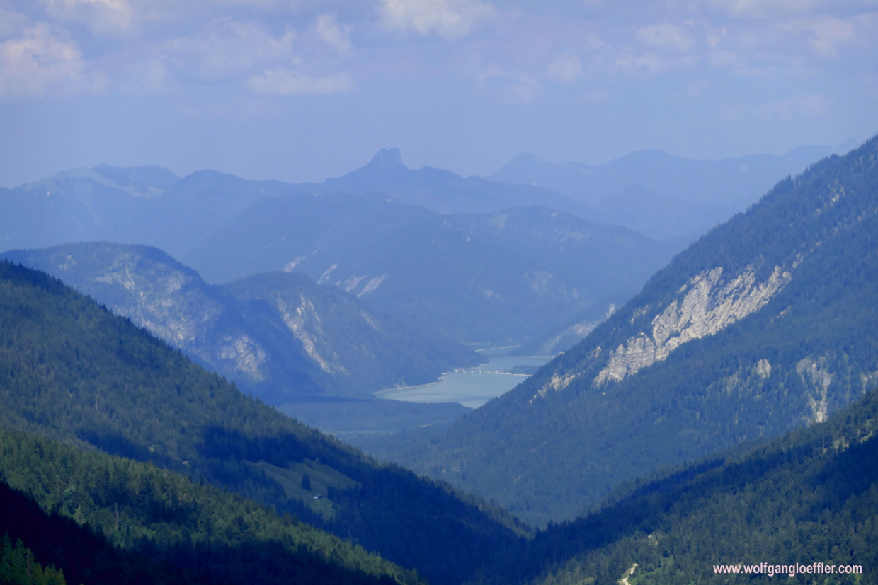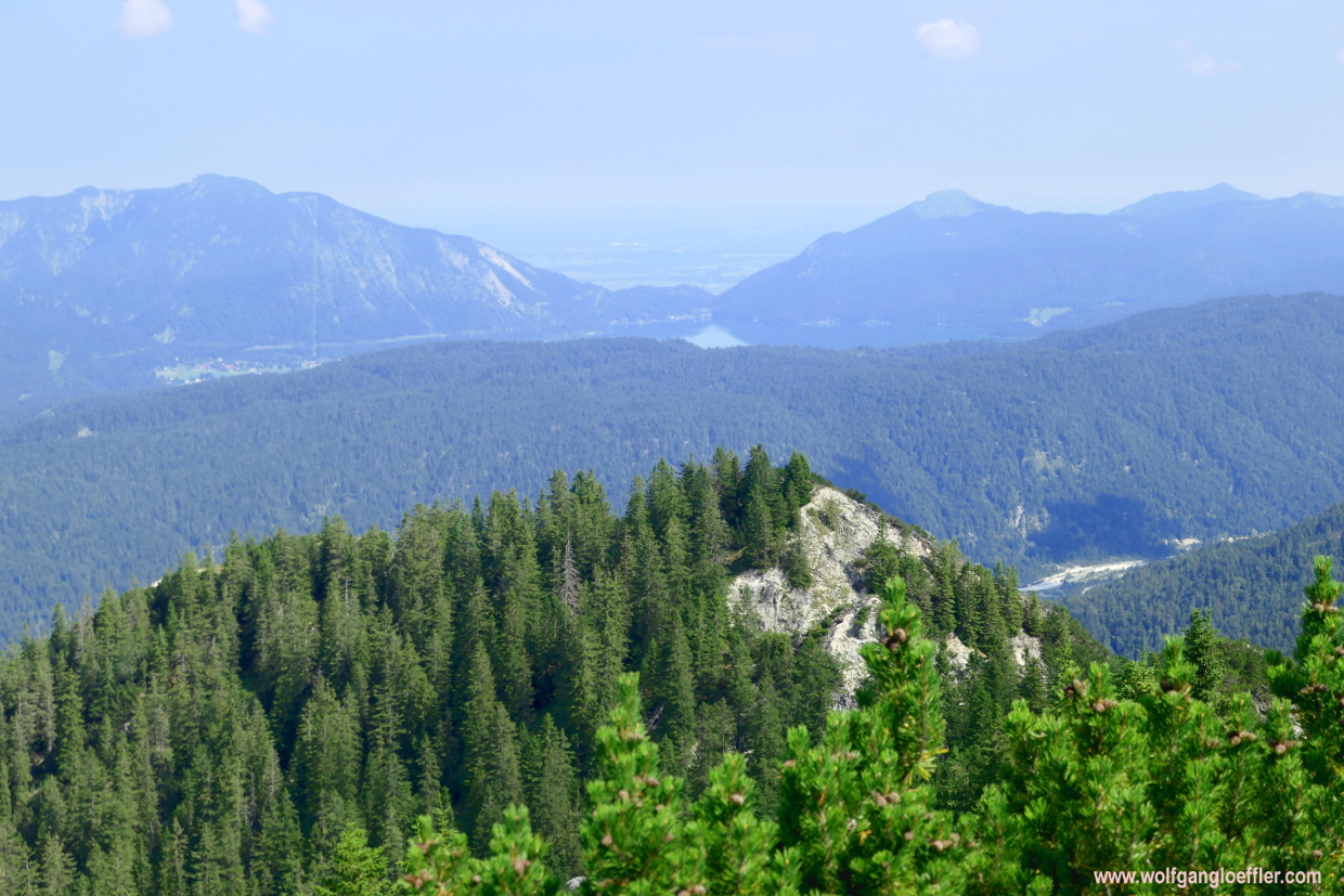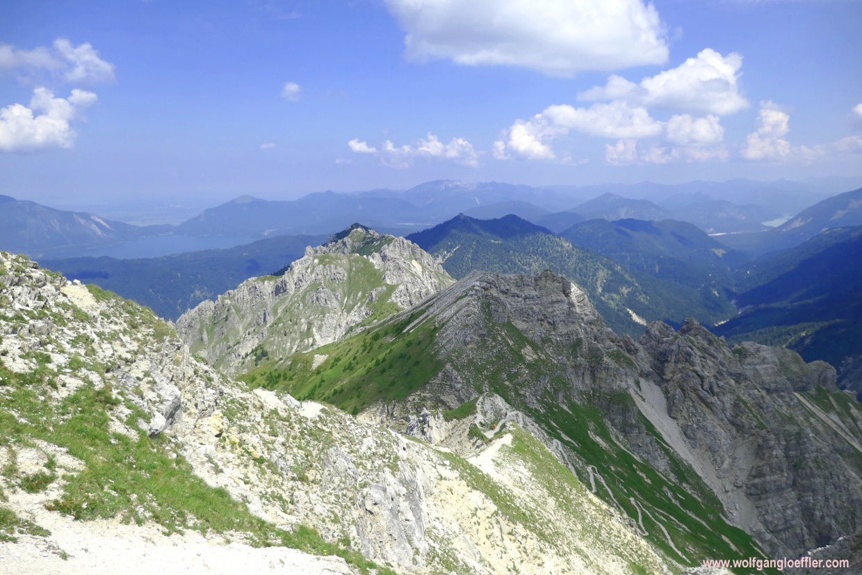 Kurz darauf erreiche ich die Baumgrenze und vor mir liegt der grasbewachsene Gipfel des Seinskopfes. Von hier habe ich wieder traumhafte Aussichten. Wenn ich mich umdrehe und hinter mich schaue, kann ich nun den Walchensee im Sonnenlicht schimmern sehen. An einem klaren Tag müsste ich jetzt weit ins Alpenvorland blicken können, aber das verschwindet heute im Dunst. Zu meiner Linken dominiert der Gipfel der Schöttelkarspitze das Bild. Und ich muss dem Wanderer recht geben. Der Anblick weiter unten war spektakulärer.