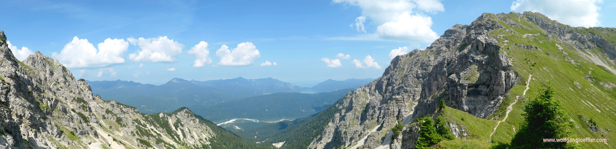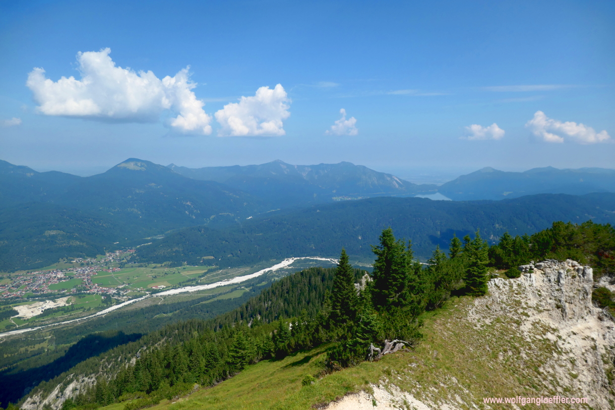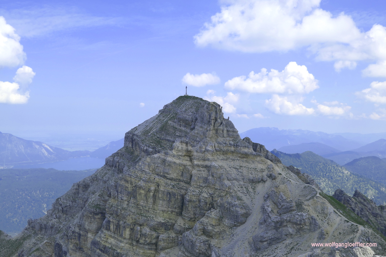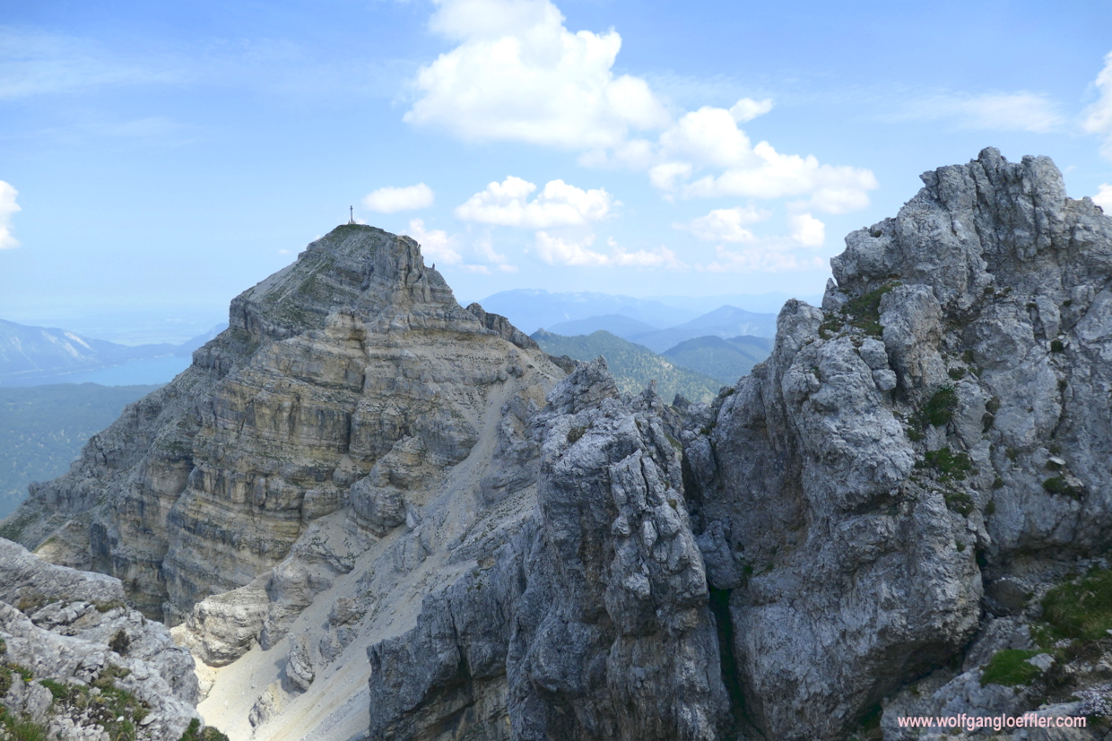 Kurz darauf erreiche ich die Baumgrenze und vor mir liegt der grasbewachsene Gipfel des Seinskopfes. Von hier habe ich wieder traumhafte Aussichten. Wenn ich mich umdrehe und hinter mich schaue, kann ich nun den Walchensee im Sonnenlicht schimmern sehen. An einem klaren Tag müsste ich jetzt weit ins Alpenvorland blicken können, aber das verschwindet heute im Dunst. Zu meiner Linken dominiert der Gipfel der Schöttelkarspitze das Bild. Und ich muss dem Wanderer recht geben. Der Anblick weiter unten war spektakulärer.