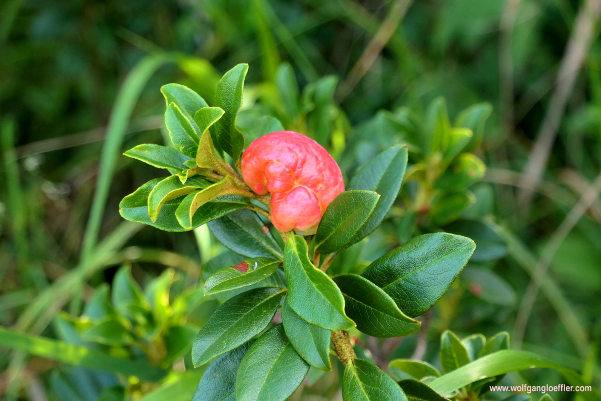 Der Pfad führt nun etwas steiler den Hang hinauf. Da ich unterhalb des Grats laufe, verlier ich die Schöttelkarspitze wieder aus den Augen. Dafür habe ich tolle Ausblicke über das Isartal und kann jetzt auch in der Ferne den Walchensee sehen. Einige der Alpenrosen hier haben so komische Blasen an ihren Ästen. Manche sind weiß, andere leuchten rot. Schaut interessant aus. Bei näherer Betrachtung bin ich davon überzeugt, dass das Nester von Gallwespen sind. Ich hoffe mal dass die Pflanzen das überleben.