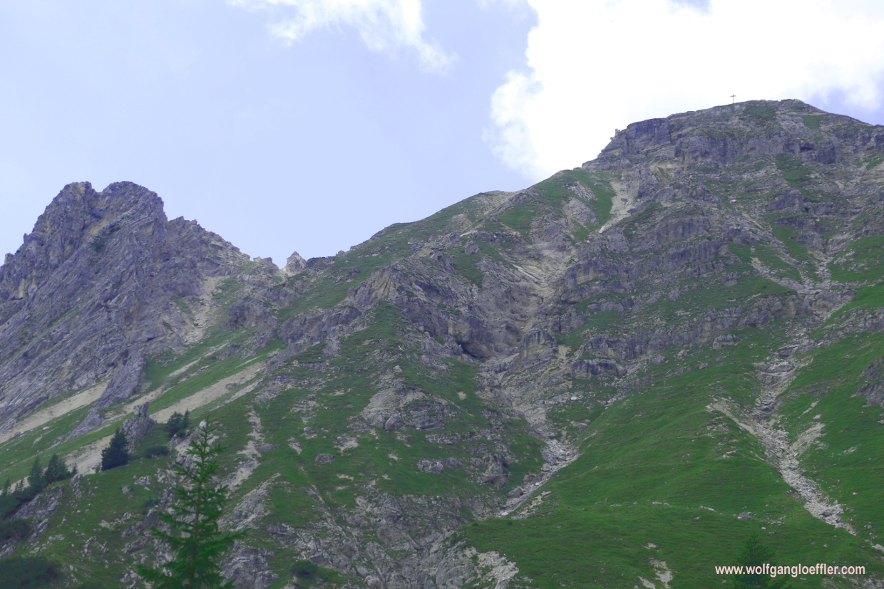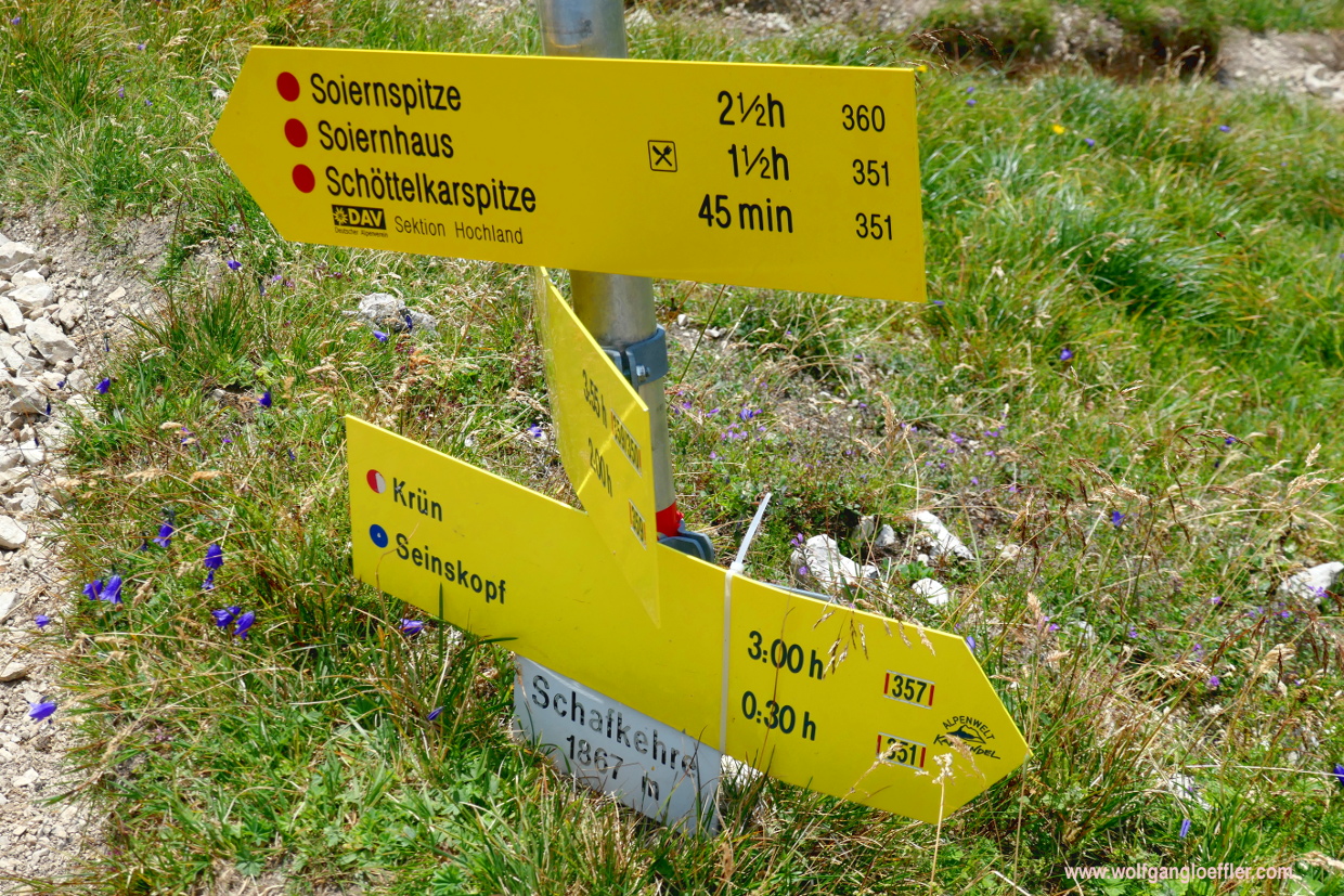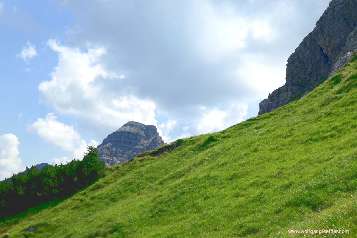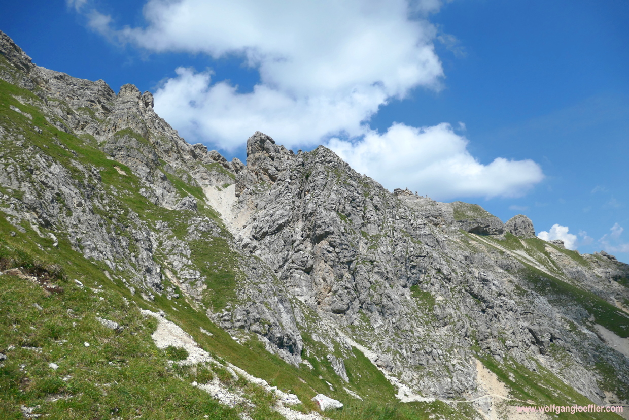 Wie aus dem Nichts ragt plötzlich der Gipfel des Signalkopfs vor mir über die Landschaft. Es wäre nur ein kurzer Umweg, aber ich vermute, dass ich mir noch etwas Kraft aufsparen muss für den Aufstieg zur Schöttelkarspitze. Außerdem gehe ich davon aus, dass ich von dort einen noch besseren Ausblick haben werde. Aber das wird noch ein Weilchen dauern, bis ich diesen Ausblick genießen kann.