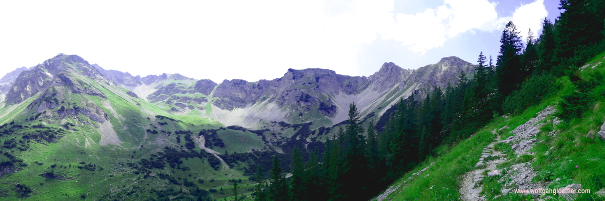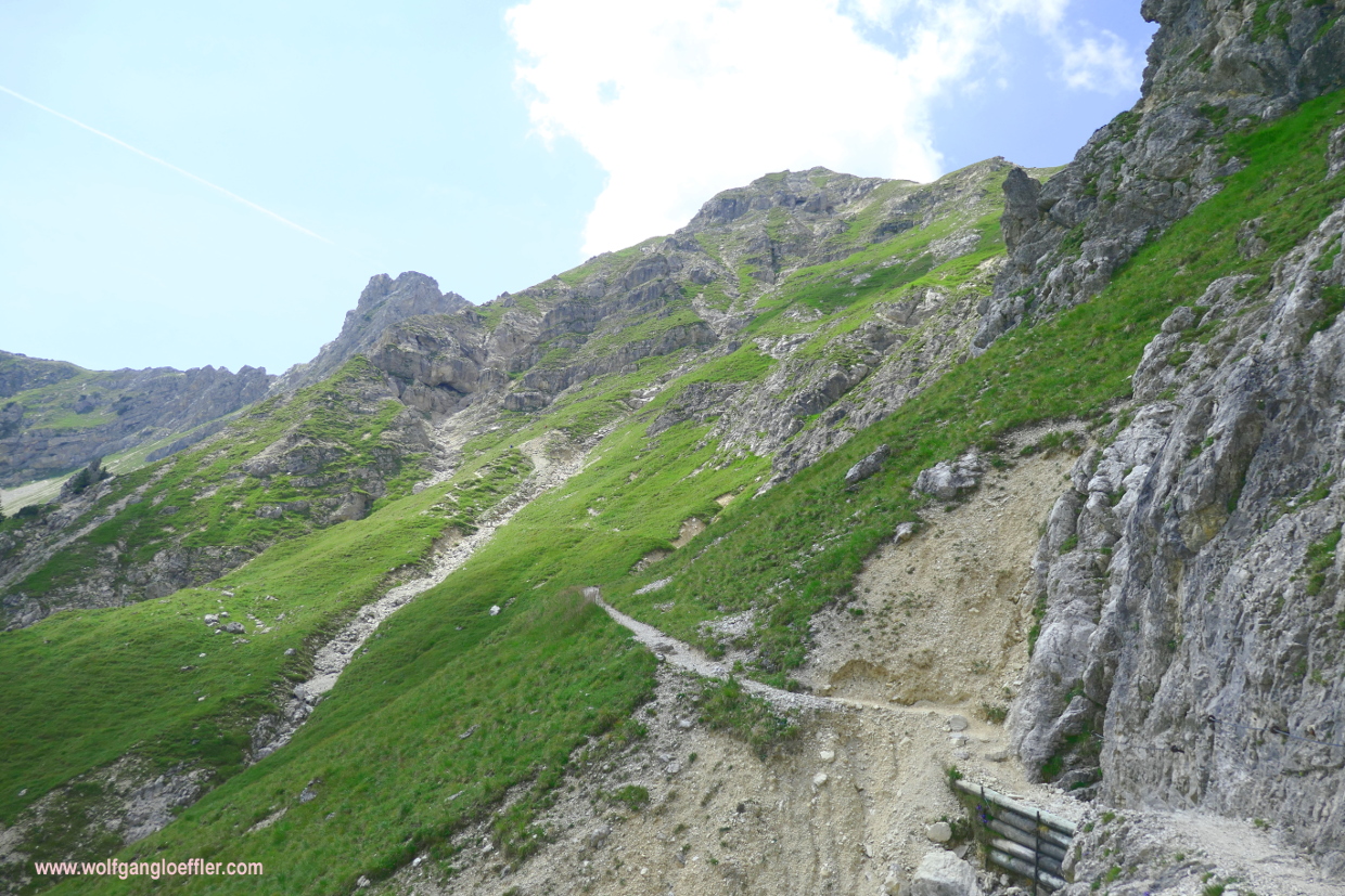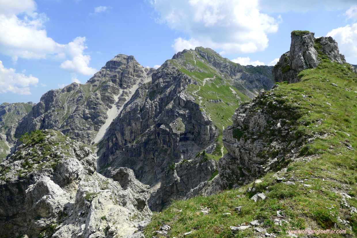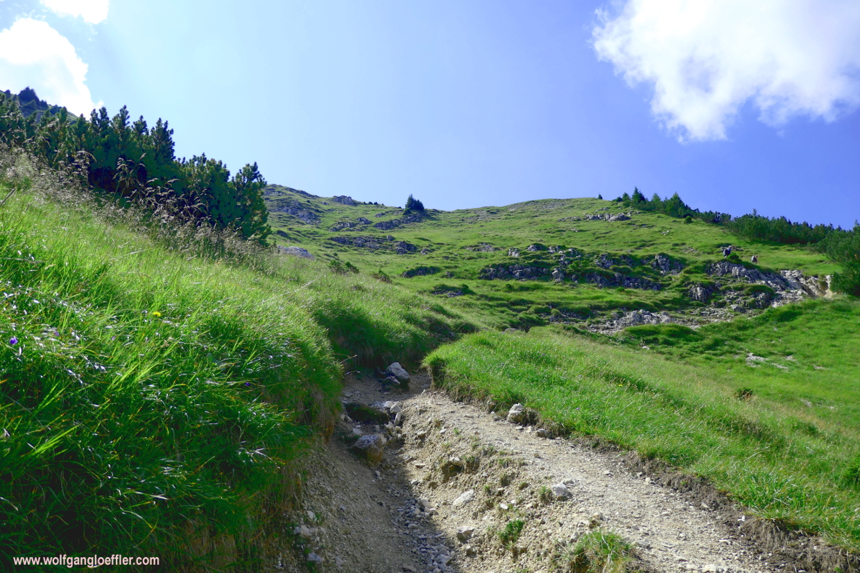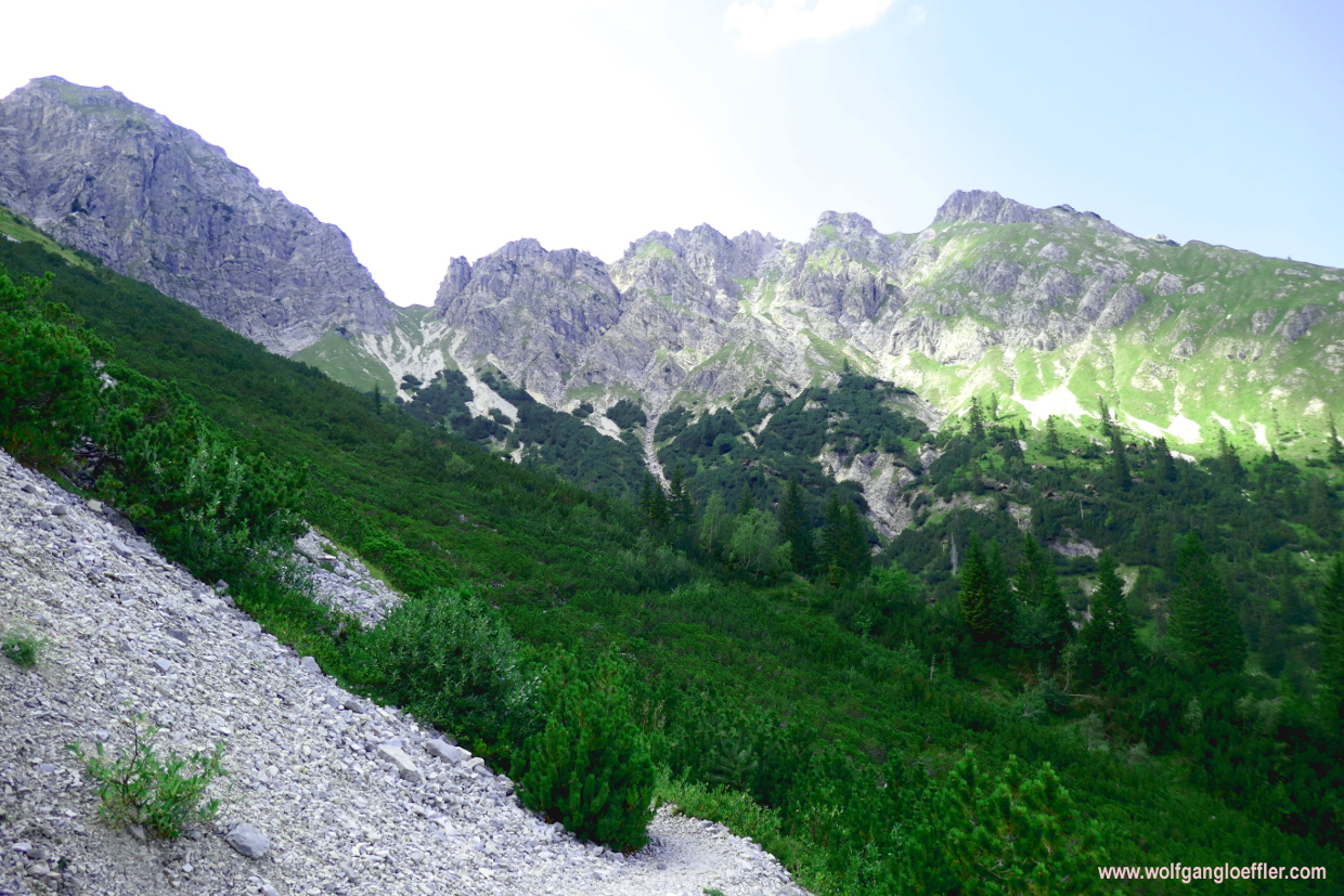 Wie aus dem Nichts ragt plötzlich der Gipfel des Signalkopfs vor mir über die Landschaft. Es wäre nur ein kurzer Umweg, aber ich vermute, dass ich mir noch etwas Kraft aufsparen muss für den Aufstieg zur Schöttelkarspitze. Außerdem gehe ich davon aus, dass ich von dort einen noch besseren Ausblick haben werde. Aber das wird noch ein Weilchen dauern, bis ich diesen Ausblick genießen kann.