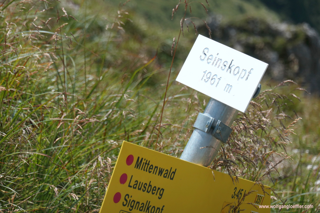 In weiten Serpentinen führt der Pfad nun durch das Gras und endlich erreiche ich dann den Gipfel des Seinskopfes mit genialer Aussicht über die Gegend. Im Süden sehe ich Mittenwald und die Karwendelspitze. Im Norden blicke ich über den Schöttelkopf zum Walchensee, Herzogstand und Heimgarten. Schade, dass die Sicht so diesig ist. Der Wegweiser zeigt mir, dass ich mich hier links halten muss. Offensichtlich gibt es zwei Wege zum Gipfel. Der eine verläuft etwas unterhalb des Grats, der zweite führt direkt darüber. Ich nehme den oberen Weg, würde euch aber empfehlen den unteren zu nehmen. Der ist einfacher zu gehen.