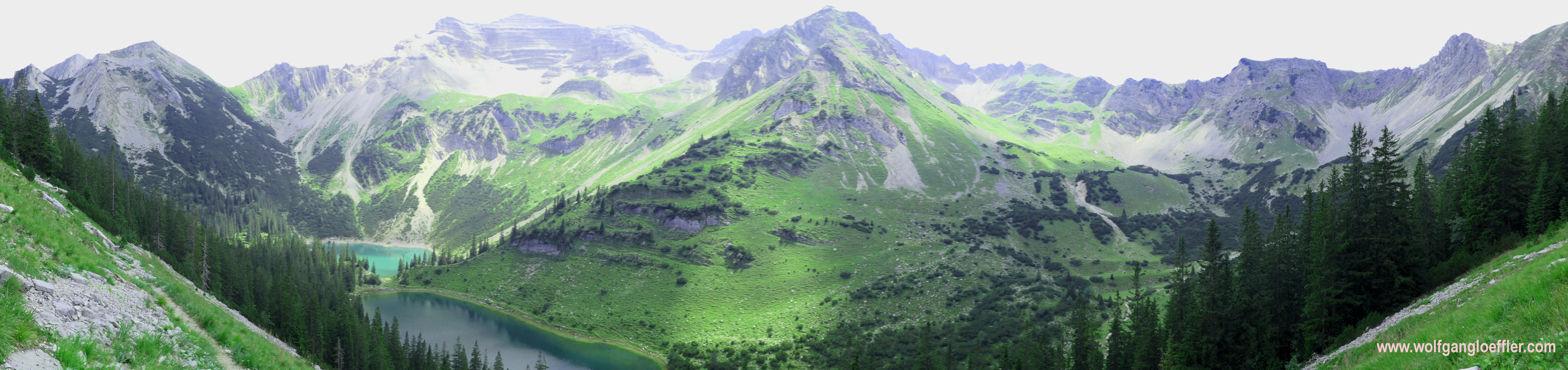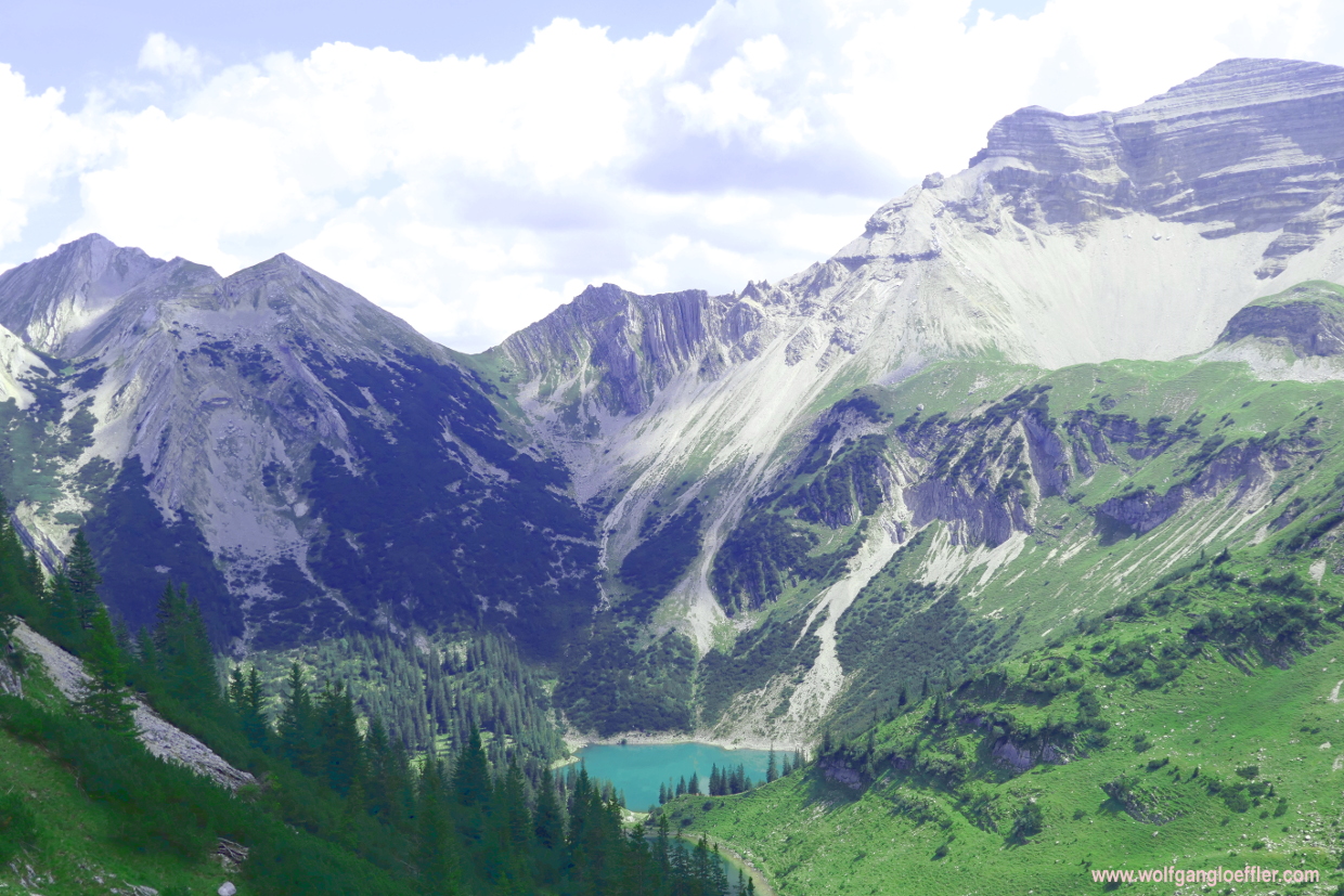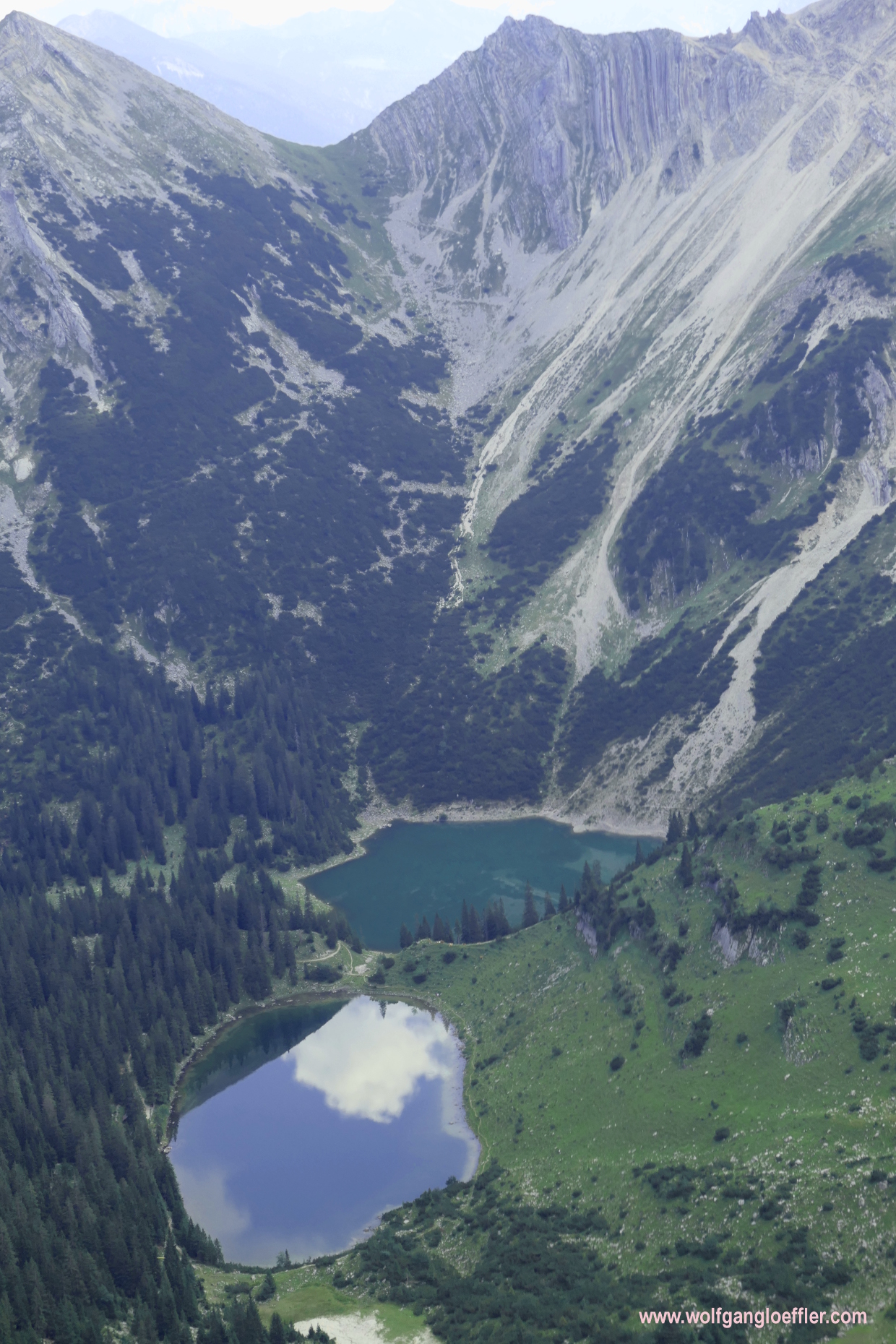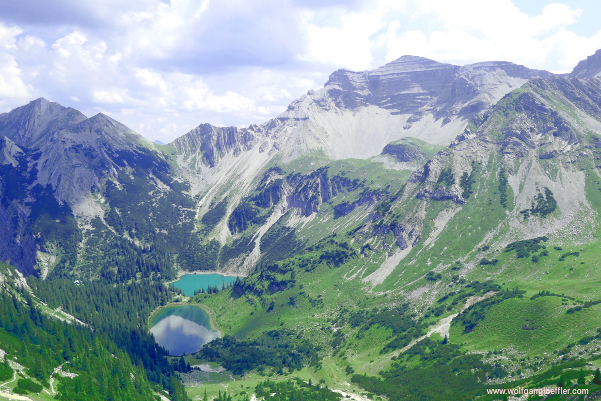 Hinter dem Durchlass führt der Pfad entlang einer Felswand, die sich neben und vor mir auftut. Nachdem ich diesen Abschnitt aber hinter mir gelassen habe, folgt der nächste WOW-Effekt dieser Tour. Vor mir öffnet sich nun das Soiernkar mit seinem majestätischen Gipfel und zwei Seen zu seinen Füßen. Was für ein Anblick! Dafür lohnt es sich doch den mühsamen Aufstieg auf sich zu nehmen. Da grad niemand auf dem Pfad unterwegs ist, genieße ich diese Aussicht ein Weilchen.
