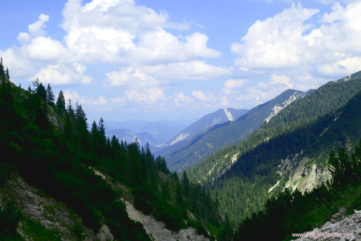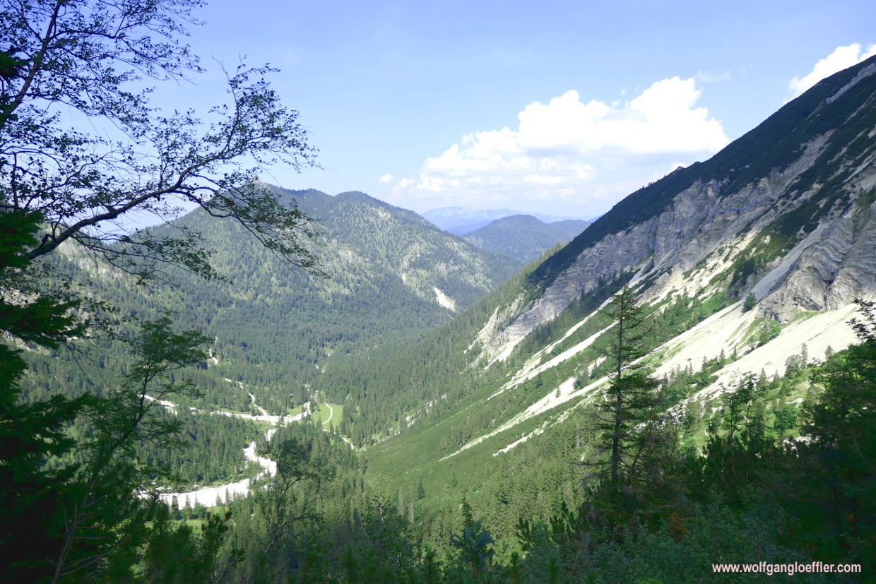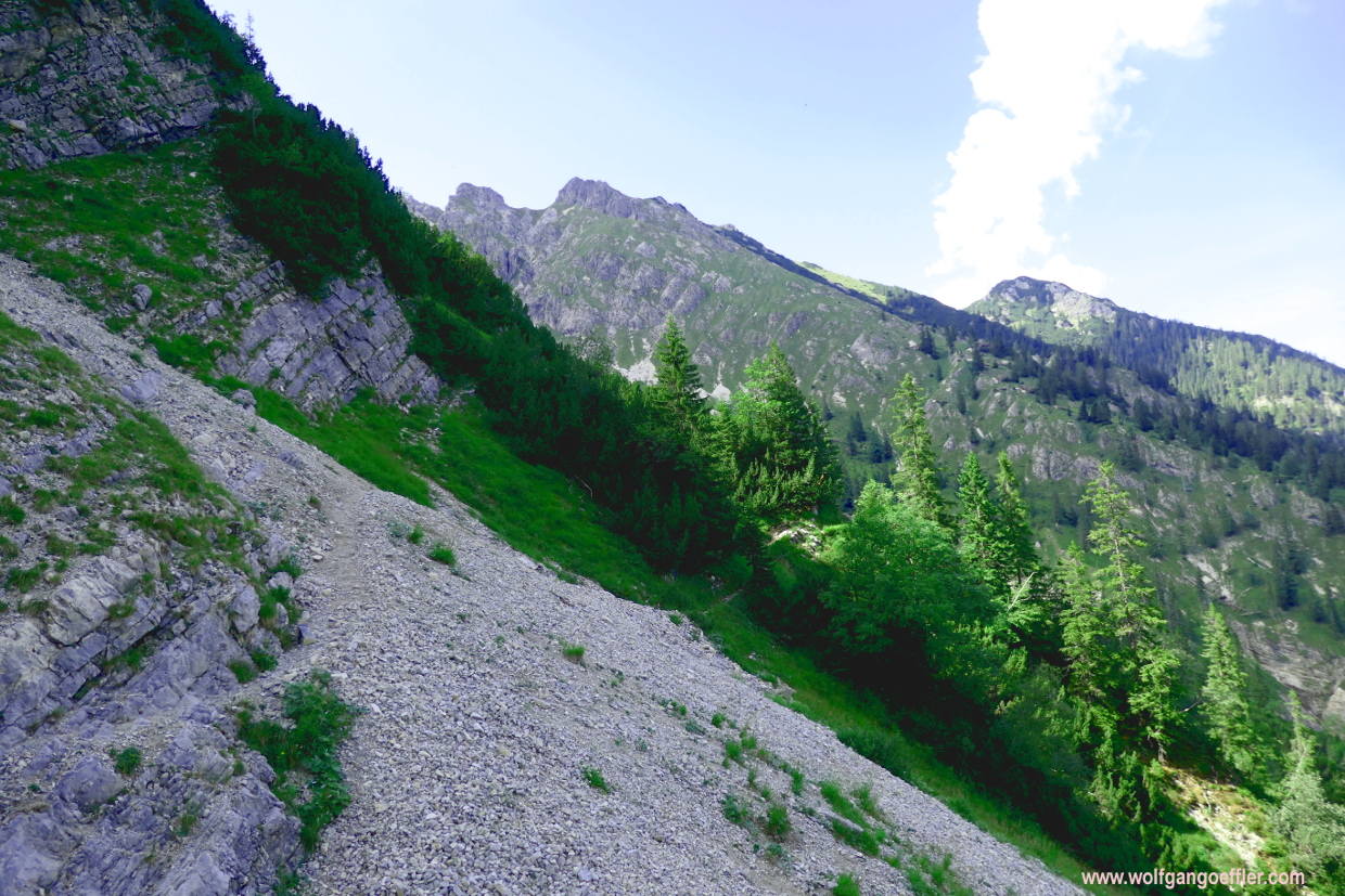 Das Rauschen des Wasserfalls folgt mir noch eine Weile. Jedes Mal, wenn ich mich umdrehe, sehe ich die Gumpenkar- und Soiernspitze vor mir. In Blickrichtung Norden kann ich ganz am Ende des Fischbachtals in der Ferne den Sylvensteinspeicher sehen. Der schmale Pfad führt ein bisschen unterhalb des Grates des Schöttelkars entlang. An manchen Stellen muss ich über Geröllfelder gehen, aber der Weg ist gut präpariert und diese sind einfach zu überqueren. Die meiste Zeit laufe ich nun im Schatten des Berges und finde das ganz angenehm. Für die Orte im Tal sind mal wieder 30 Grad angekündigt, aber hier ist es angenehm kühl.