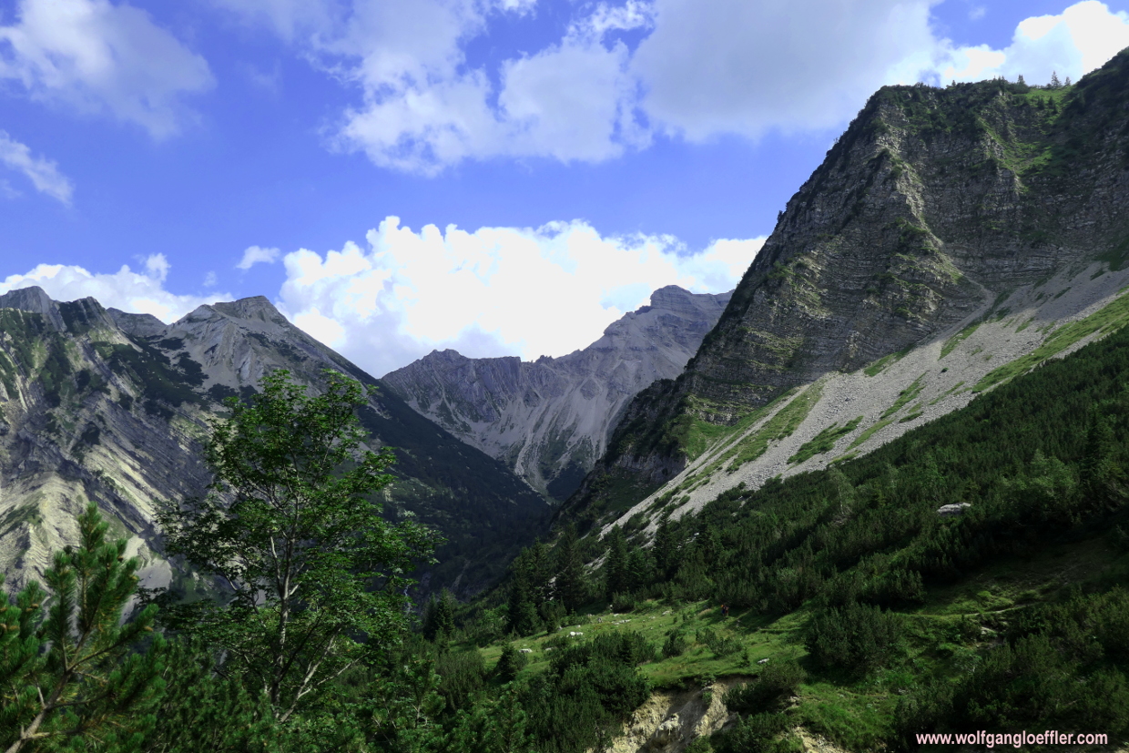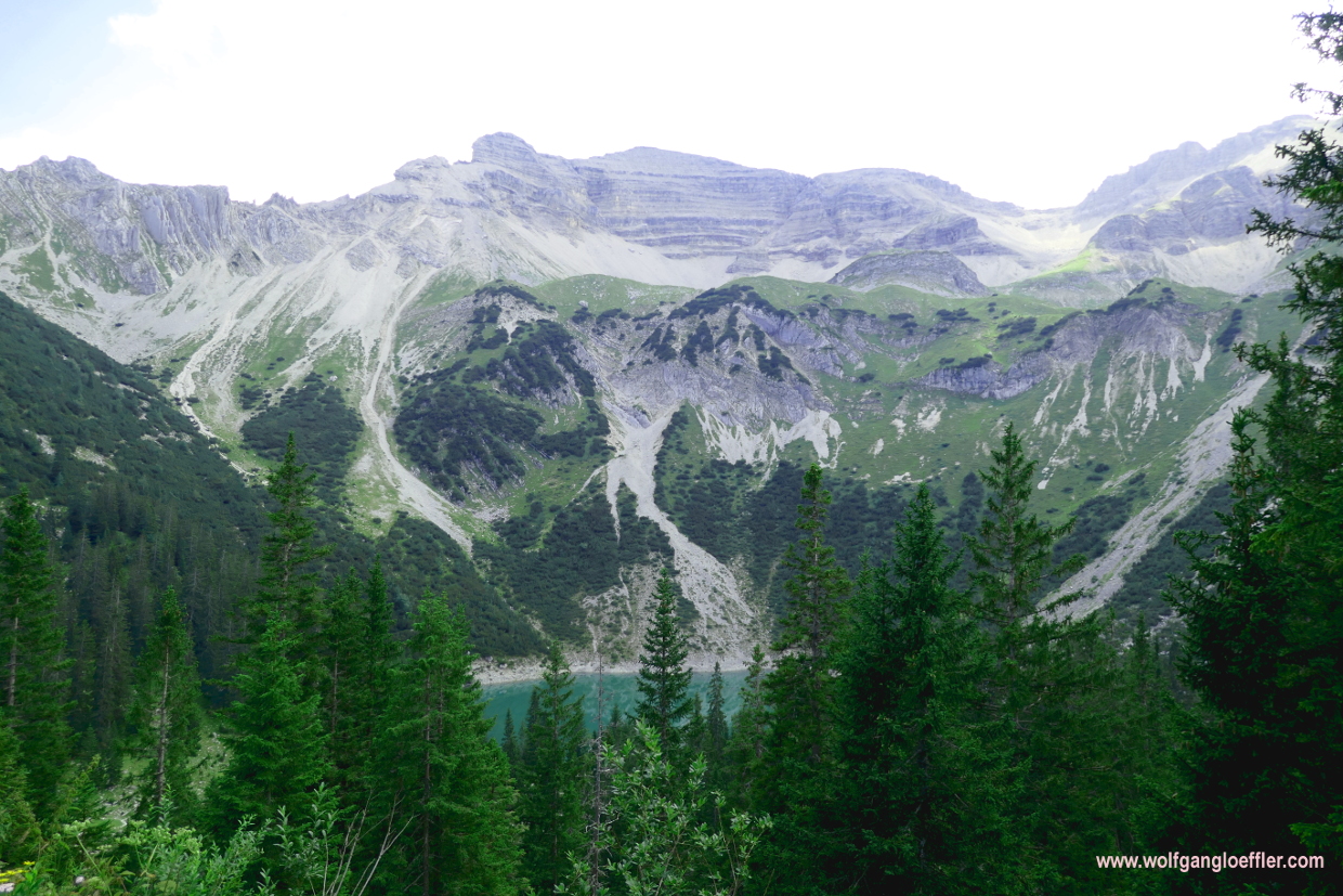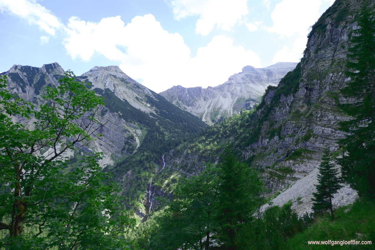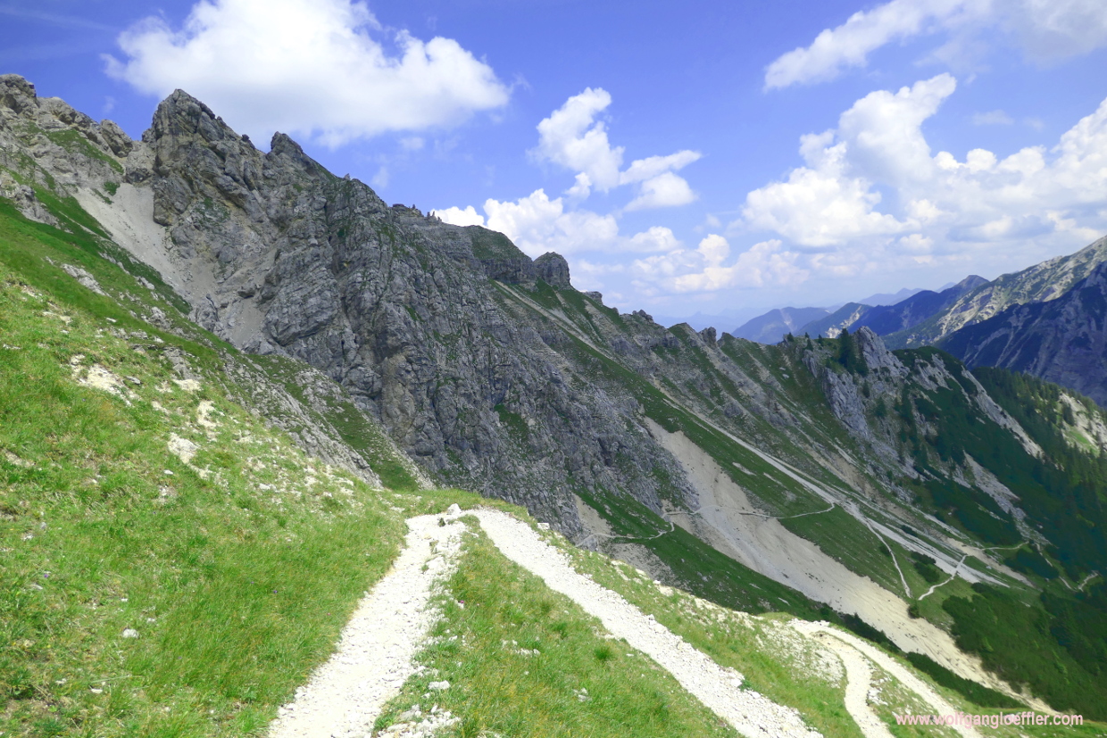 Das Rauschen des Wasserfalls folgt mir noch eine Weile. Jedes Mal, wenn ich mich umdrehe, sehe ich die Gumpenkar- und Soiernspitze vor mir. In Blickrichtung Norden kann ich ganz am Ende des Fischbachtals in der Ferne den Sylvensteinspeicher sehen. Der schmale Pfad führt ein bisschen unterhalb des Grates des Schöttelkars entlang. An manchen Stellen muss ich über Geröllfelder gehen, aber der Weg ist gut präpariert und diese sind einfach zu überqueren. Die meiste Zeit laufe ich nun im Schatten des Berges und finde das ganz angenehm. Für die Orte im Tal sind mal wieder 30 Grad angekündigt, aber hier ist es angenehm kühl.