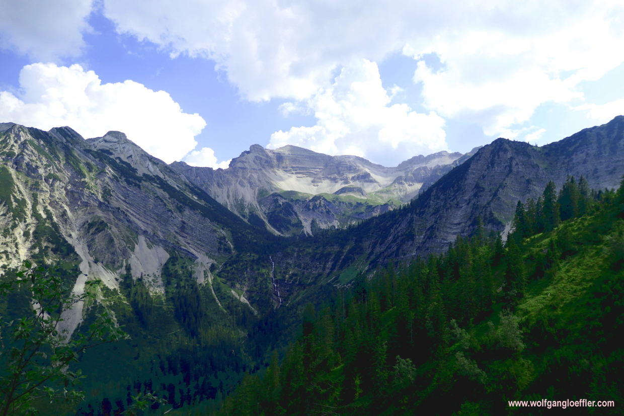 Und wenige Minuten später sehe ich dann den ersten Gipfel, den ich heute überqueren werde.Nach dem Schild am Felsenhüttl sind es aber noch rund 400 Höhenmeter bis ich das Etappenziel erreiche. Ein Stück weiter oben schaut es dann so aus, als ob ich gleich ein Plateau erreichen würde. Ein paar Meter auf ebener Strecke zu laufen, wär jetzt nicht schlecht. Aber als ich das vermeintliche Hochtal erreiche, bleibt mir erstmal die Spucke weg. Zum einen, weil sich direkt vor mir ein Abgrund auftut und zum Zweiten, weil ich den ersten Blick auf die Schöttelkarspitze habe.