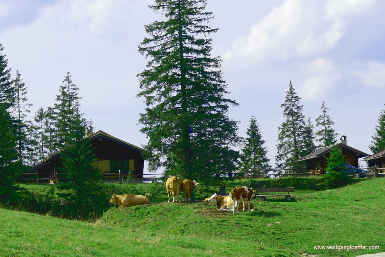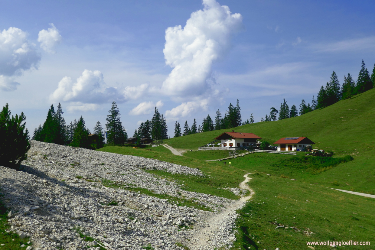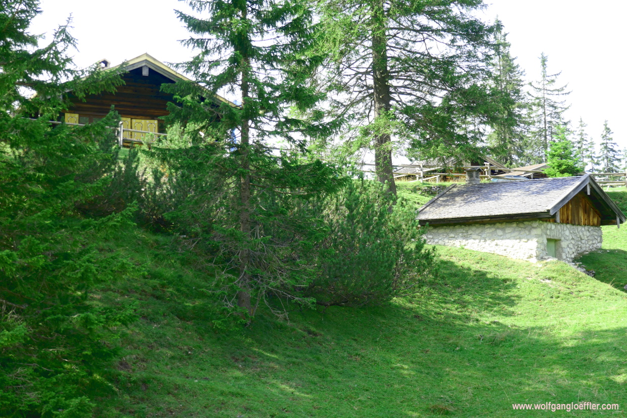 So stehe ich nun vor der nächsten Hütte. Es ist schon später Nachmittag und ich habe noch etwa 1,5 Stunden Abstieg vor mir bevor ich wieder an mein Auto komme, aber ich entscheide mich dennoch für eine kurze Rast und eine Erfrischung an der Fischbachalm. Heute muss ich ja nicht auf irgendwelche Bus- oder Zugabfahrtszeiten achten. Also setze ich mich an einen Tisch mit Blick auf die Gumpenkarspitze. Einfach gigantisch! Am Eingang zur Hütte sehe ich, dass die hier auch hausgemachte Waren anbieten. Die schmecken sicher sehr gut. Aber heute habe ich keine Lust mehr mir meinen Rucksack nochmal schwerer zu machen.