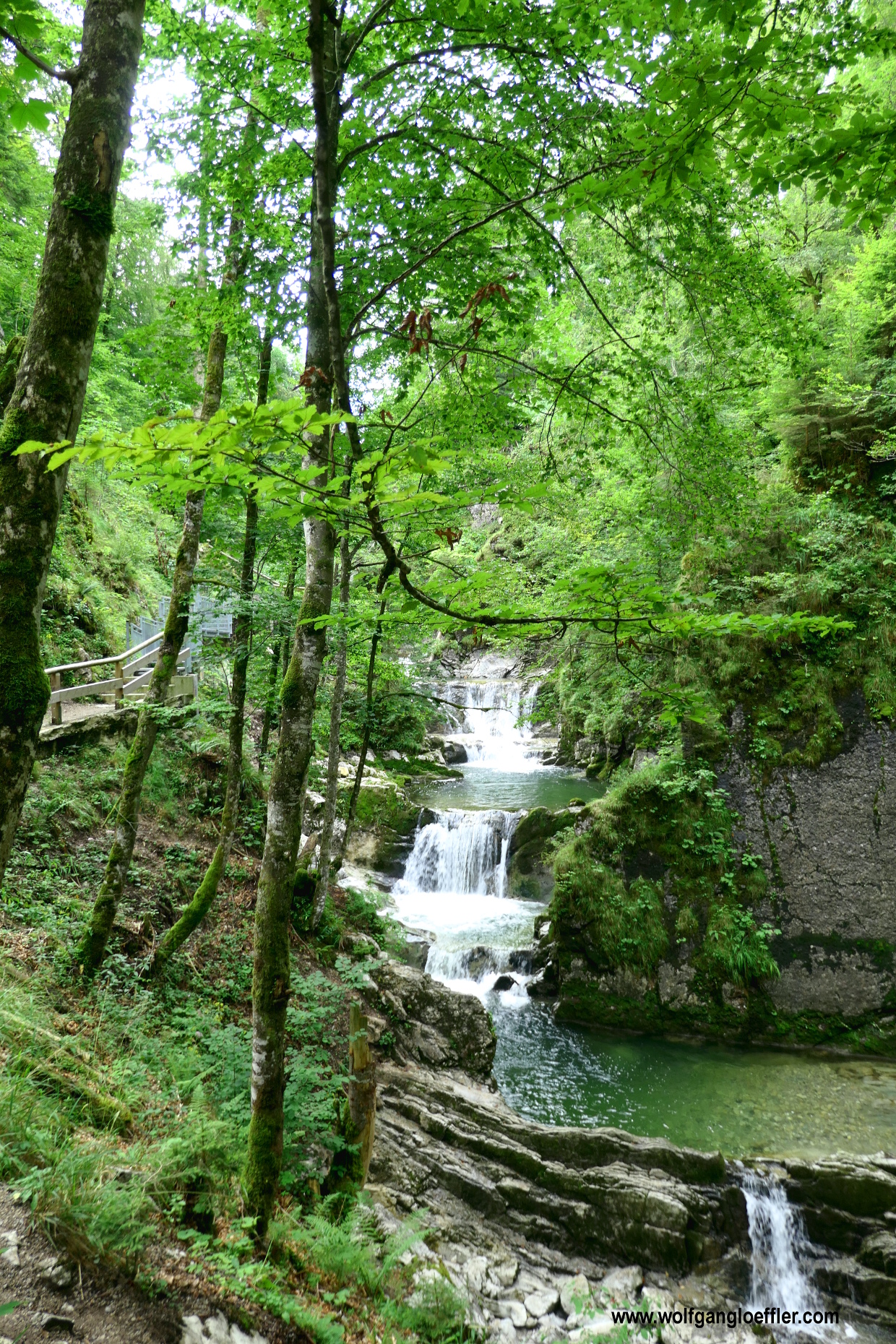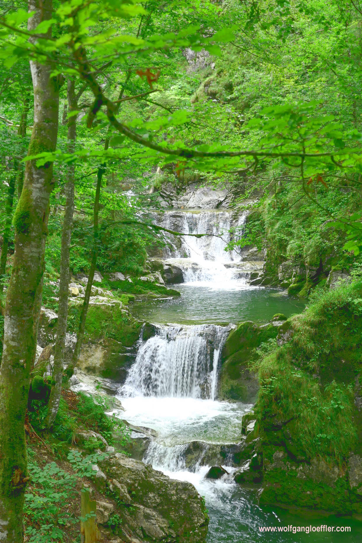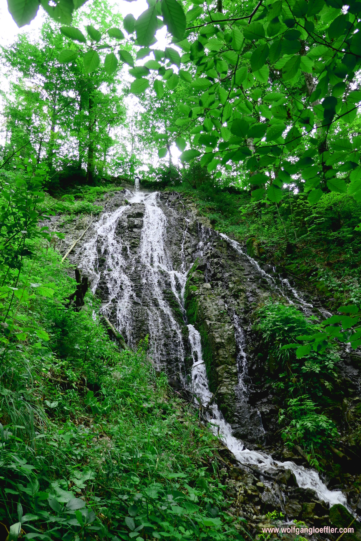 And sure enough I am greeted by a loud roaring. A staircase that is made of wooden steps leads me into a small gorge. To my left the first fall rustles down to the valley floor. Just a few minutes later I see the cascades of the big fall. What a beautiful place. So peaceful. I can imagine that these falls are a popular stop for sightseeing and guess that later in the day there will be more people around.