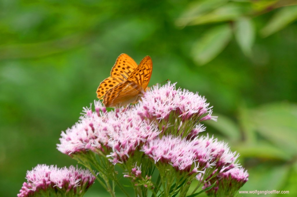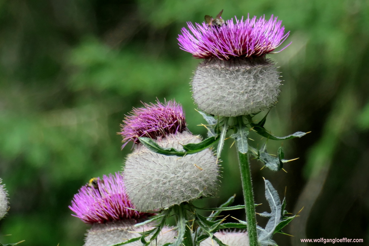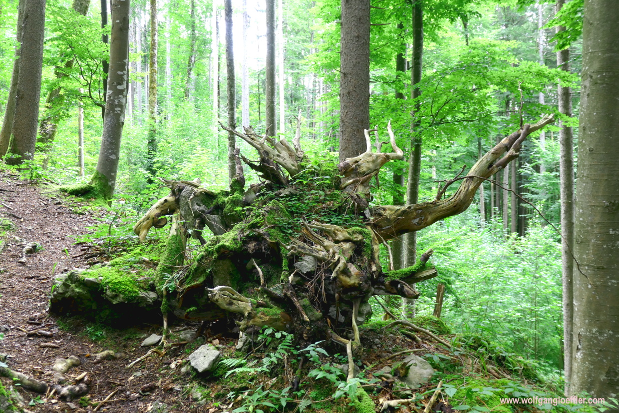 The path leads comfortably uphill. to the left and the right there are quite some things to see. Like that big mossy root of a fallen tree. It is always fascinating to see that things that are dying in the woods always form the base for new life. From time to time I pass flowers still in bloom. They are hard-fought by butterflies and other insects. Every once in a while the forest is opening up and grants views of the mountains on the opposite side of the valley.