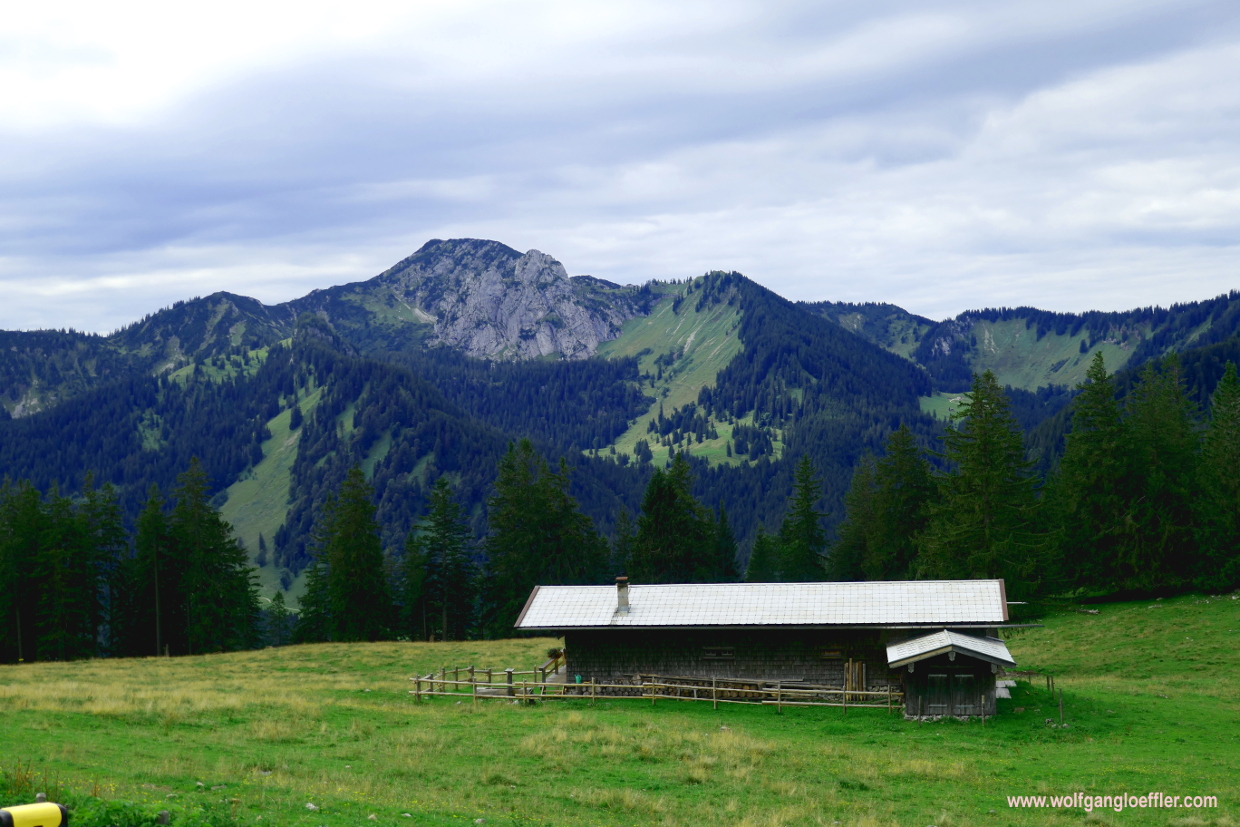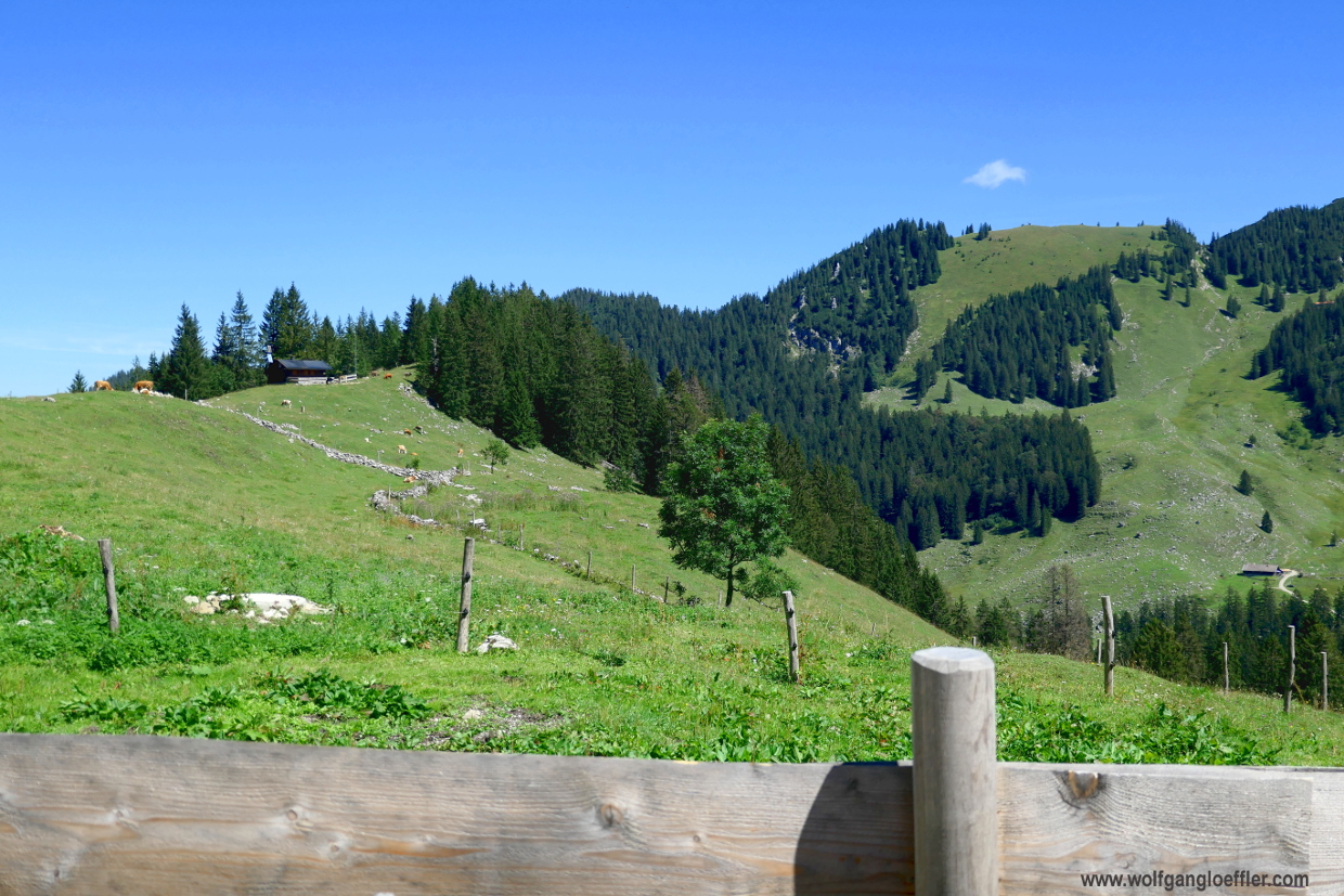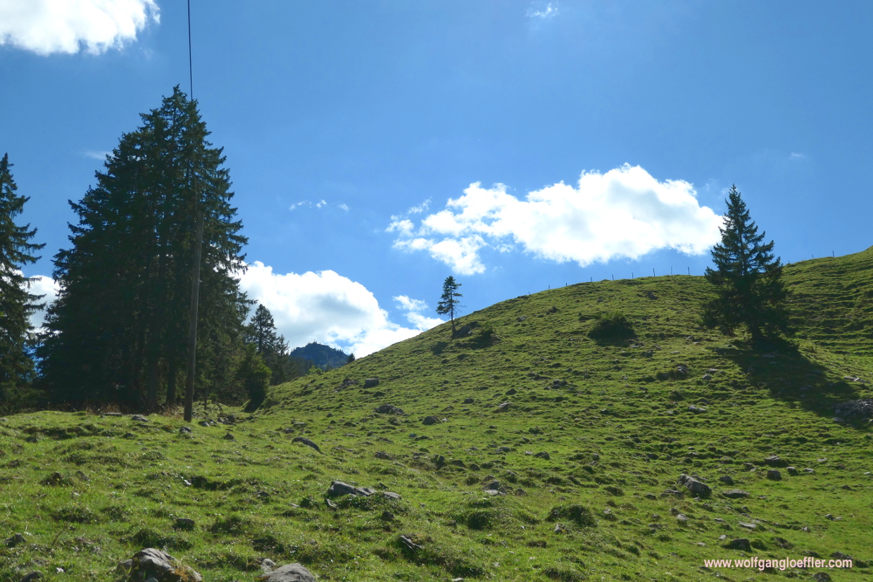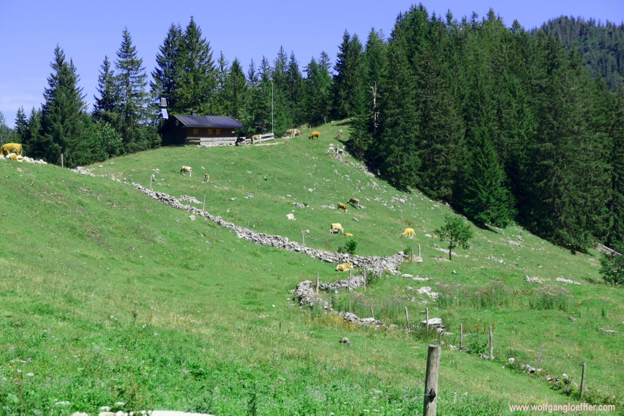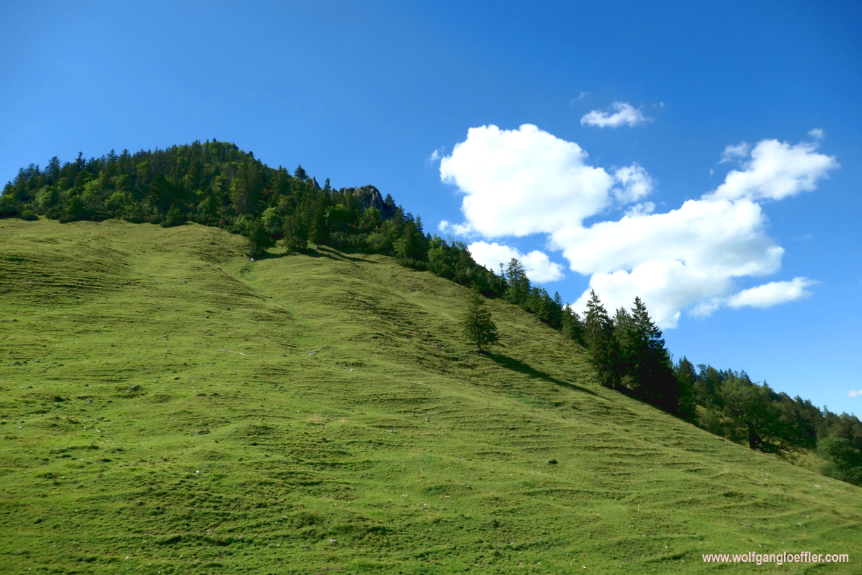 When a few minutes later I am getting out of the woods and look at the Bodenalp the sky is again typical Bavarian – blue and white. A few cabins are sitting here at the bottom of the summit that is slowly rising behind them more like a rolling hill. That’s a perfect spot for a rest. I am a bit surprised that I don’t see any cattle around. I will see them later. They have decided to climb the peak as well today.