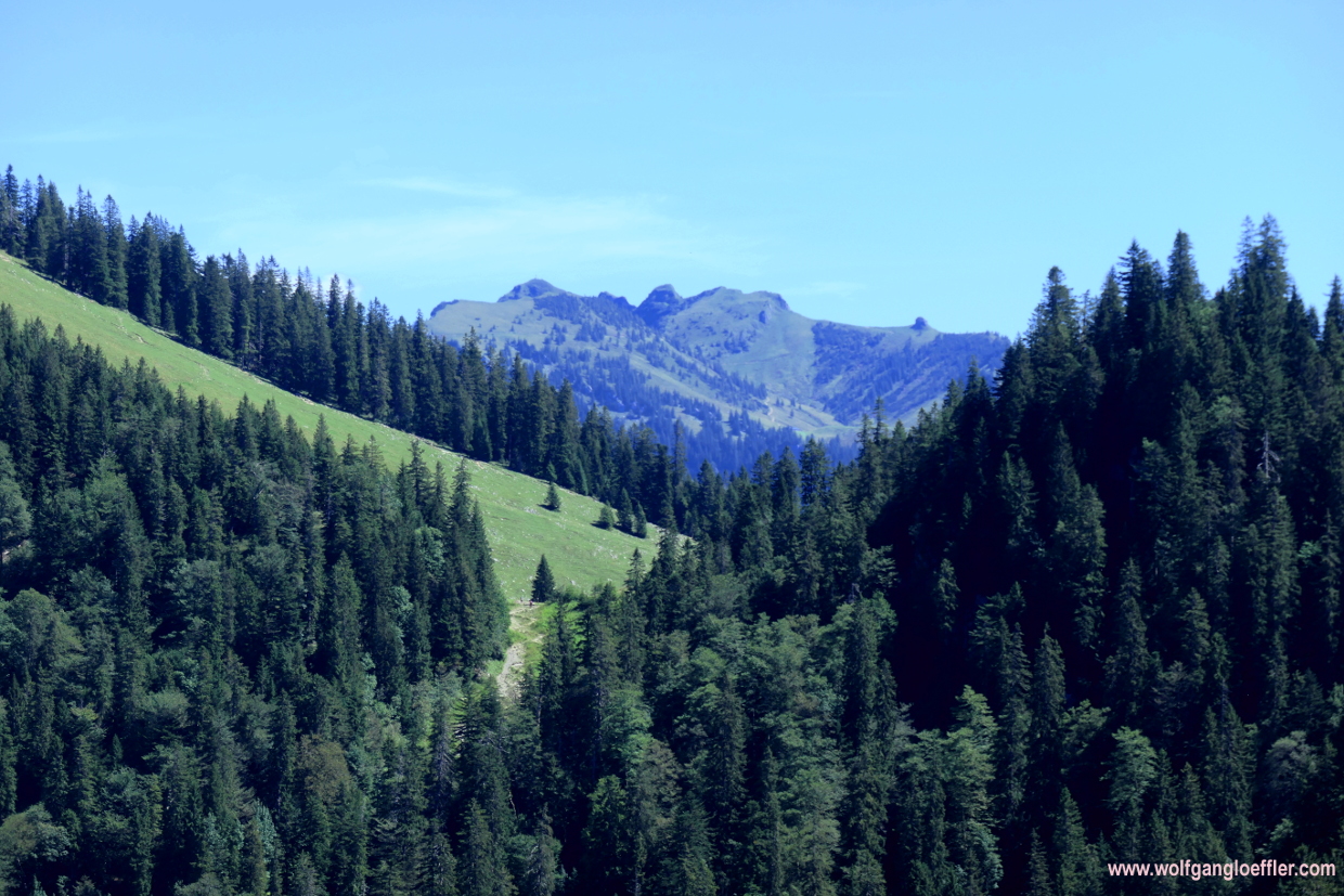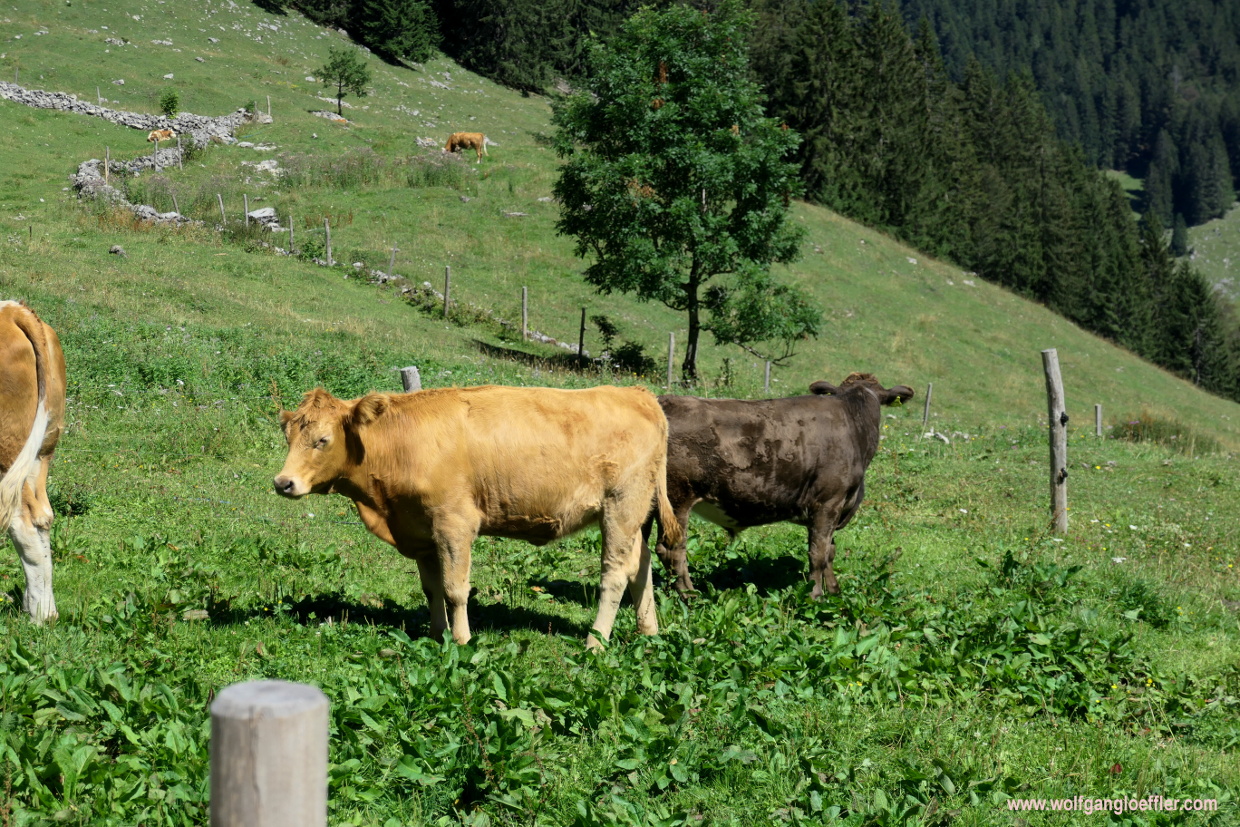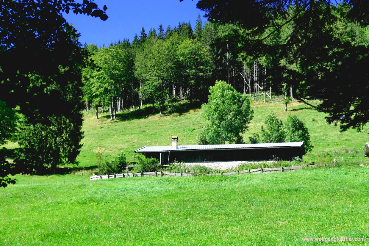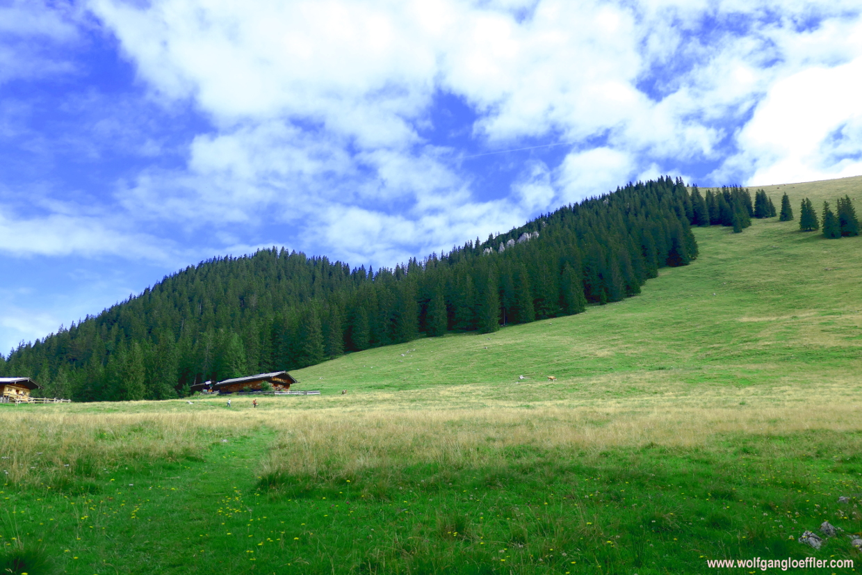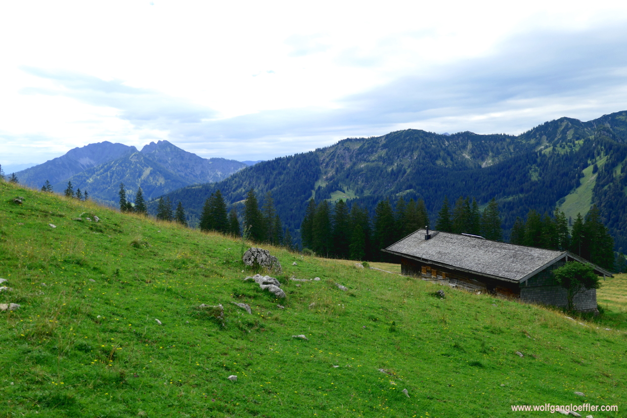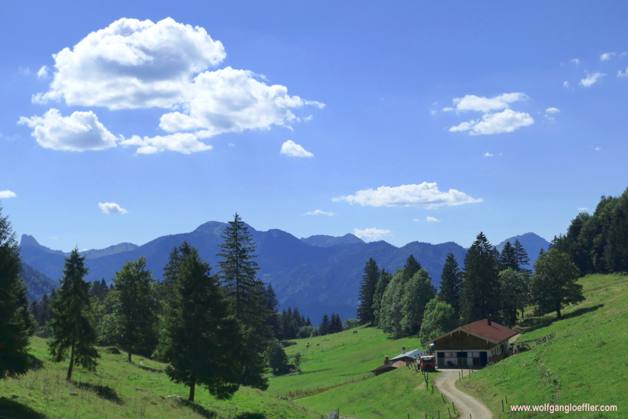When a few minutes later I am getting out of the woods and look at the Bodenalp the sky is again typical Bavarian – blue and white. A few cabins are sitting here at the bottom of the summit that is slowly rising behind them more like a rolling hill. That’s a perfect spot for a rest. I am a bit surprised that I don’t see any cattle around. I will see them later. They have decided to climb the peak as well today.