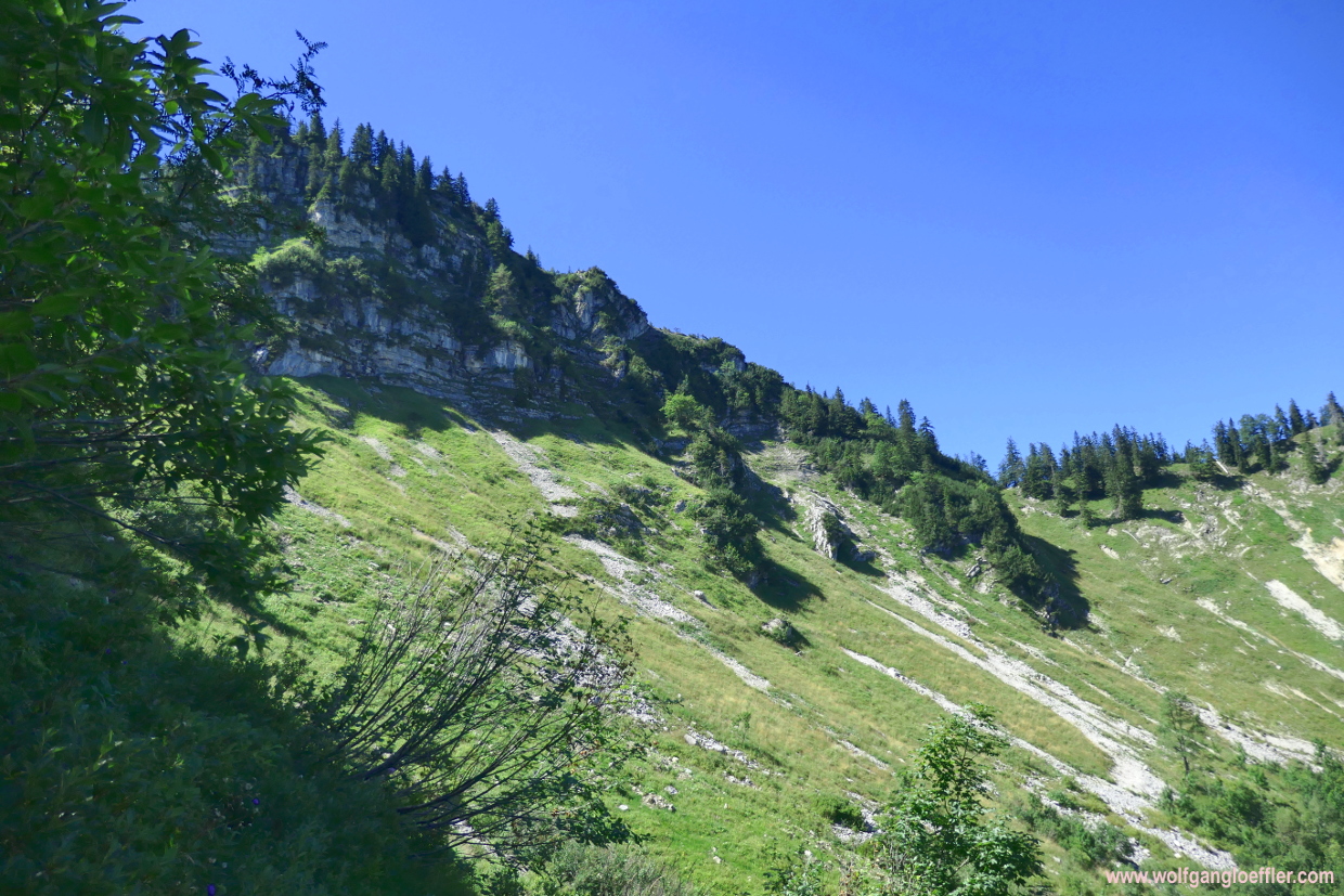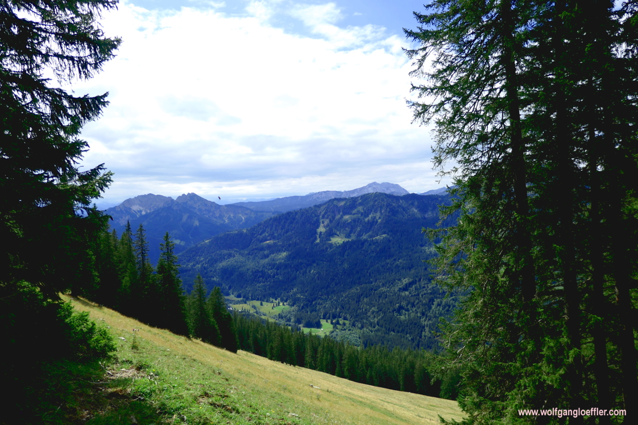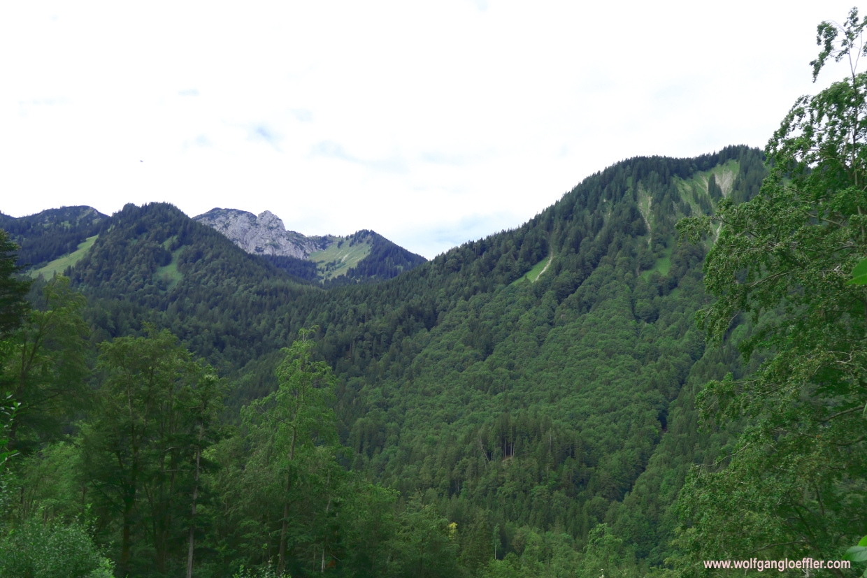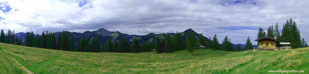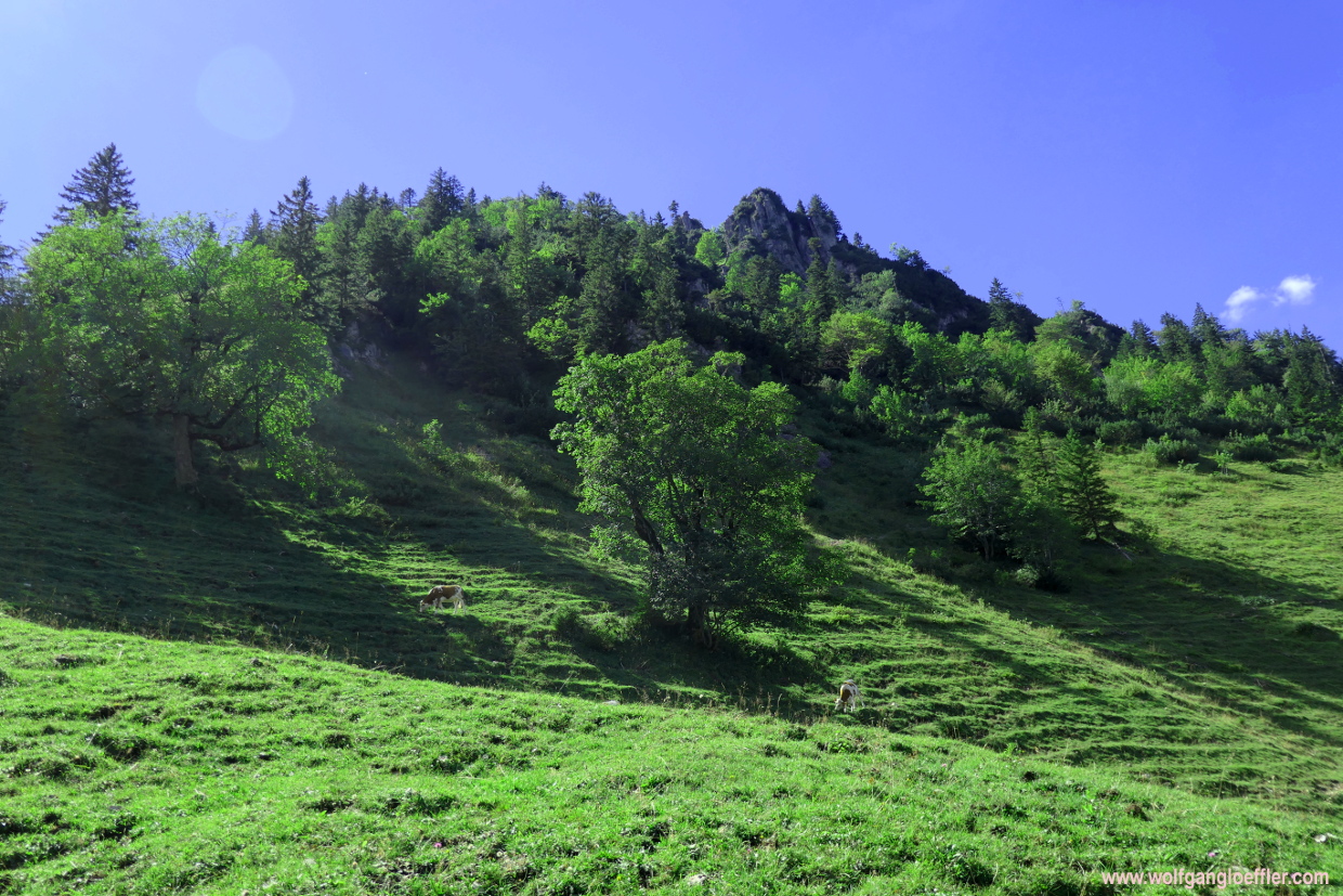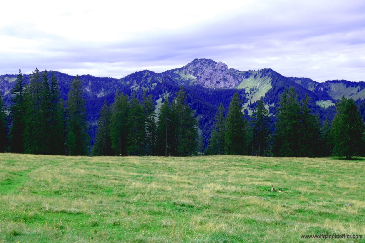 When a few minutes later I am getting out of the woods and look at the Bodenalp the sky is again typical Bavarian – blue and white. A few cabins are sitting here at the bottom of the summit that is slowly rising behind them more like a rolling hill. That’s a perfect spot for a rest. I am a bit surprised that I don’t see any cattle around. I will see them later. They have decided to climb the peak as well today.