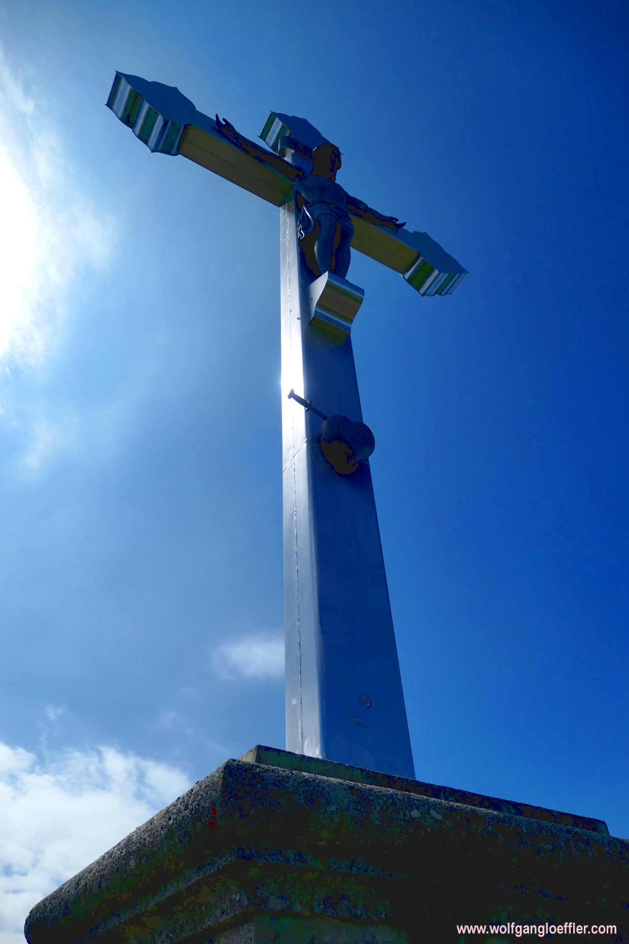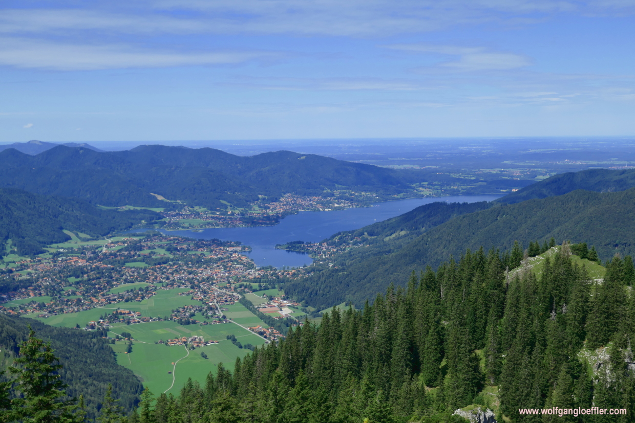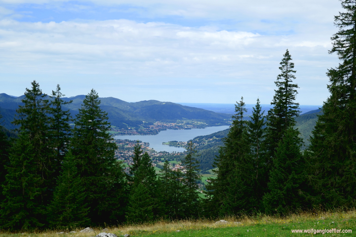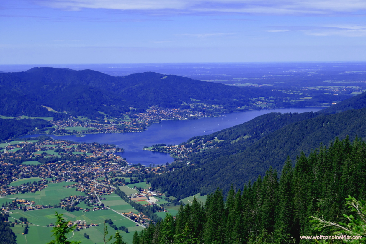 Slowly I am getting closer to the top. In my back the Wallberg is rising above the woods. Right above me I can see the summit cross in the now blue sky. I love the fact that the clouds have gone. But the view is rather hazy and so the peaks in the south are hiding in the mist. But the view over the Tegernsee lake is really fantastic.